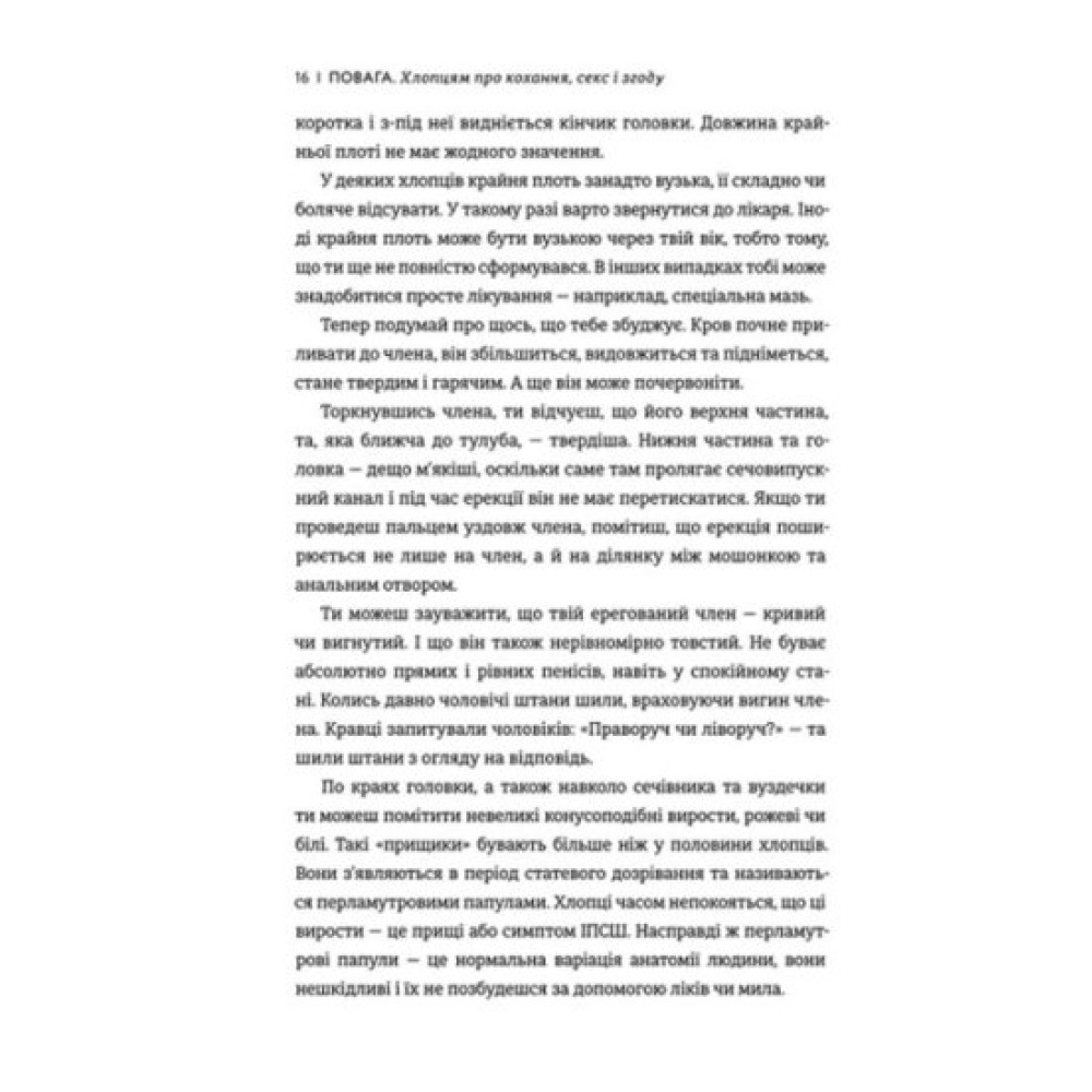 Підлітковий вік для хлопців це ще той виклик. Час важливих змін і багатьох запитань, з якими незручно звернутись до батьків чи вчителів. Що відбувається з моїм тілом? Чи мій член нормальний? Як сподобатись дівчині? Чому мені не подобаються дівчата? Що робити під час першого сексу? Цей посібник з сексуальної освіти для хлопців-підлітків про те, як підходити до розуміння сексу та стосунків у 21 столітті. Інті Чавес-Перес, який є експертом з сексуального виховання та має багаторічний досвід роботи з підлітками, дає відповіді на ті численні питання про секс, які виникають у хлопців. Автор простою мовою пояснює важливі аспекти про згоду і стосунки, про тілесність, гендерну ідентичність та сексуальну орієнтацію і уникає при цьому будь-якого осуду. Переклад та публікацію цієї книги підтримує Європейський Союз за програмою Дім Європи. Ця книжка написана насамперед для хлопців-підлітків. Підлітковий вік – тривалий період, упродовж якого відбувається багато змін. Саме тому я звертаюся як до тебе, хто ще ніколи не цілувався, так і до тебе, хто вже розпочав сексуальне життя. Нехай щастить у коханні та сексі!, – Інті.