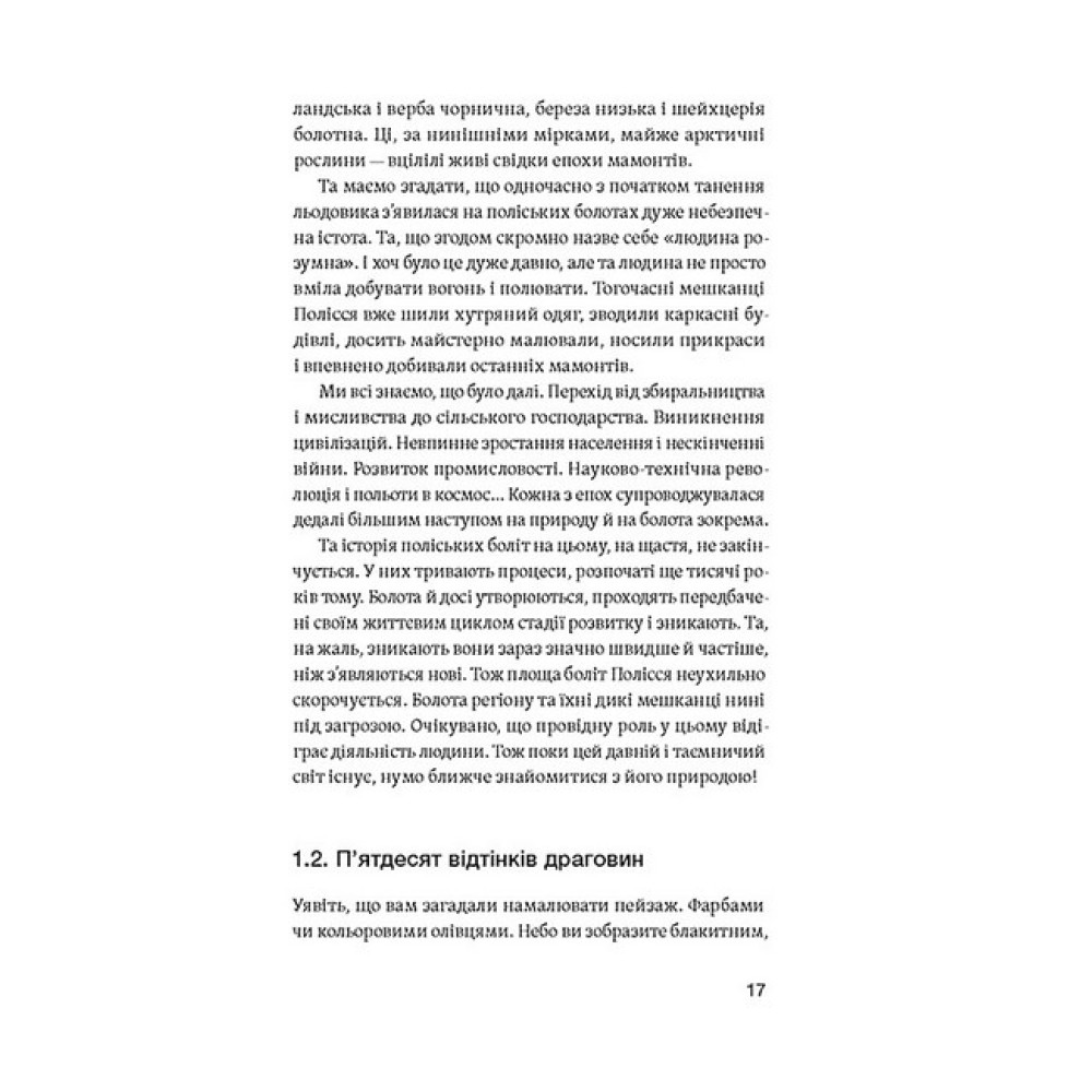 Болота Полісся вражають. Безкрайні драговини й непролазні хащі, недоступні для людей та сповнені численних таємниць. Тисячолітні торфовища зберігають рештки давніх істот. Тут квітнуть рослини-хижаки й рідкісні орхідеї, рододендрони та верес. Одвічні володіння бобра, лося й сірого журавля. І, звісно ж, неймовірний світ традиційних поліських промислів: збір ягід, вилов в’юнів, лозоплетіння, архаїчне бджільництво-бортництво — про все це розповість досвідчений гід у дику природу Андрій Сагайдак.Автор поділиться інформацією, що стане в пригоді туристам: від календаря природи і правил безпеки до секретів виживання — як на болоті добути питну воду та знайти їжу, як розкласти багаття серед драговин чи вибратися самотужки із трясовини.Ця книжка — чудова можливість дізнатися більше про дику природу Українського Полісся. Андрій Сагайдак — гід у дику природу, лісівник, засновник Природничого центру «Міжрічинська Пуща». Раніше очолював Регіональний ландшафтний парк «Міжрічинський», працював на посаді старшого викладача кафедри екології Національного університету «Києво-Могилянська академія».