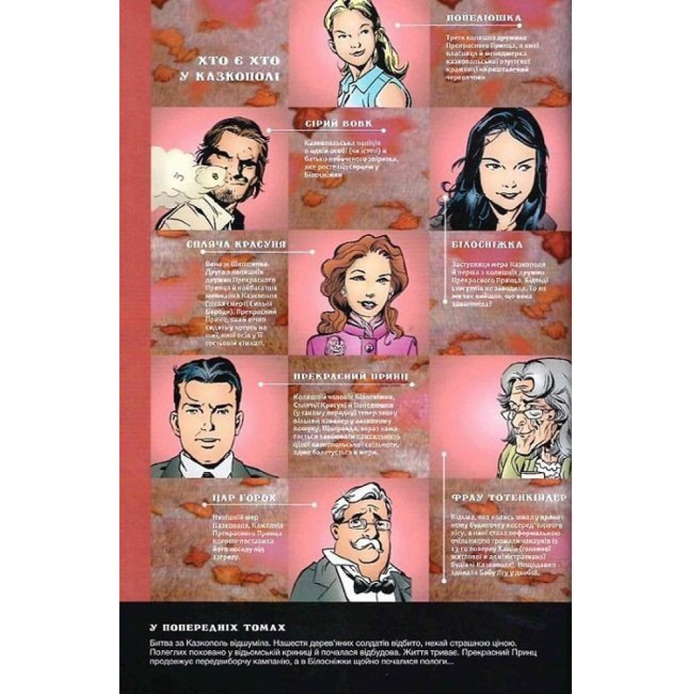 Наші герої здобули перемогу в Битві за Казкополь, а прозаїчний Нью-Йорк нічого навіть не помітив. І доки казки виграли трохи часу на відбудову й роздуми, допити шпигунки Ворога тривають, а Білосніжка готується стати матір’ю. Значить, Сіркові, майбутньому батьку Сніжчиних малят, час навідати старого друга і згадати іншу, ще смертоноснішу війну. Мерові Казкополя час нарешті зірвати пелену з очей і визнати, яка то непроста робота — керувати громадою із суперечливими потребами. А самій Сніжці час готуватися до довгих і важких пологів — і до відкриттів, радісних і не дуже.
