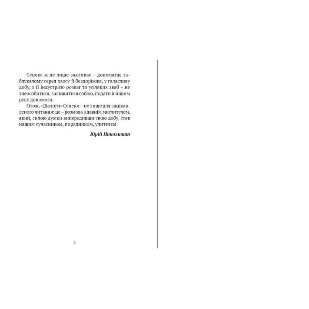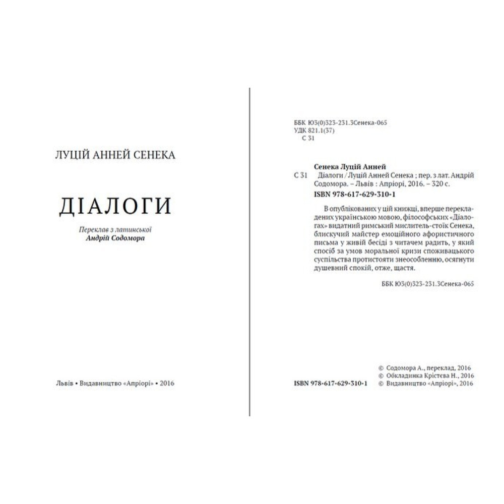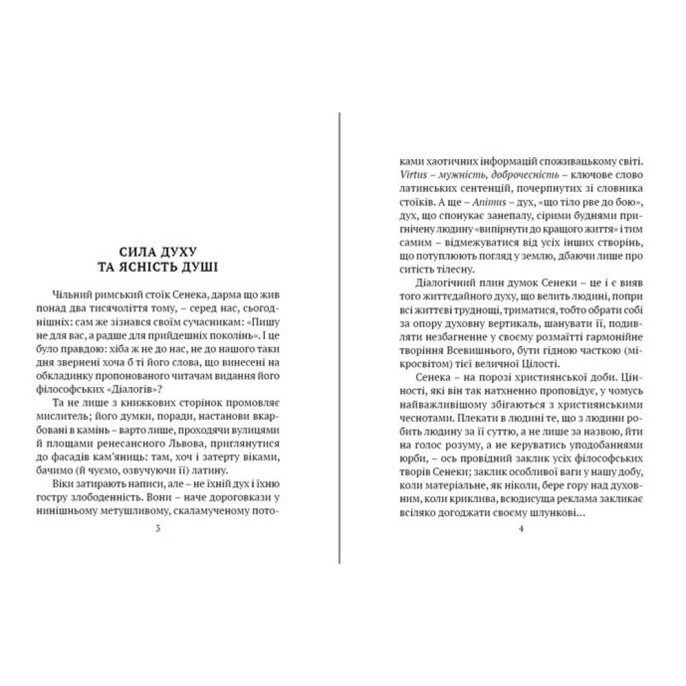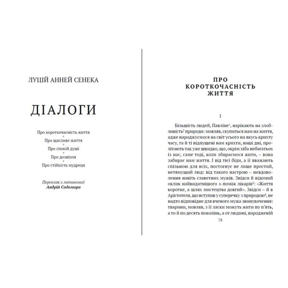В опублікованих у цій книжці, вперше перекладених українською мовою, філософських "Діалогах" видатний римський мислитель-стоїк Сенека, блискучий майстер емоційного афористичного письма у живій бесіді з читачем радить, у який спосіб за умов моральної кризи споживацького суспільства протистояти знеособленню, осягнути душевний спокій, отже, щастя.