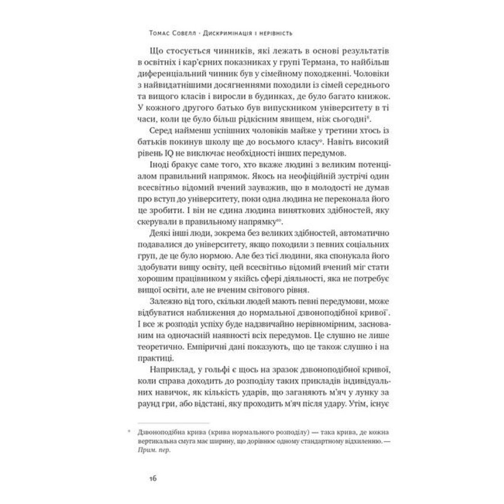 Чому жінки представлені у Кремнієвій долині менше, ніж чоловіки? Чому в темношкірих і латиноамериканських школярів, які гарно вчаться, менше друзів серед своєї етнічної групи, ніж у школярів з інших груп? І, зрештою, чи не варто державі скоригувати всю цю нерівність та «непропорційне представництво», які вочевидь є проявом дискримінації, расизму і сексизму? На думку автора, перед тим, як відповідати на ці питання, варто вивчити емпіричні факти і позбутися ідеологічних догм. У книзі зібрано широкий спектр емпіричних доказів, щоб заперечити ідею про те, що різні економічні результати можна пояснити будь-яким одним фактором. У цьому виданні аналізуються людські наслідки переважаючого соціального бачення цих невідповідностей і політики, заснованої на цьому баченні. Враховуючи популярність в Україні ідеї «халяви», яку держава має роздати нужденним, покаравши успішних, читання Совелла видається вкрай необхідним.ДЛЯ КОГО ВИДАННЯ "ДИСКРИМІНАЦІЯ І НЕРІВНІСТЬ" Для усіх, хто хоче розібратися в основних соціальних питаннях. Видання зацікавить тих, хто хоче зрозуміти, що зумовлює економічну та соціальну нерівність між різними групами. ПРО АВТОРА Томас Совелл — старший науковий співробітник Гуверівського інституту Стенфордського університету. Він є автором десятків книг, лауреат багатьох інших нагород, у тому числі Національної гуманітарної медалі, врученої Президентом Сполучених Штатів у 2003 році.