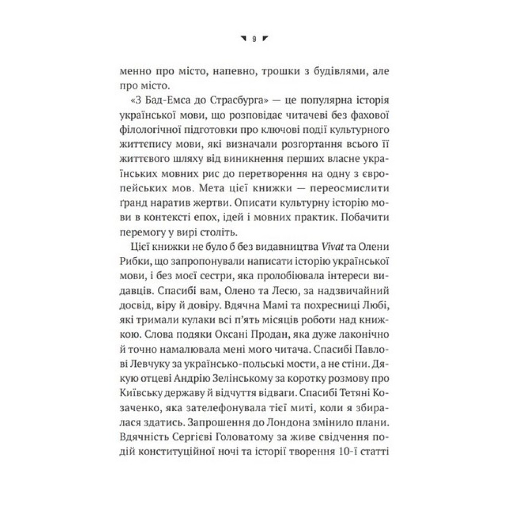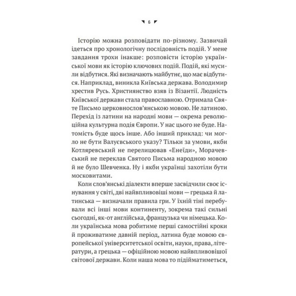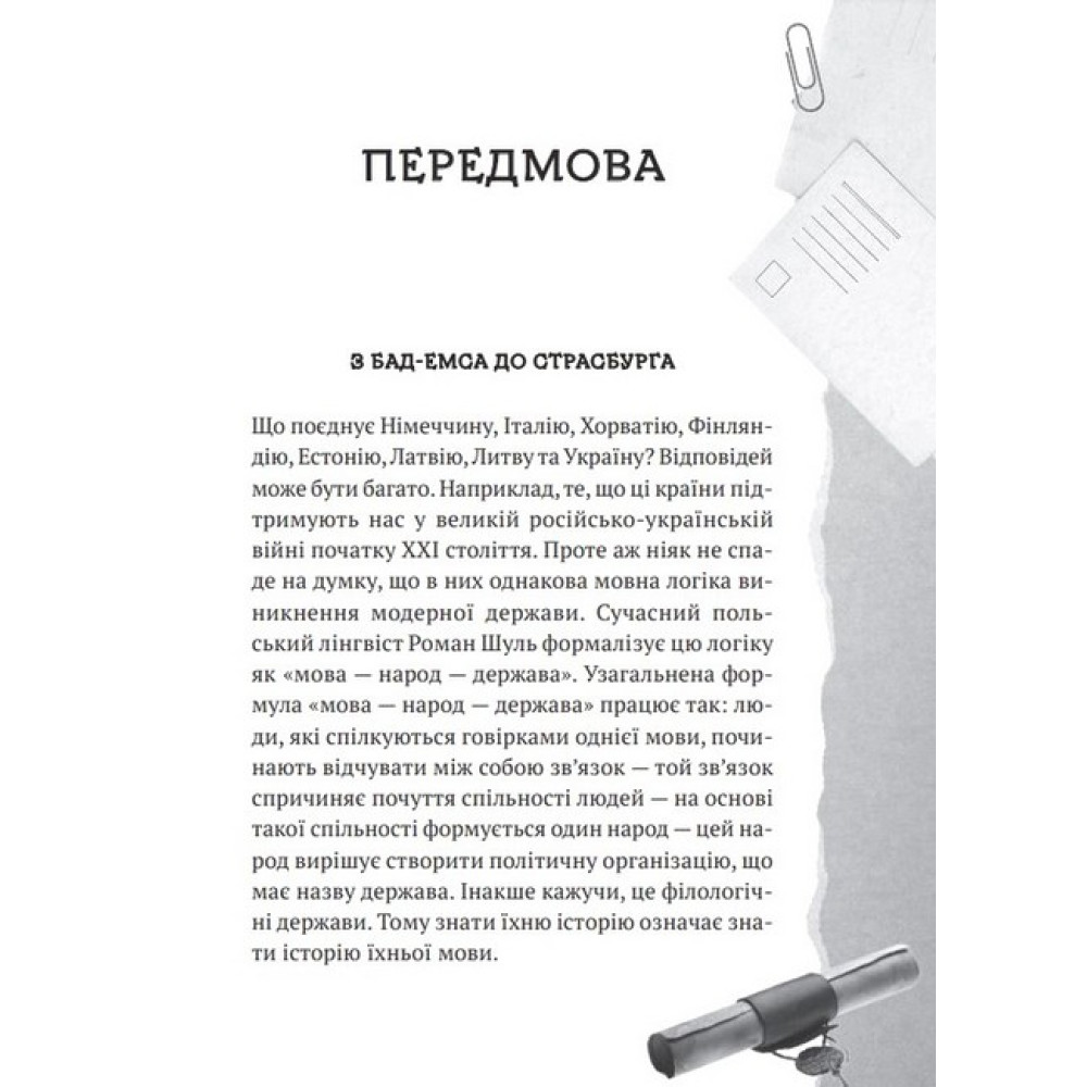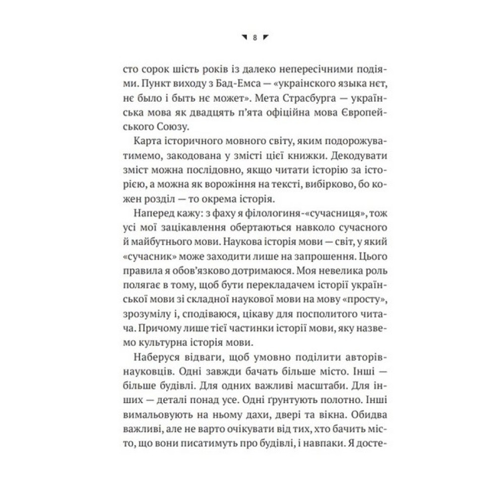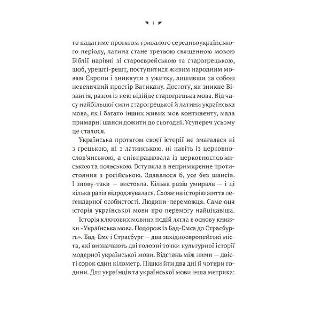 На культурній мапі модерної української мови є дві важливі точки: Бад-Емс, звідки указом намагались переконати світ, що української мови немає, не було і бути не може, і Страсбург — точка, де 21 березня 2022 року українська отримала статус майбутньої офіційної мови Європейського Союзу. Орися Демська розповідає про зародження й розвиток української мови від індоєвропейської прамови до наших днів, її взаємодію з іншими мовами, історію взаємозбагачень, непримириме протистояння з російською і перебіг лінгвоцидів, із яких вона все ж таки вийшла переможницею. Доступно про формування української державності і національної ідентичності через мову і завдяки мові. Чому варто прочитати? • Щоб раз і назавжди розставити точки над «Ї» у своїх роздумах щодо мовного питання. А це зараз потрібно чи не кожному українцеві й українці. Видання зможе пролити світло на деякі болючі моменти, які стосуються розвитку та становлення української мови, і таким чином позбавити людей комплексу меншовартості. • Драматична історія буває не лише в людей, а й у мов. Дізнайтеся, як боролися за виживання українська мова та її носії протягом століть — ця книжка складе вам компанію і стане чудовим путівником у хроніку її буремного шляху.Про авторку Орися Демська — українська лінгвістка, докторка філологічних наук, професорка. Викладала в Дрогобицькому, Львівському, Вроцлавському, Варшавському, Ягелонському (Краків), Ґіссенському (Німеччина) університетах, Києво-Могилянській академії. Організаторка і перша голова Національної комісії зі стандартів державної мови. Професорка Національної академії СБУ. Великий Учитель Української академії лідерства. Входить до складу Комісії з питань найменувань КМДА.