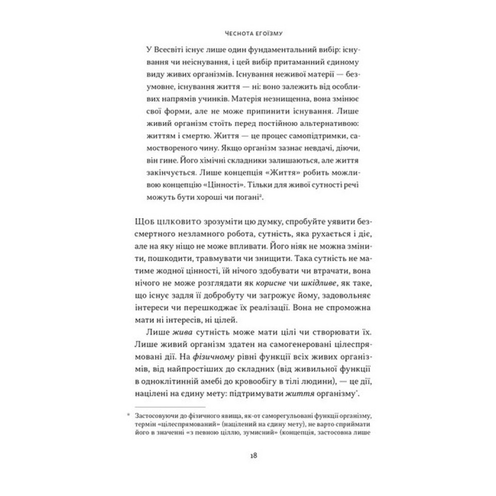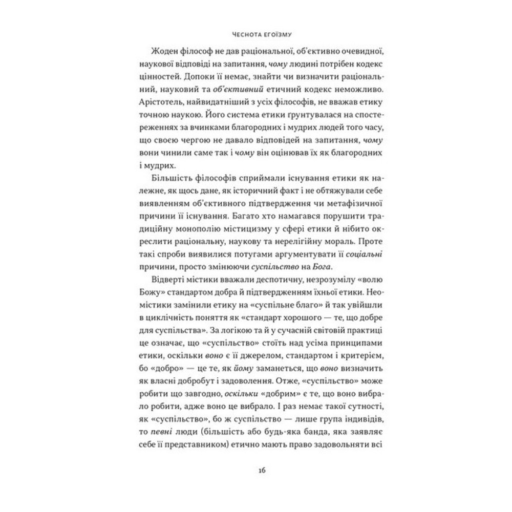 Егоїзм — це чеснота? Айн Ренд свідомо пішла на таку провокацію в назві, щоб подолати багатовікову демонізацію терміна. В її трактуванні егоїзм — не синонім зла і стратегії «йти по головах», а турбота про власні інтереси.Цю збірку з дев’ятнадцяти есеїв Ренд написала разом із дослідником психології самооцінки Натаніелем Бренденом. Автори розглядають суперечливі етичні теми, торкаються проблем об’єктивізму, культу моральної сірості, расизму тощо.Критикуючи альтруїстичне мислення, Айн Ренд пропонує концепцію раціонального егоїзму, що допомагає розвивати індивідуальність. Людина має право забезпечувати власне виживання, шукати щастя й отримувати користь від результатів своєї діяльності. Без необхідності жертвувати цими принципами проти своєї волі.Айн Ренд — американська письменниця, сценаристка, авторка світового бестселера «Атлант розправив плечі», основоположниця об’єктивізму. Народилася в Санкт-Петербурзі в єврейській родині, яка після революції 1917 року переїхала до Криму. Свої перші сценарії Ренд почала писати у вісім років, пригодницьку прозу — в десять. 1926-го авторка емігрувала до Америки, де працювала помічницею режисера в Голлівуді. Пізніше переїхала до Нью-Йорка, щоб цілком присвятити себе філософії та літературній творчості.