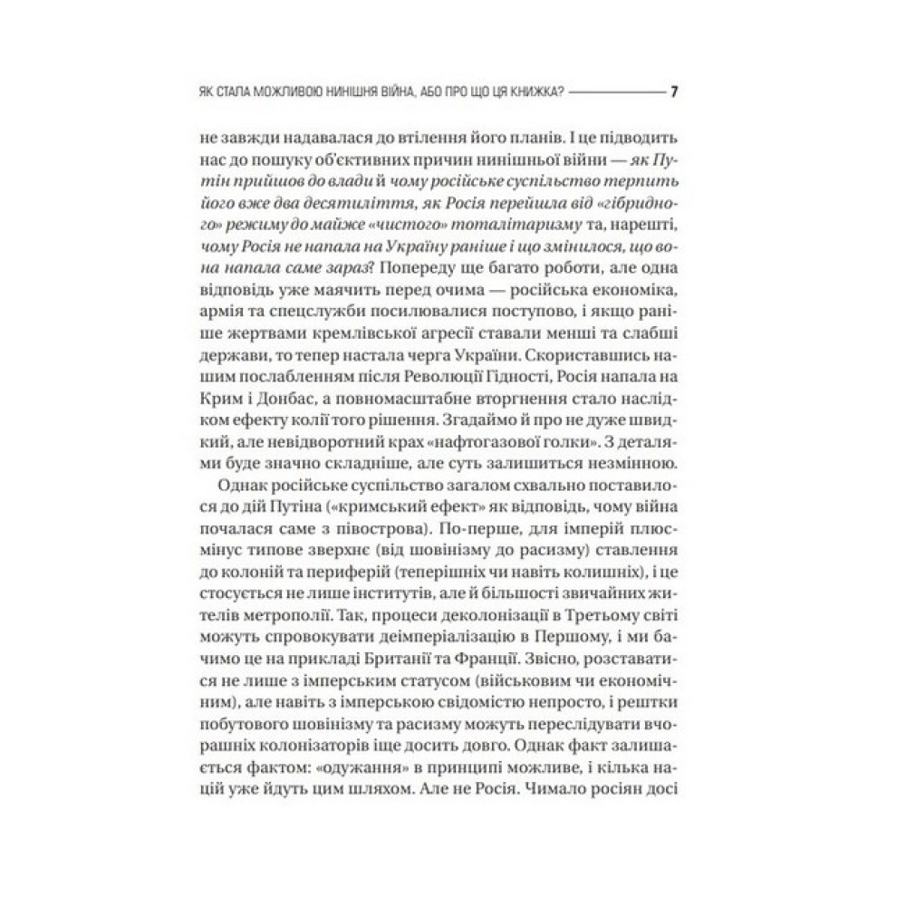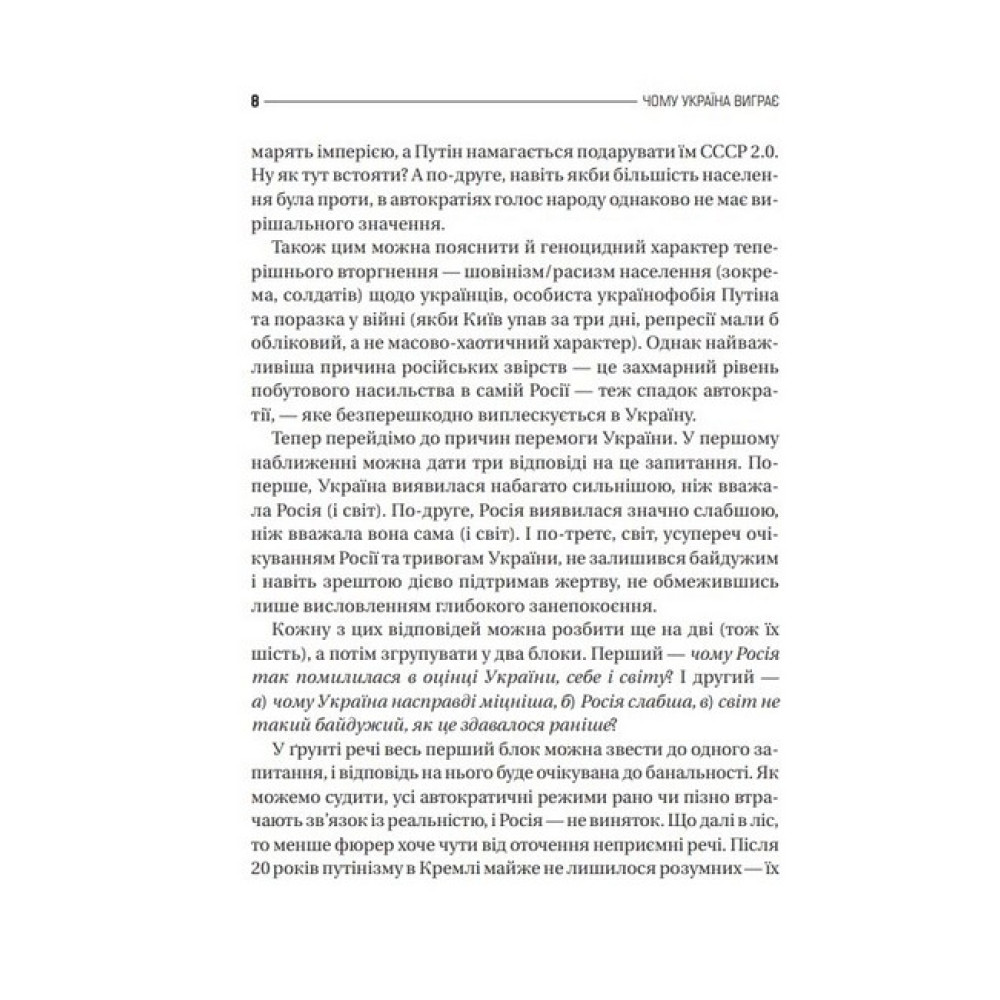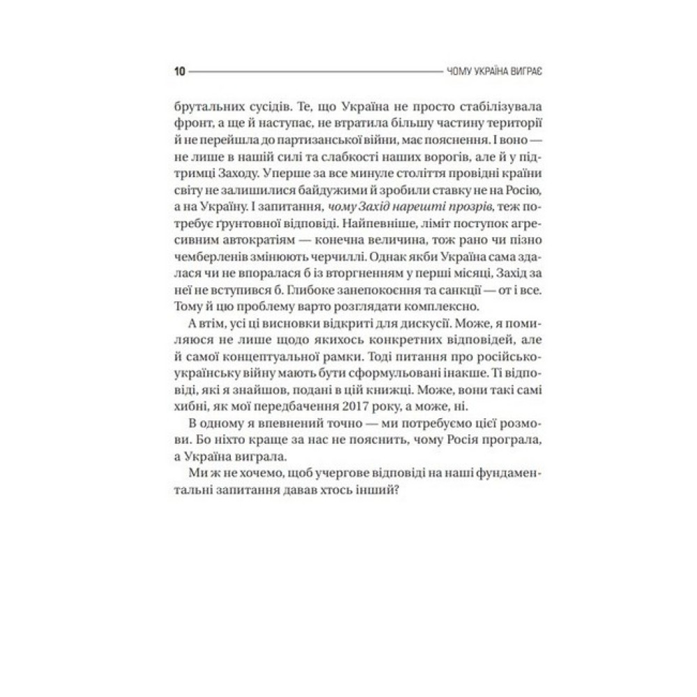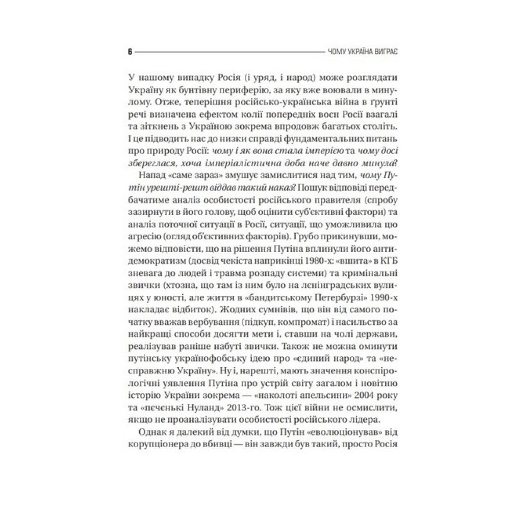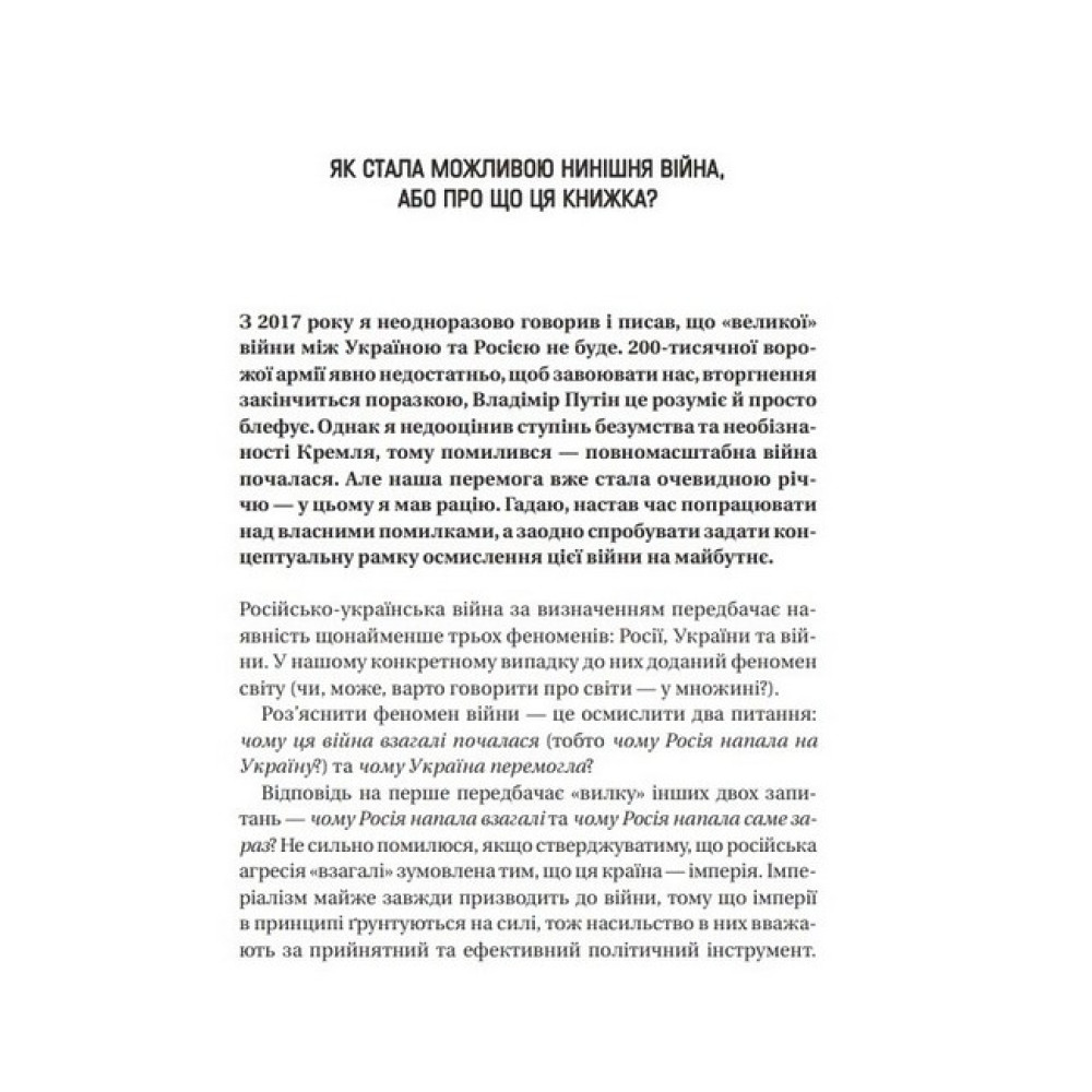 Росія програла нинішню «велику» війну – у цьому немає сумнівів. Бойові дії ще триватимуть, але своїх стратегічних цілей в Україні Кремль вже ніколи не досягне. То чому ж ця війна взагалі стала можливою і чому Москва вірила у свій блискавичний успіх на полі бою? Яке значення має Україна для Путіна особисто та Росії в цілому? Звідки взялися міфи про «ісконно русскій» Крим та «один народ»? Чим закінчиться війна і яке майбутнє чекає на Росію та Україну? «Чому Україна виграє» – це збірка текстів, які були написані з 2014 по 2022 рік і пройшли випробовування часом. Автор пропонує свої, часто неочікувані відповіді на головні питання сьогодення.