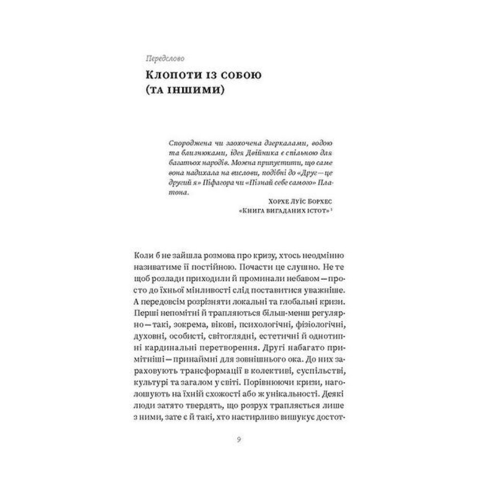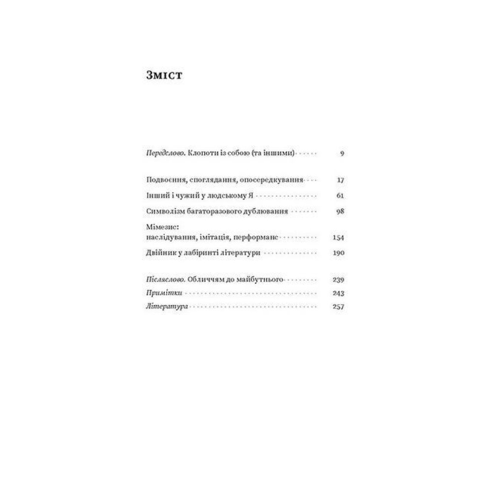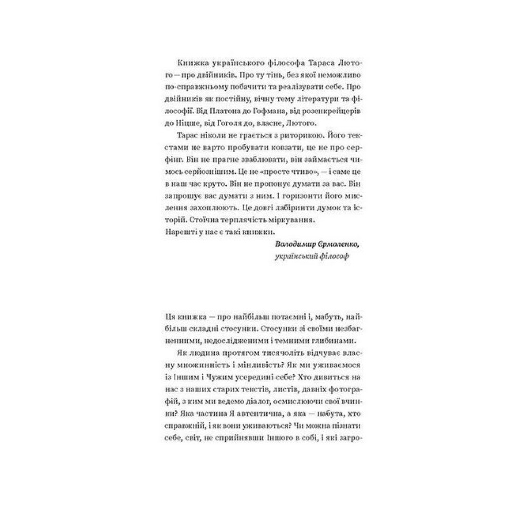 Людина — істота мінлива. Вона безупинно перероджується, опиняється в нових умовах, постійно змушена звикати до них і освоюється. Когось думки про колишні чи майбутні зміни не надто турбують, а хтось, навпаки, прагне їх навмисно, кидається у вир можливого, хоча часом це доволі болісний процес. При цьому кожній особистості властиво «розмножуватися» на силу-силенну власних двійників (не обов’язково тотожних між собою). Чому ми не завжди вчиняємо обачливо, буваємо агресивними та нетерпимими до іншості, нарочито відокремлюємо себе від усього чужого й намагаємося окреслювати свої горизонти? Чому воліємо змінюватися, хоча вважаємо себе доконечно сформованими створіннями, чому відкриті до новацій, але часом уперті й не годні поступитися ні на йоту нікому і ні в чому, легко зачудовуємося тим, чого не вміємо, але не завжди визнаємо здобутків ближніх, наслідуємо стільки, хоч відбавляй, але наполягаємо на власній правоті, захищаємо скривджених, та не хочемо дати ради собі? В оцих багатозначних подвійностях ми й намагаємося знаходити себе.Про природу людської подвійності, дублювання й множинності й розмірковує Тарас Лютий у своїй книжці. Автор зацікавився цією темою понад двадцять років тому, а останнім часом нотував свої міркування в окремих есеях. Нарешті всі дослідження й розвідки з теми двійництва зібрані в одній книжці.Тарас Лютий — професор кафедри філософії та релігієзнавства НаУКМА і старший науковий співробітник відділу філософської антропології Інституту філософії імені Григорія Сковороди. Цікавиться питаннями філософської антропології, філософії культури, історії філософії. Куратор програми перекладів класики інтелектуальної думки «Філософія» (спільно з фондом «Міжвухами» та видавництвом «Темпора»). Грає в гурті «Четверо з Полонезу». Розробник і викладач декількох філософських курсів у «Культурний Проект».