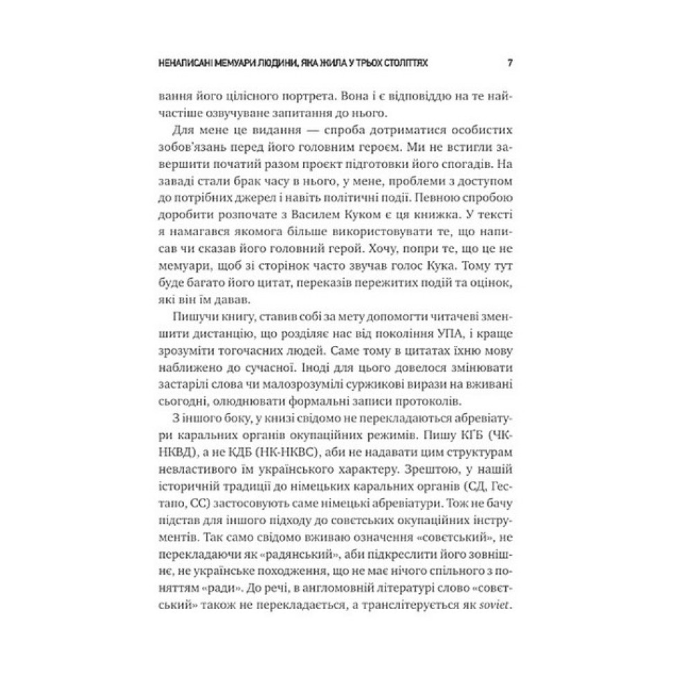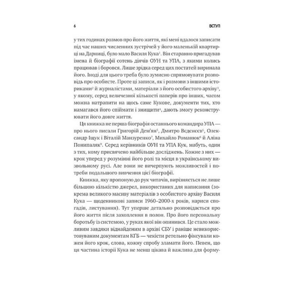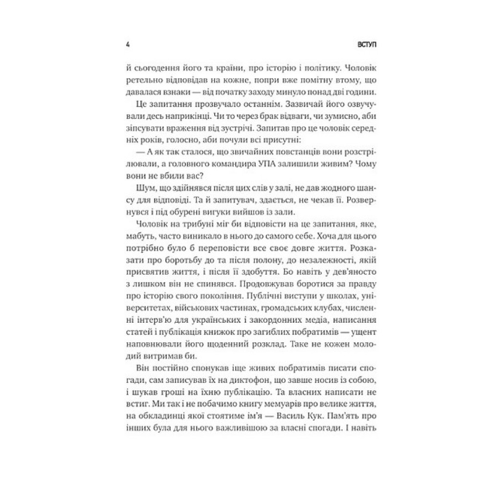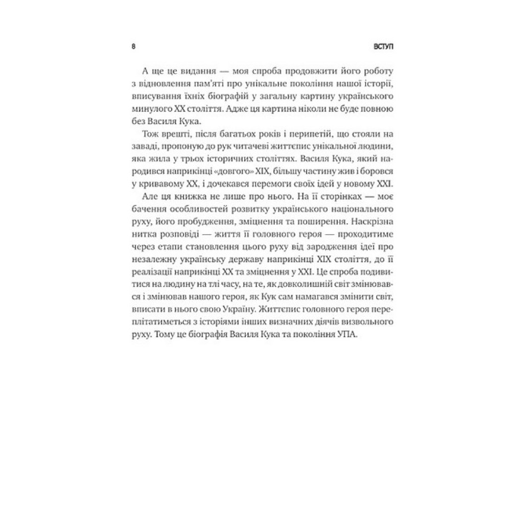 Боротьба українських підпільників проти польської влади, спроба відновлення незалежності в 1941-му, розгортання мережі ОУН на півдні та сході України, протистояння нацистському режиму, найбільший бій УПА під Гурбами весною 1944 року, війна повстанців проти совєтської влади, репресії та провокації НКВД, спроби КҐБ ламати непокірних в’язнів і врешті розвал совєтської імперії — це все розділи біографії Кука. Але ця книжка — не лише життєпис непересічної постаті, а й масштабне дослідження українського національного руху: від його зародження в ХІХ столітті до збройного спротиву проти нацистів і совєтів, і до перших років незалежної України.«Чесний літопис окремої людини і максимально об’ємний портрет часу»,— Марія Матіос«Генерал Кук — одна з найбільш відомих і водночас загадкових фігур України ХХ століття. Володимир В’ятрович майстерно поєднує архіви ворогів і спогади прихильників, щоб розповісти історію однієї людини та кількох епох, поєднаних ідеєю боротьби за українську незалежність»,— Сергій Плохій«В історії націоналіста Василя Кука, яку описав Володимир В’ятрович, цікаво все — і його підпільна боротьба проти поляків, і керівництво підпіллям ОУН на півдні та сході України, стосунки з Лебедем і Шухевичем, і те, як він був головним командиром УПА, і те, як він вижив у лабетах КҐБ і якою ціною. Книга дає інтелектуальну поживу спраглим до історії і, що важливо, не зловживає “бронзою” для портретів головного героя, його товаришів і чорною фарбою для недругів»,— Вахтанг Кіпіані