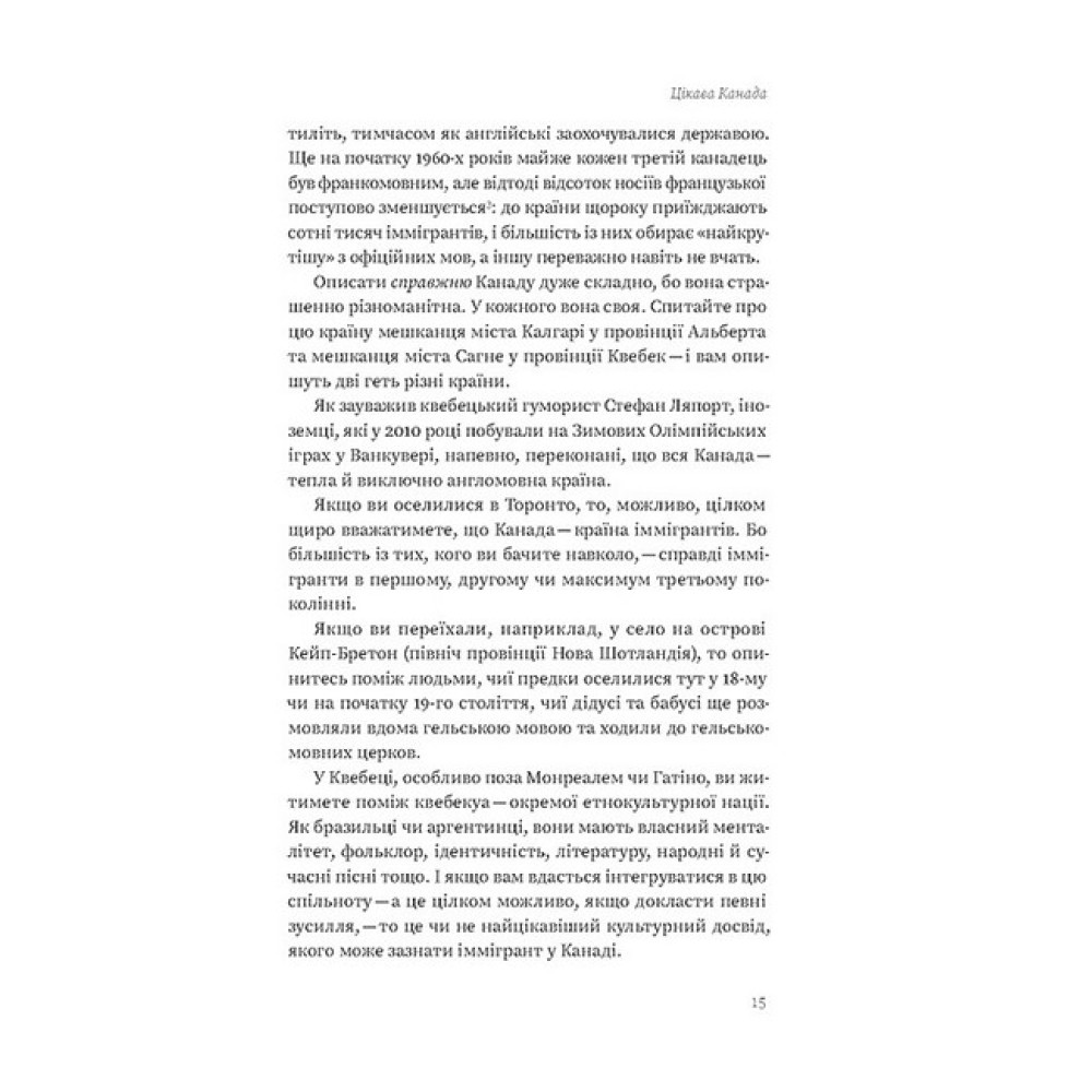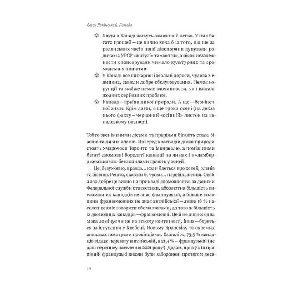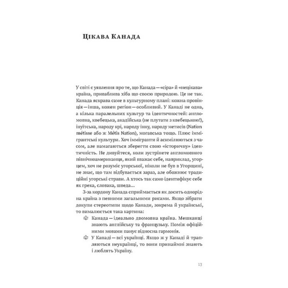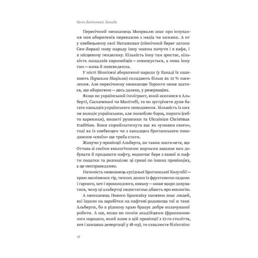 Канада — нудна й багата країна, де живуть люди, які досконало розмовляють двома мовами. Дороги тут ідеальні, а корупції немає. Засніженими преріями бігають стада бізонів, а десь поміж хмарочосами Торонто й Монреаля бородаті канадці грають у хокей. Це, безумовно, правда, коли йдеться про хокей і бізонів. Решта, сказати б, трохи… перебільшення. Канада — яскрава й самобутня. Кожна провінція — інша, кожен регіон — особливий. Іммігрант у Торонто й іммігрант у Квебеку побачать дві різні країни. Людина з Ванкувера розкаже зовсім іншу історію, ніж людина з Ньюфаундленду. І зроблять вони це, найімовірніше, абсолютно різними мовами. Саме з цією Канадою в усьому її різноманітті у своїй книжці нас знайомить Євген Лакінський. Євген Лакінський — останні 13 років працює на держслужбі в Оттаві. У Канаді Євген живе понад 20 років. Відвідав усі 10 провінцій, щодня розмовляє двома офіційними мовами країни.