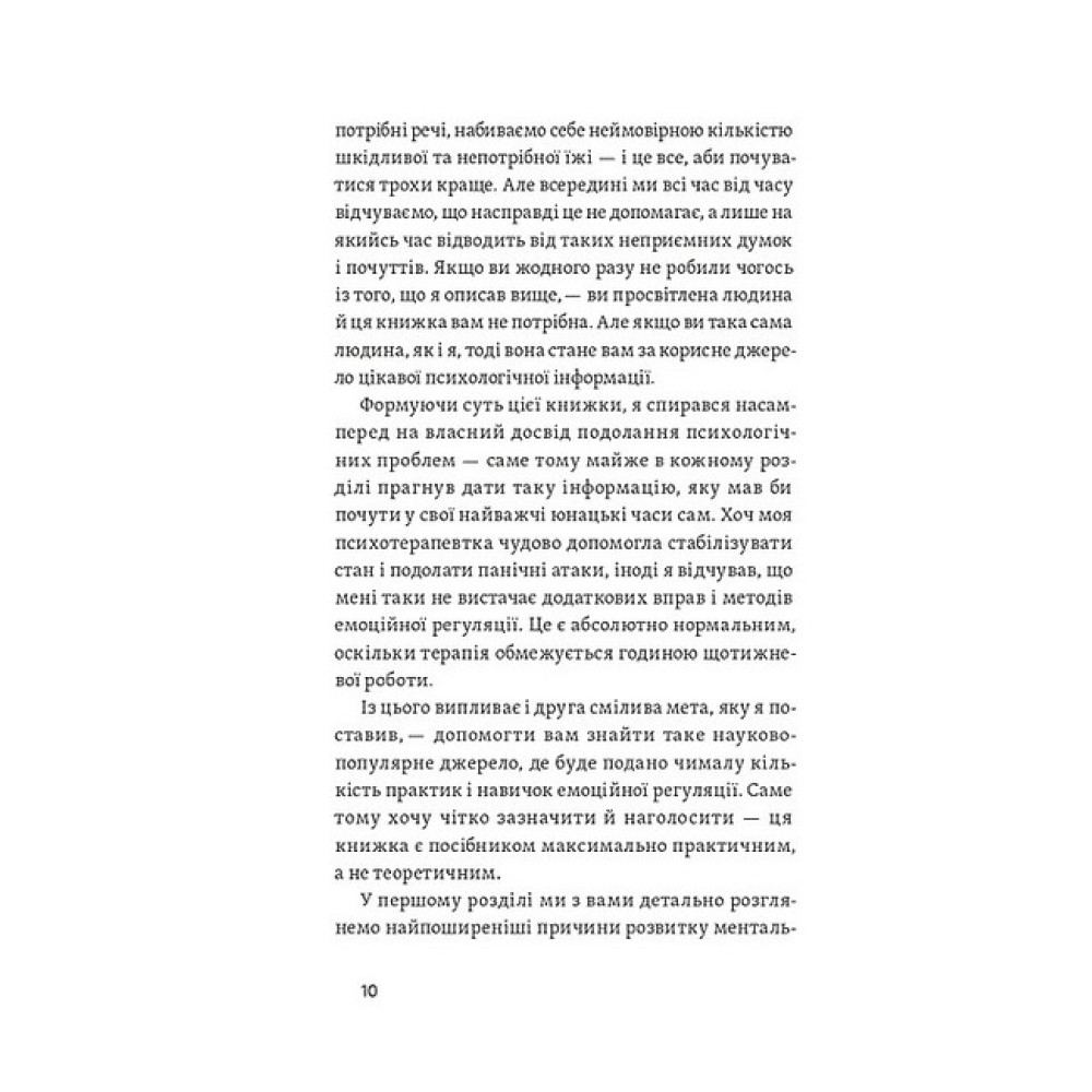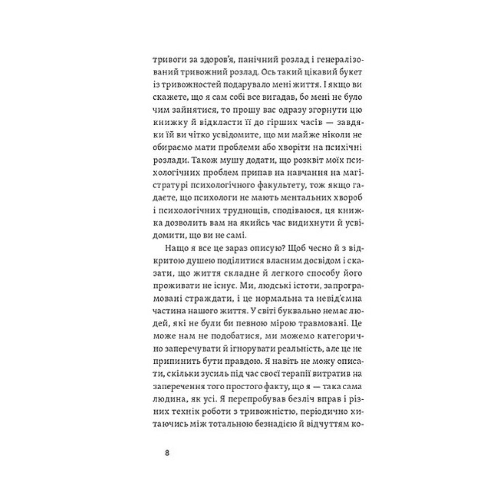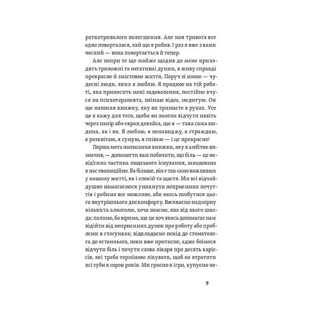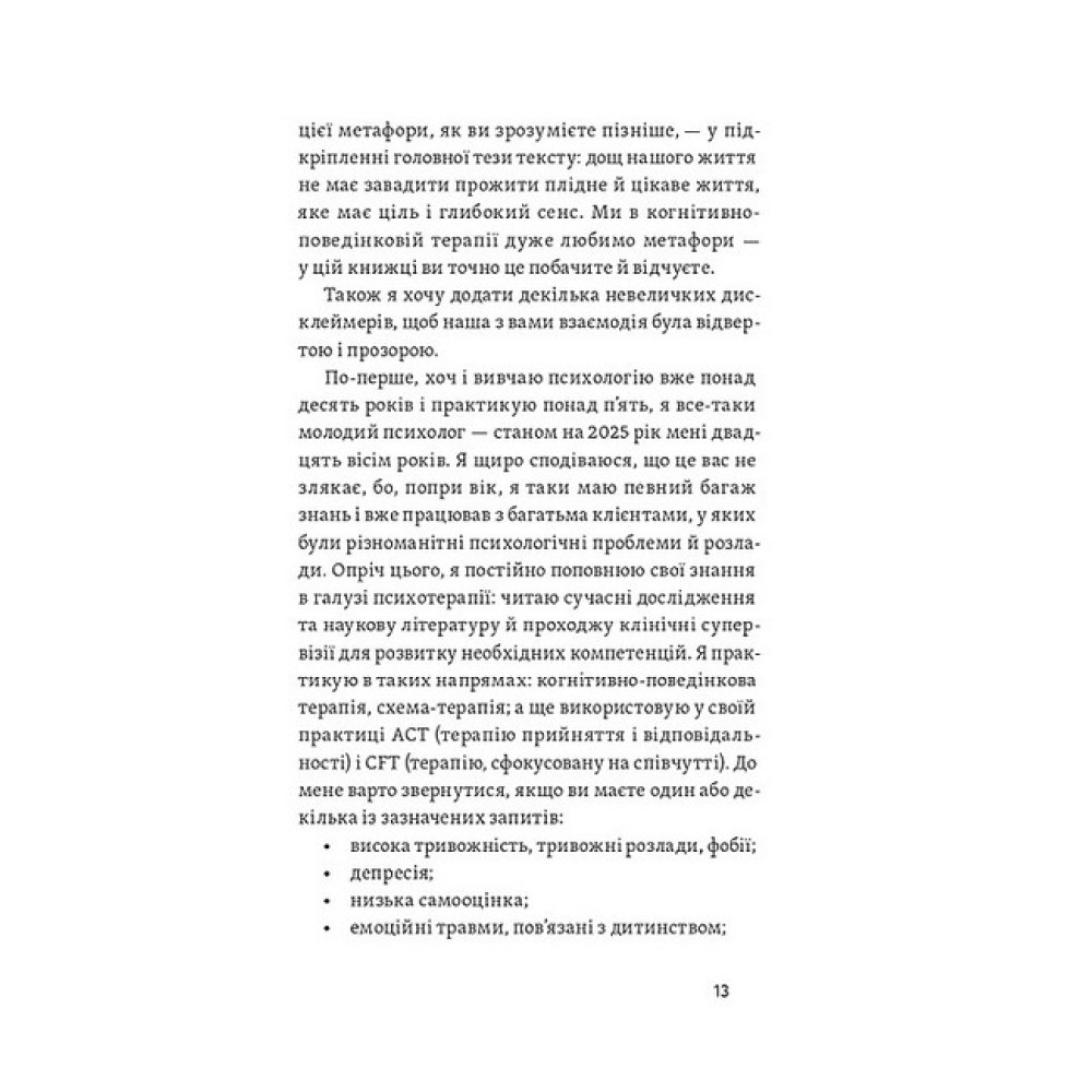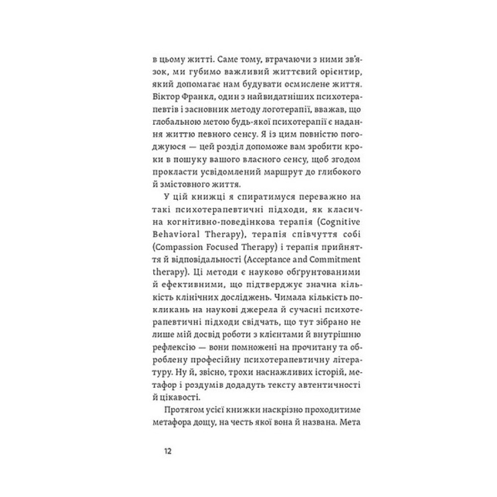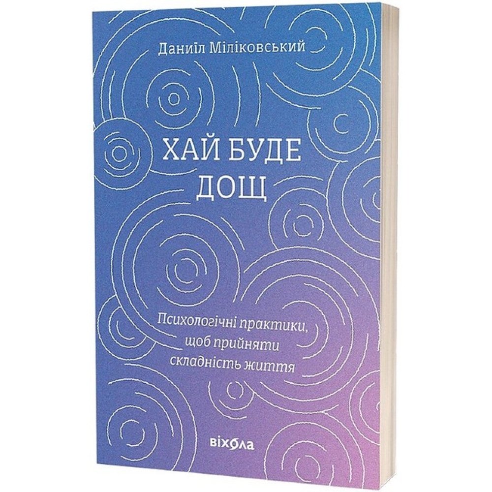 Наш біль як дощ, каже психолог Даниїл Міліковський. Ми не можемо його ані контролювати, ані уникнути, але кожна злива рано чи пізно закінчується. Автор пояснює, що впливає на нашу психіку та що із цього ми можемо контролювати, а що — ні; як прийняти свої емоції й навчитися ними керувати. Книжка вчить мислити гнучкіше та плекати корисні думки навіть у найскладніших обставинах, зберігати внутрішню стійкість і справлятися з деструктивними думками. Поміж історій клієнтів психолог вплітає вправи, які допомагають вирішувати, спираючись на ваші життєві цінності, та рухатись до плідного й наповненого сенсами життя. У своїй книжці Даниїл спирається на техніки з класичної когнітивно-поведінкової терапії, терапії співчуття собі та терапії прийняття й відповідальності. Даниїл Міліковський — практикуючий психолог. Спеціалізується на роботі з тривожними і депресивними розладами, низькою самооцінкою, працює з розладами особистості та травмами, пов'язаними з негативним досвідом у дитинстві.