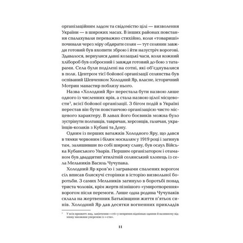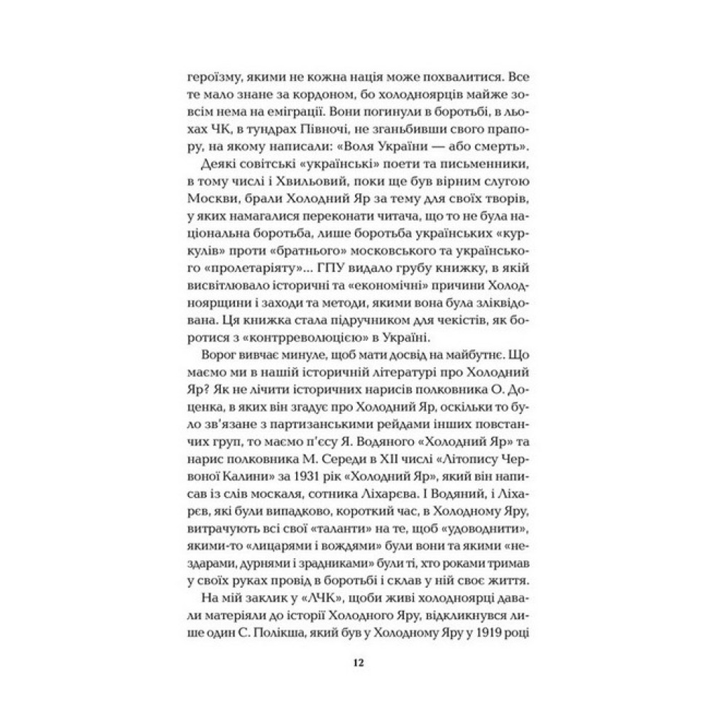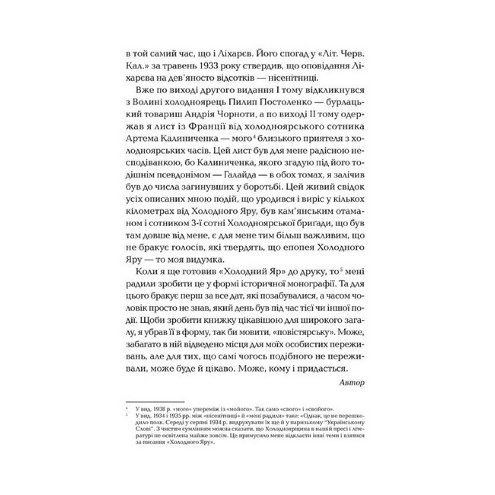 Текст без купюр та змінДруге академічне видання, виправлене й доповнене (з доповненнями укладача)Коментарі науковцяДокладно про історію створення «Холодний Яр» – спогади вояка, які читати легко, ніби пригодницький роман, і корисно, як багате на факти джерело про маловідому сторінку нашої історії: повстанський рух під прапором Української Народної Республіки. Уперше після 1961 року презентується автентичний текст. Крім того, це перше академічне видання, яке відображує всі відомі прижиттєві версії від 1932 до 1938 року. Книжка доповнена статтями, у яких розглянуто спогади Горліса-Горського як історичне джерело, а також наведено деякі зауваги щодо його біографії, яку досліджувати виявилося вкрай непросто.