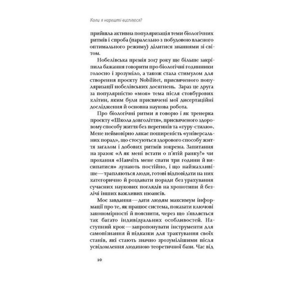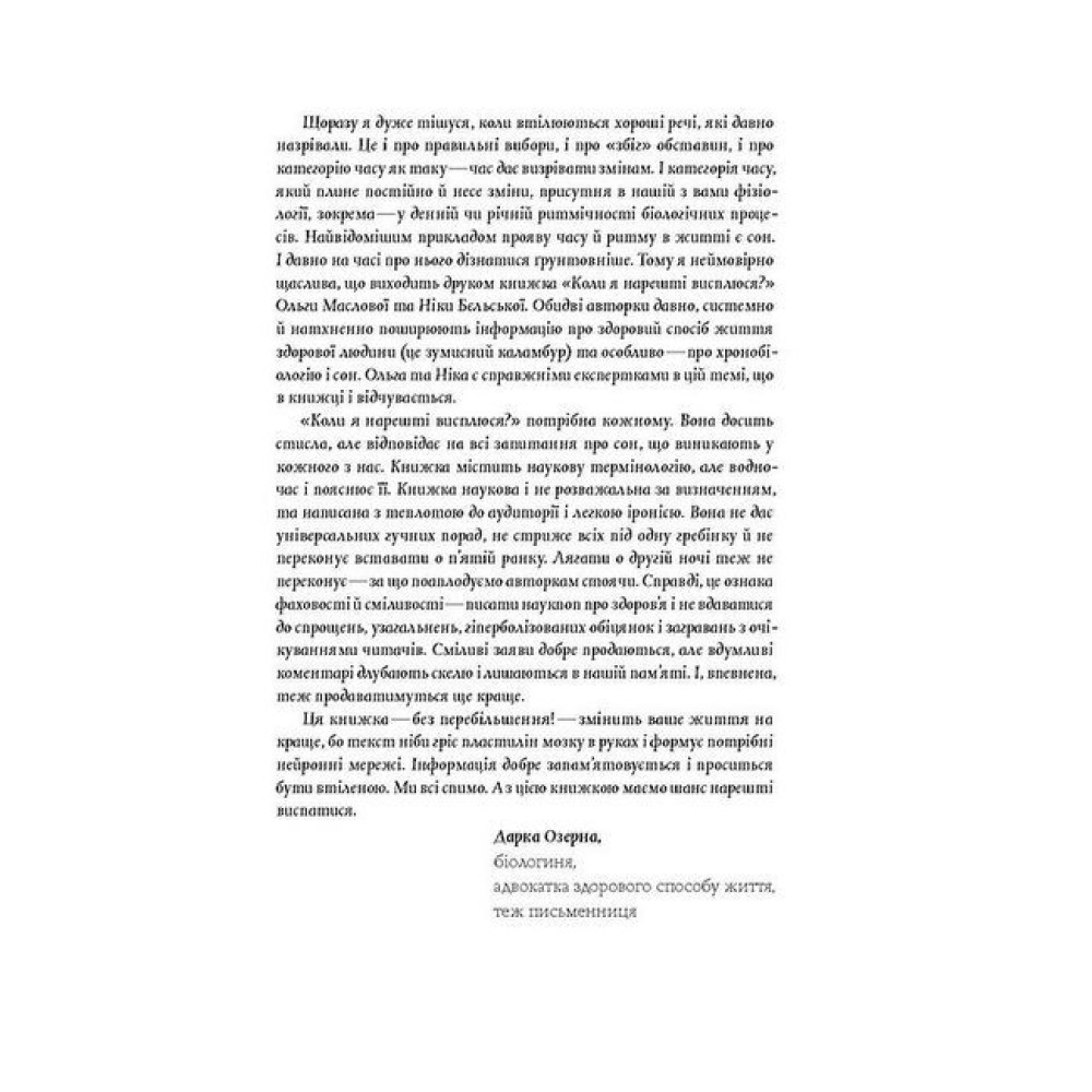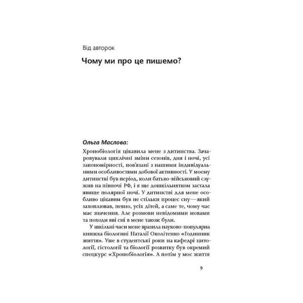 Автор | Маслова Ольга, Ника Бельская Рік 2021 Мова Українська Жанр Здоров'я, Науково-популярна320 ? КупитиВсе про “Коли я нарешті висплюся?” Від видавця Коли я нарешті висплюся? Це питання ми ставимо собі роками, переконуючи самих себе в тому, що ось уже незабаром (після школи/іспитів/роботи/на старості) налагодимо цей процес. Переконуємо себе так, наче в цьому є щось складне, а у нас — необмежений запас часу. Погані й гарні новини разом: часу в нас мало, але, на щастя, у наших біологічних ритмах немає жодної магії. Сон і біологічний годинник, за яким ми живемо, — хай які складні в роботі механізми, та все ж їх можна налаштувати. Достатньо лише зрозуміти, як усе це працює. Саме ці процеси у книжці «Коли я нарешті висплюся? Як засинати і прокидатися із задоволенням» пояснюють біологині Ольга Маслова та Ніка Бєльська.Чому не варто змушувати сов прокидатися о п’ятій та навіщо жайворонки «підриваються» з першим промінням сонця? Як побороти джетлаг, чому на ніч хочеться з’їсти тортик і навіщо вам у спальні суцільна темрява? Про все це розповідають Ольга та Ніка, які не лише розвіюють міфи, а й за допомогою практичних вправ показують, як зробити так, щоб усі ми нарешті виспалися.Ольга Маслова — кандидатка біологічних наук, засновниця науково-популярної ініціативи Nobilitet, ведуча передачі «Наука як по маслу» на Громадському радіо, співавторка жіночого календаря Solomia Today, консультує інноваційні, наукові та освітні проекти. Ніка Бєльська — консультантка зі сну та лайфстайлу здорового довголіття, викладачка йоги та медитації каліфорнійської школи. За освітою — генетик зі спеціалізацією на генетиці довгожителів України. Рецензії 0 Всі характеристики ВидавництвоВіхола |