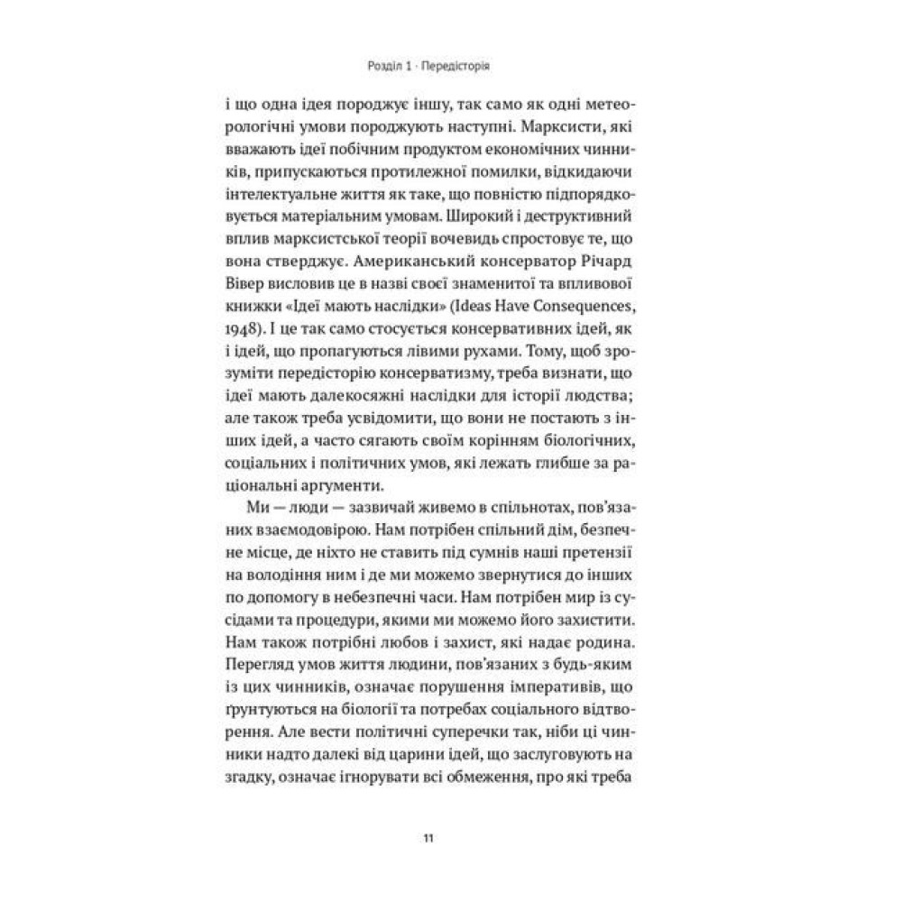Видатний філософ Роджер Скрутон веде читачів від початків консерватизму як політичної філософії у XVI столітті до сьогодення та показує, що консервативне мислення зіграло важливу роль в інтелектуальній історії Заходу. Ба більше, без таких консерваторів як, зокрема, Едмунд Берк, віконт де Шатобріан, Томас Стернз Еліот, Фрідріх Гаєк та Хосе Ортега-і-Гассет Західна цивілізація ніколи не стала б тим поєднанням свободи та відповідальності, який донедавна забезпечував її успіх. Про автора: Роджер Скрутон — британський філософ і письменник. Член Британської академії, членкореспондент французької Академії моральних і політичних наук. Редактор консервативного політичного журналу Salisbury Review. Автор понад 50 книжок із філософії, мистецтва, музики, політики, літератури, культури, сексуальності та релігії. Серед його найвідоміших публікацій — «Значення консерватизму», «Сексуальне бажання», «Естетика музики» і «Як бути консерватором». Дописувач Times, Spectator і New Statesman.