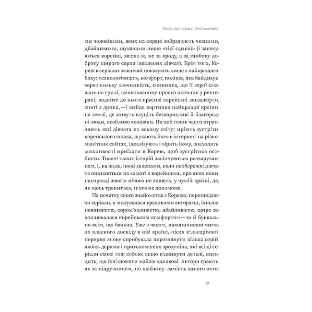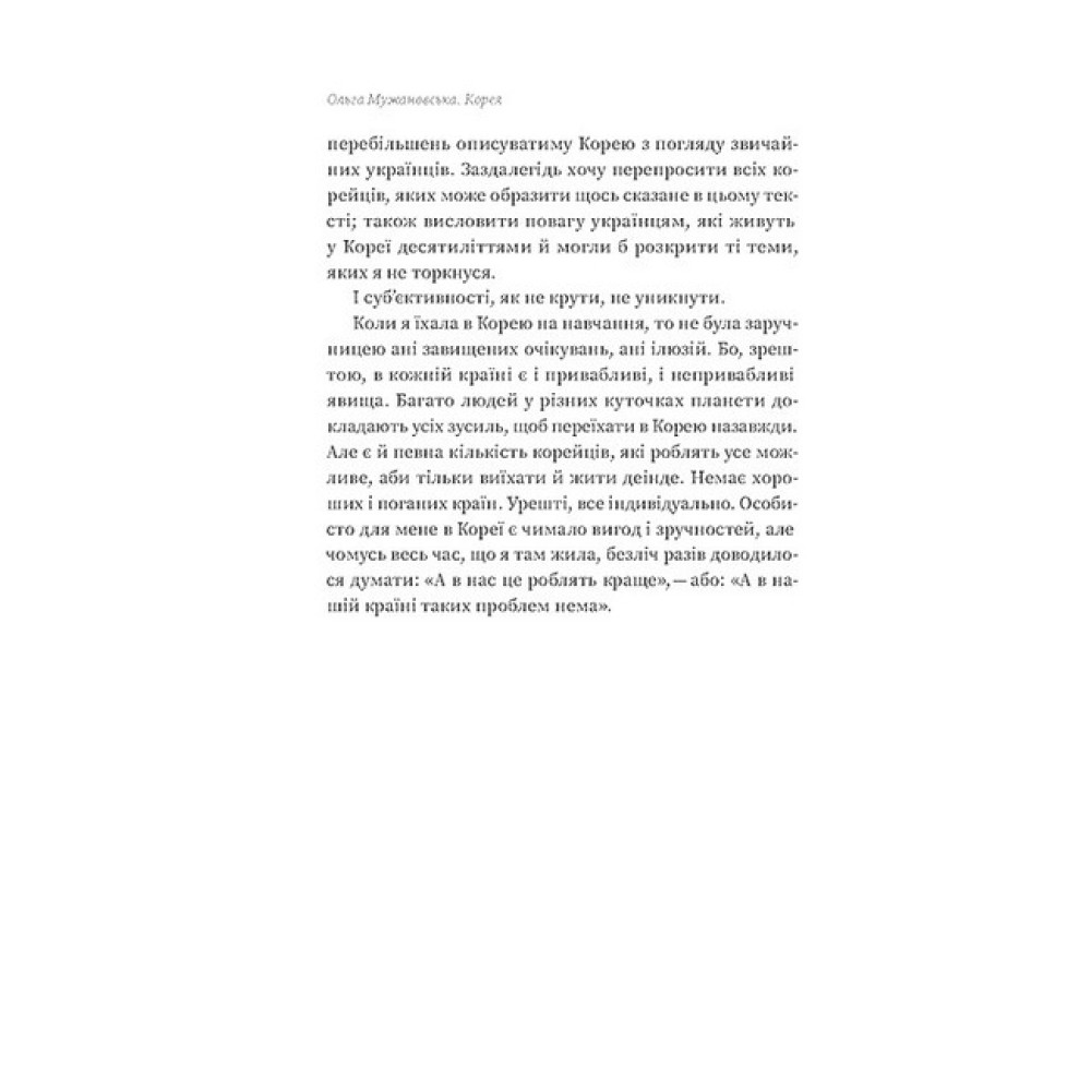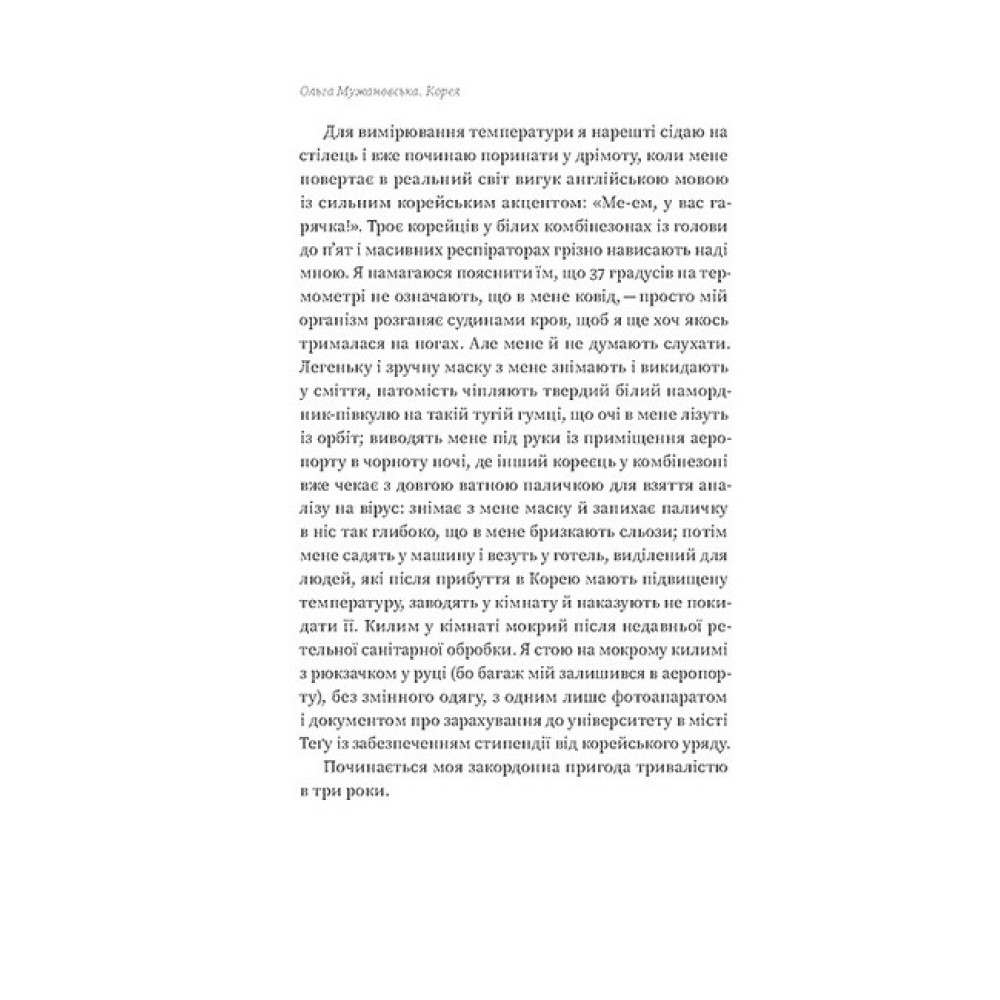 Південна Корея — це країна, де двори старовинних палаців межують із сучасними хмарочосами Сеула, а швидкісні потяги перетинають усю її територію за лічені години. Тут древня культура поєднується із кей-попом, коміксами й дорамами, що їх дивляться мільйони глядачів у всьому світі. У цій книжці Ольга Мужановська ділиться своїм досвідом занурення у повсякденне життя Кореї, розповідає про її культуру й історію, географію та економіку. Вона говорить про місцеву кухню й традиційний одяг, особливості спілкування й стандарти поведінки, пояснює, чому українцю, аби вивчити корейську, доведеться фактично перебудувати власний мозок, щоб звикнути до відсутності розділових знаків. Також авторка не приховує і темної сторони життя корейців та розповідає, як за красивою картинкою можуть ховатися ієрархічність суспільства, самогубства та домагання. Ольга Мужановська — мандрівниця, біологиня за фахом, випускниця Києво-Могилянської академії, а також університету в Південній Кореї.