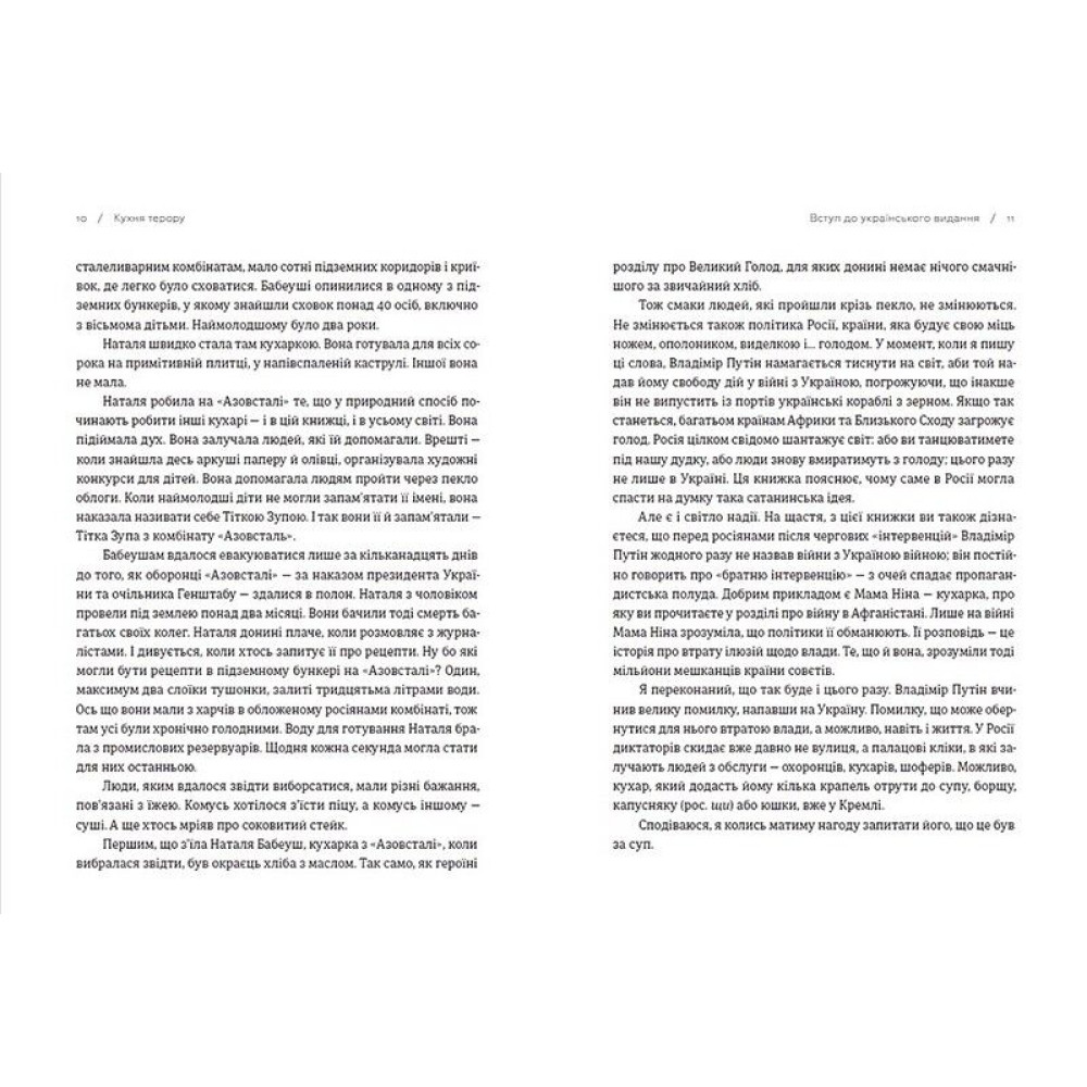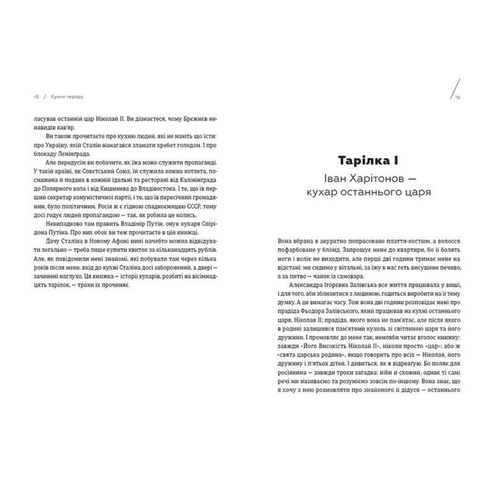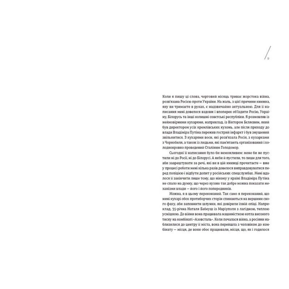 Для написання цієї книжки відомому польському репортерові Вітольду Шабловському довелося свого часу об’їздити Росію, Україну, Білорусь та інші радянські республіки. Він спілкувався з особливими кухарями — Віктором Бєляєвим, який контролював кремлівську кухню, із тими кухарями, які працювали в часі воєн, що розв’язала Росія, з кухарками Чорнобиля, а також тими, які пережили й запам’ятали на все життя часи Сталінського Голодомору в Україні. Та власне через кухонні двері можна так добре показати не лише людські історії, смакові звички чи вподобання кухарів і тих, кому вони готували, а й маніпулятивні механізми влади — жорстокої та безжальної, зосередженої в руках божевільних вождів, генсеків та інших радянських партійних діячів. Не розумієте, як їжа може служити пропаганді? У країнах, що називалися Радянський Союз, її подавали у кожній смаженій котлеті й кожній радянській їдальні від Калінінграда до Північного полюса, від Молдови до Владивостока. Політика, на жаль, була присутня і в тому, що їв перший секретар, і в тому, що споживав чи не мав що їсти пересічний громадянин великої тоталітарної утопічної держави.