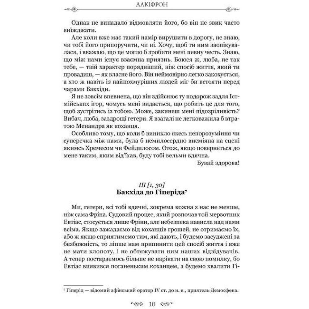 До видання увійшли твори: «Листи гетер» Алкіфрона — грецького ритора і письменника ІІ ст. н. е., «Характери» Теофраста (372?287 рр. до н. е.) — давньогрецького філософа, вченого, учня Арістотеля. «Листи гетер» Алкіфрона відтворюють життя і побут грецьких жриць кохання та їхні взаємини з видатними людьми. Майже всі імена авторок листів і їхніх адресатів історично достовірні. Вони справді жили в IV ст. до н. е., і їхні життєві перипетії, які відтворив Алкіфрон, навіть через V–VI ст. пізніше, були добре знані тодішньому грецькому суспільству. Листи Алкіфрона мали вплив на європейську епістолографію.«Характери» Теофраста — самобутня галерея літературних портретів, позбавлених людських чеснот. Автор майстерно змальовує найтиповіші людські вади, які визначають відповідну вдачу людини, тобто її характер. Твір мав відчутний вплив на античну і пізніше європейську літературу.