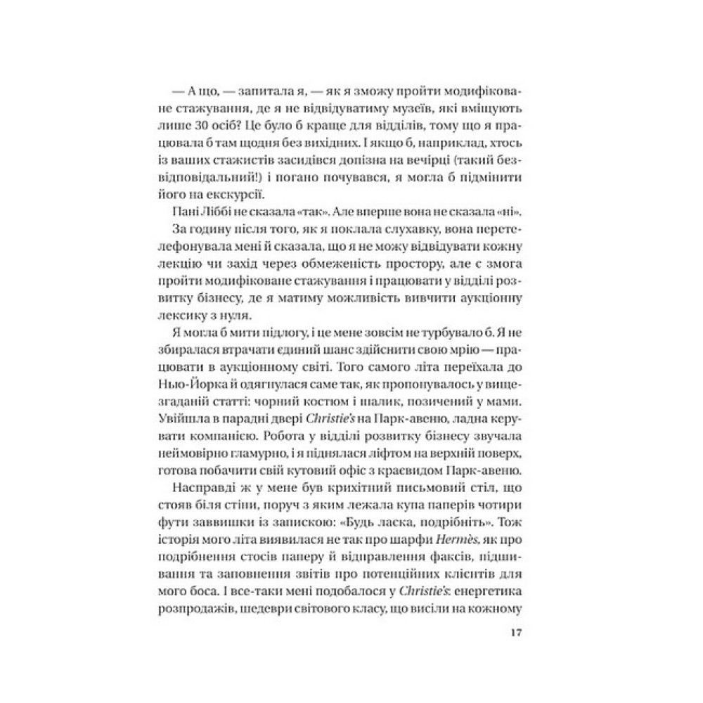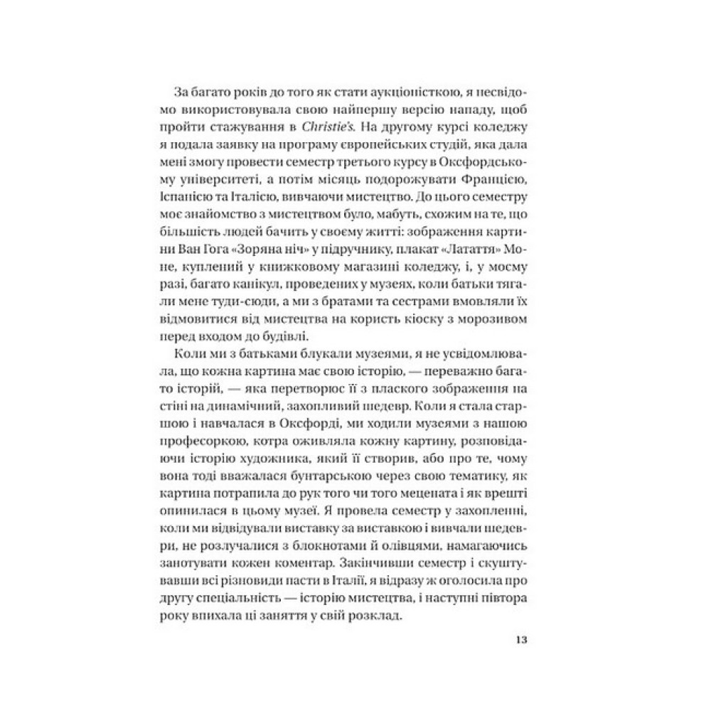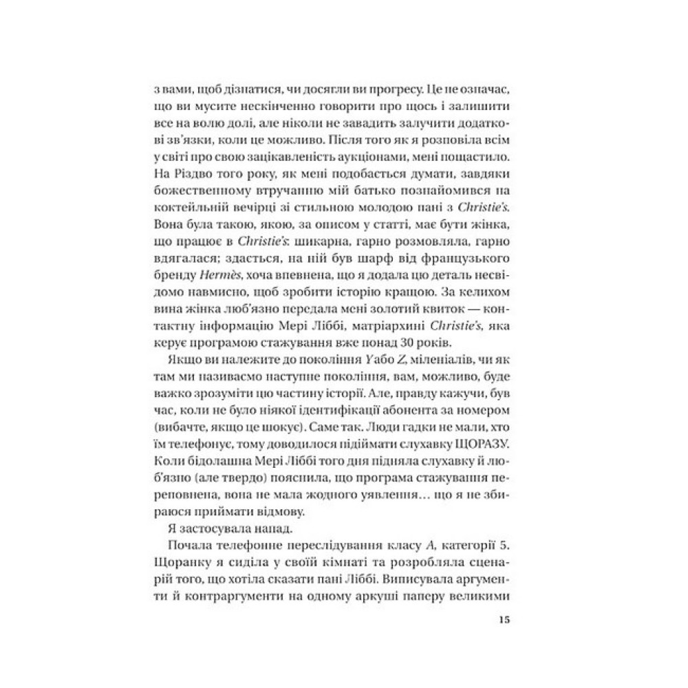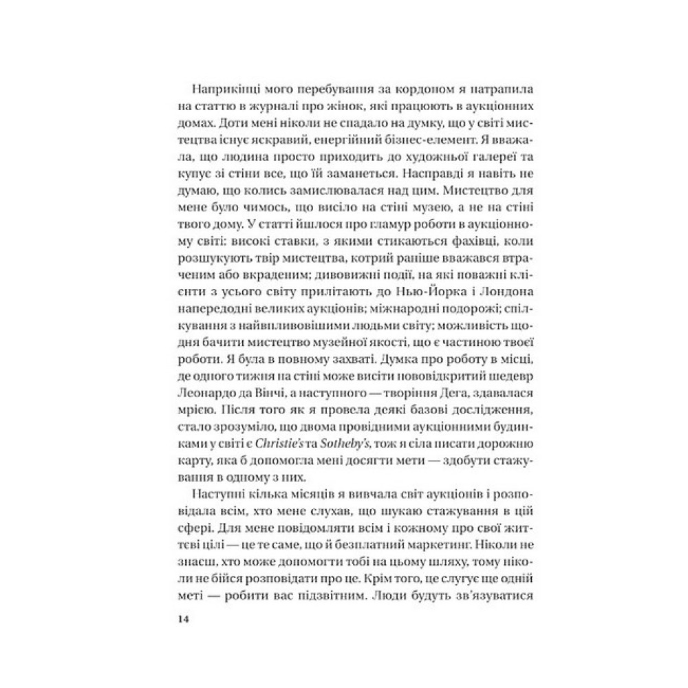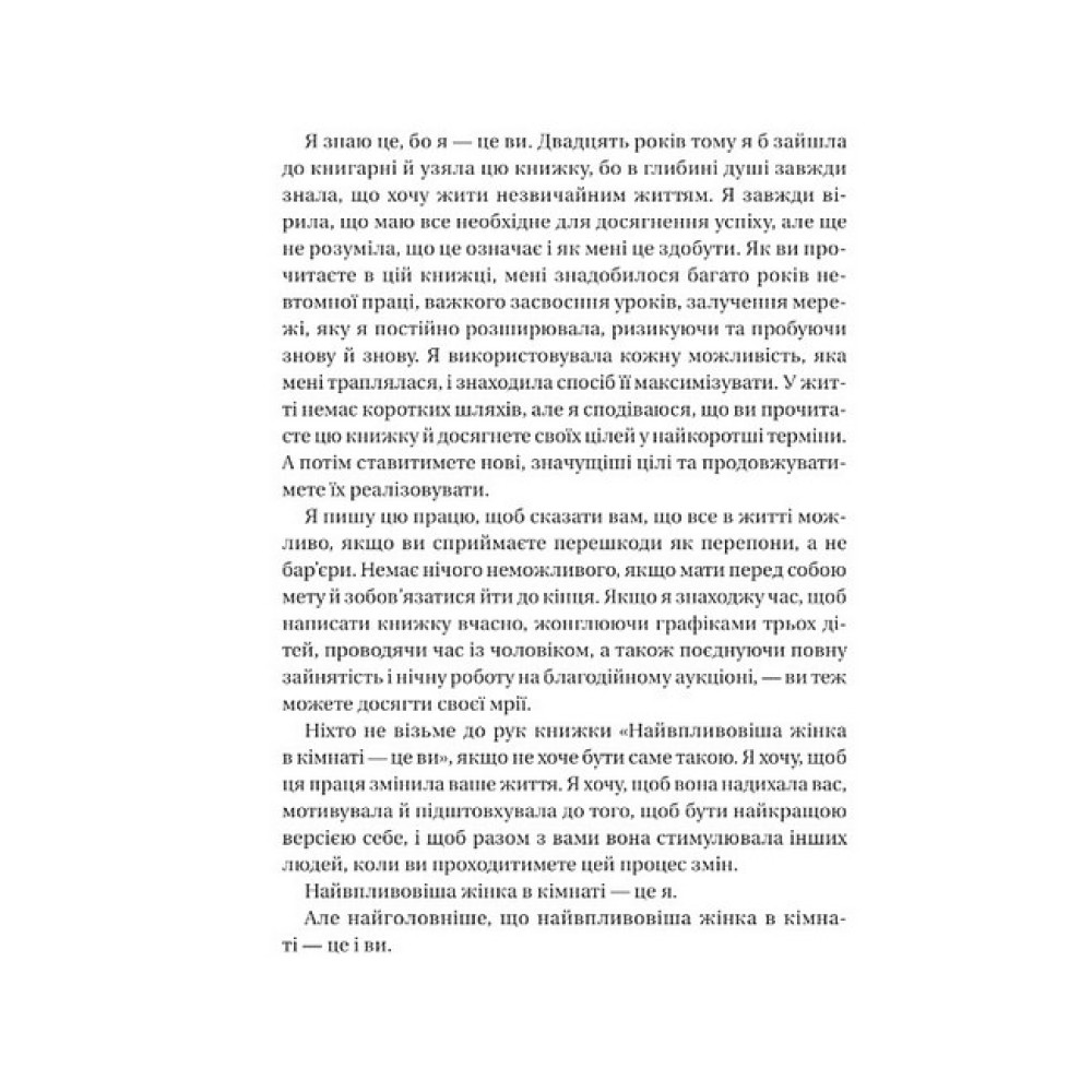 Вона може зібрати мільйон доларів за хвилину. Привернути увагу однієї людини чи групи на п’ять тисяч осіб. Продати будь-що будь-кому. І ви зможете. Лідія Фенет, старша віцепрезидентка Christie’s, досвідчена аукціоністка, ділиться секретами успіху та стратегіями, що дозволили їй створити революційний підхід до продажів і зібрати понад пів мільярда доларів для неприбуткових організацій по всьому світі. Фенет не з чуток знає, що єдиною навичкою, яка робить жінку зіркою в кар’єрі й особистому житті, є вміння продавати.Ця книжка допоможе вам вивести свою кар’єру на новий рівень, перебороти страх просто попросити, перескочити проміжжя мізерних зарплат. Заходьте в будь-яку кімнату з впевненістю лідерки, розкрийте свої сильні сторони й візьміть нарешті на себе відповідальність за власне життя. Ви — єдина людина, якій під силу його змінити. Тож навчіться в Лідії Фенет продавати й налагоджувати зв’язки, забудьте науку перепрошувати на користь науки вести переговори, а бездоганно спокійний вираз обличчя (покерфейс) і свобода завжди говорити правду стануть приємними бонусами.Книга «Найвпливовіша жінка в кімнаті — це ви» є нонфікшном із саморозвитку від американської авторки Лідії Фенет. Вона ділиться секретами професійного успіху, які вивела з особистого досвіду роботи на посаді віцепрезидентки аукціонного дому Christie’s. Авторка впевнена: щоб прокласти шлях до омріяного життя, слід дослуховуватися свого внутрішнього голосу. Утім, як діяти, коли його ледь чути, або коли його приглушують думки та переконання колег? Відповідь на це питання знаходиться в назві книги: потрібно повірити у себе, підняти власну самооцінку та показати силу характеру — і Лідія Фенет розповість, як це зробити.Рейтинги 4,6 на Amazon і 3,79 на Goodreads із понад 1,4 тис. оцінок.У кінці кожного розділу розміщені історії впливових жінок, досягнення яких відбивають ідеї стратегії успіху, розробленої авторкою нонфікшну.