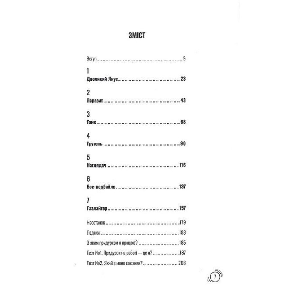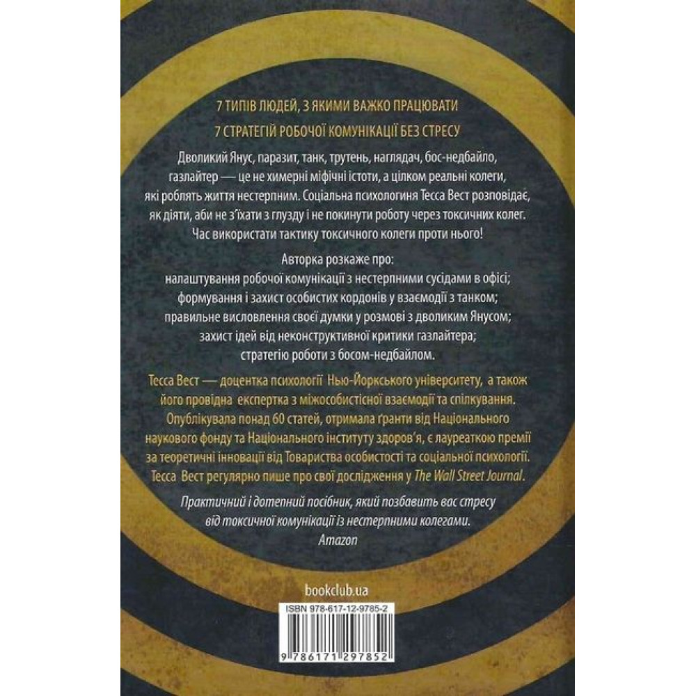 • 7 типів людей, з якими важко працювати • 7 стратегій робочої комунікації без стресу • Практичний і веселий посібник, що допоможе впоратися з токсичними колегамиДволикий Янус, паразит, танк, трутень, наглядач, бос-недбайло, газлайтер — це не химерні міфічні істоти, а цілком реальні колеги, які роблять життя нестерпним. Соціальна психологиня Тесса Вест розповідає, як діяти, аби не з’їхати з глузду і не покинути роботу через токсичних колег. Час використати тактику токсичного колеги проти нього!Авторка розкаже про: • налаштування робочої комунікації з нестерпними сусідами в офісі; • формування і захист особистих кордонів у взаємодії з танком; • правильне висловлення своєї думки у розмові з дволиким Янусом; • захист ідей від неконструктивної критики газлайтера; • стратегію роботи з босом-недбайлом.