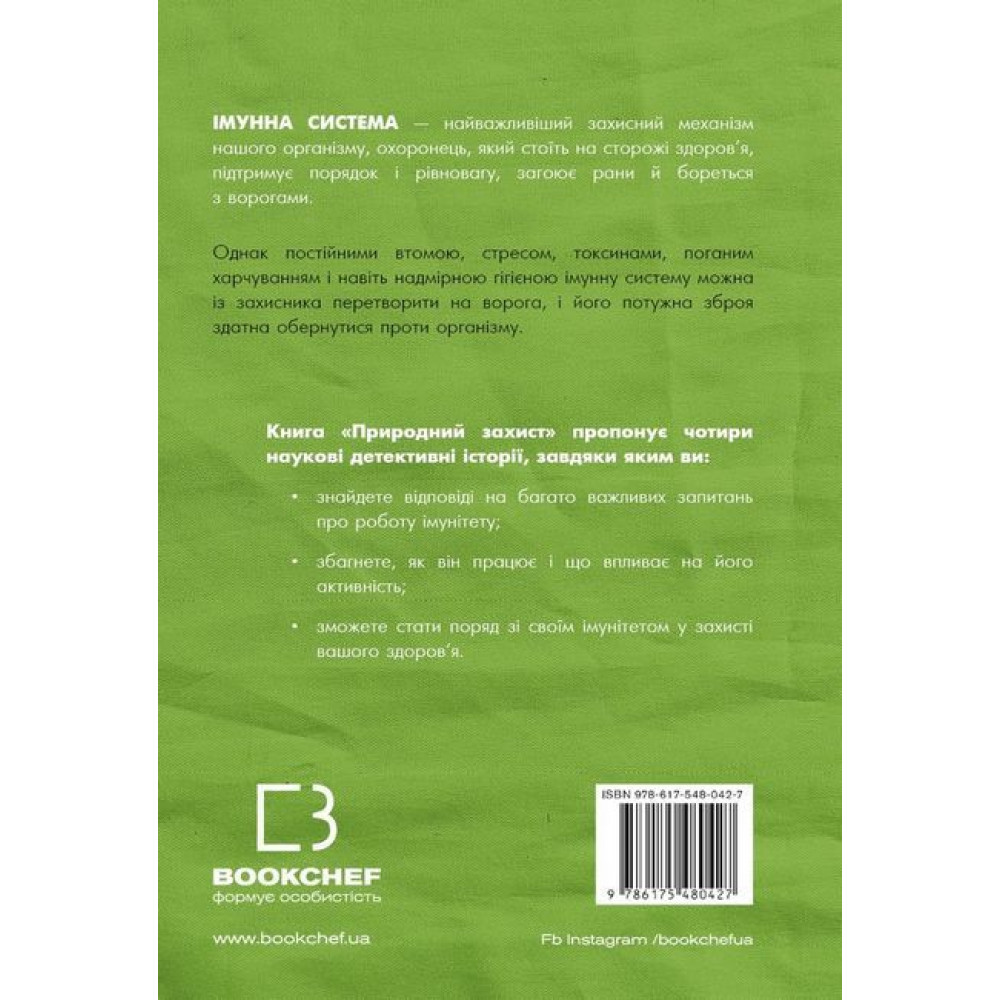 Імунна система — найважливіший захисний механізм нашого організму, охоронець, який стоїть на сторожі здоров’я, підтримує порядок і рівновагу, загоює рани й бореться з ворогами. Еволюція тисячоліттями відточувала його й продовжує робити це, спонукаючи адаптуватися до нових загроз. Однак постійними втомою, стресом, токсинами, поганим харчуванням і навіть надмірною гігієною імунну систему можна із захисника перетворити на ворога — і його потужна зброя може обернутися проти організму. Саме це призвело до практично епідемії різноманітних автоімунних хвороб.Автор книги «Природний захист» пропонує читачам наукову детективну історію, в якій вони разом із героями оповіді знайдуть відповіді на багато важливих запитань про роботу імунітету й зможуть не лише збагнути, як він працює, а й стати з ним поряд у захисті свого організму.