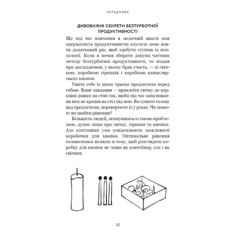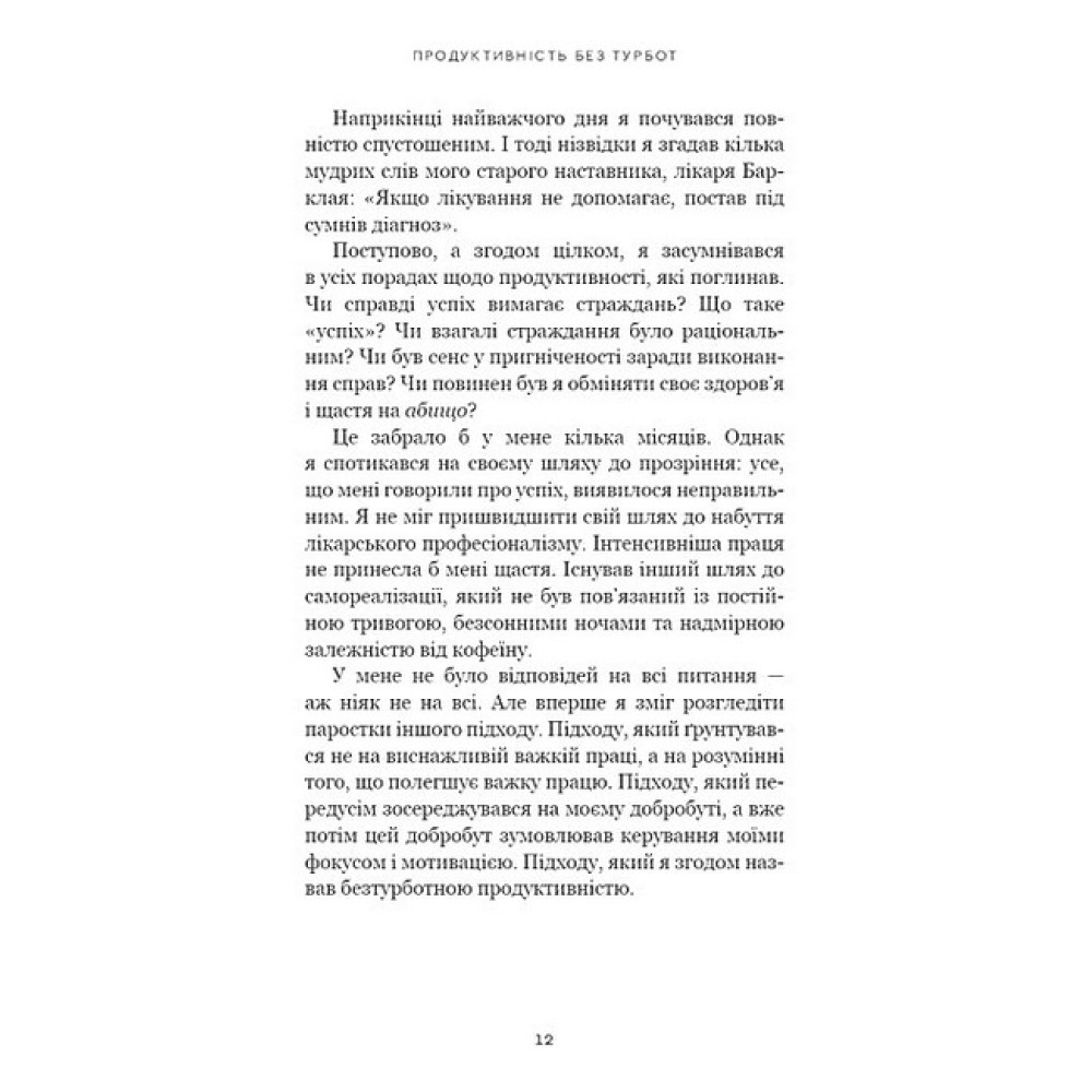 Ми стандартно вважаємо, що продуктивність залежить від тяжкої праці й суворої дисципліни. Що шлях до успіху встелений нескінченними розчаруваннями й подоланням труднощів. Але якщо є інший спосіб?Найпопулярніший у світі експерт із продуктивності доктор Алі Абдаал відкрив значно простіший і набагато приємніший шлях до успіху, який базується не на дисципліні, а на безтурботності. Він виявив, що коли ви почуватиметеся добре, то ваша продуктивність буде природною. У цій книзі автор розповідає, як мистецтво безтурботної продуктивності може змінити ваше життя. Він представляє приховані мотиватори приємної продуктивності, вказує на перешкоди, які необхідно подолати, щоб перемогти прокрастинацію, і радить підтримувальні методи для запобігання вигоранню, які допомагають досягти тривалого задоволення.Книга містить надихаючі історії засновників бізнесу, олімпійців і вчених, лауреатів Нобелівської премії, які втілюють принципи безтурботної продуктивності, а також пропонує прості, але цінні зміни, здатні зробити вас продуктивнішими й задоволенішими. Скориставшись знаннями Алі Абдаала, ви не тільки досягнете більшого, а й станете щасливішими.