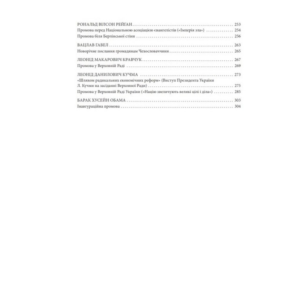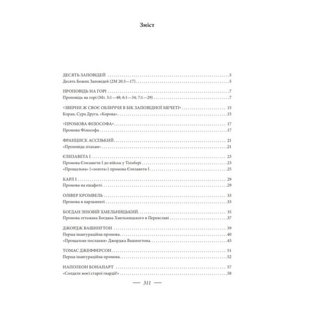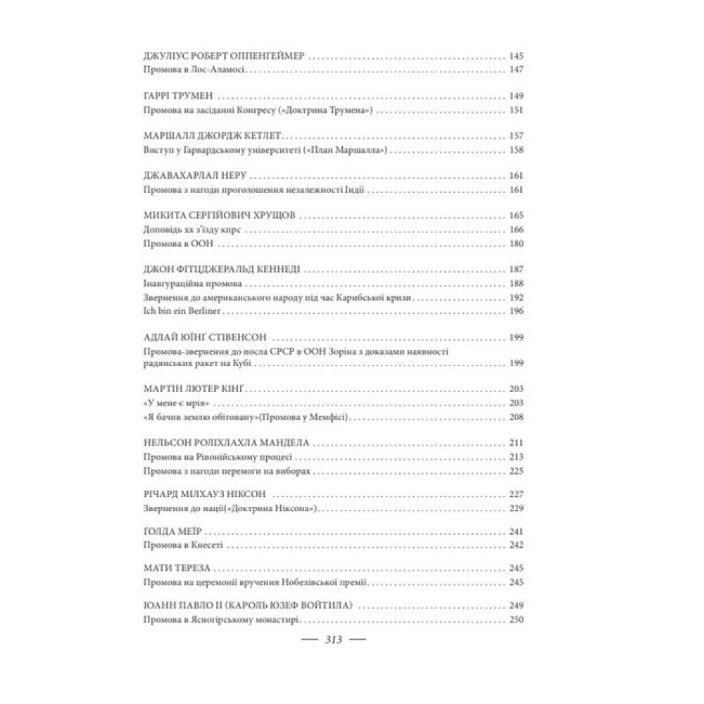 Історію творять видатні особистості. Але чи можуть слова змінити її хід? Звичайно, можуть, якщо вони були вимовлені великою людиною. Ця книга є зібранням публічних промов людей різних епох і народів — від найдавніших філософів до сучасних політиків, громадських і релігійних діячів. Мойсей, Франциск Ассізький, Богдан Хмельницький, Джордж Вашингтон, Наполеон Бонапарт, Михайло Грушевський, Вінстон Черчілль, Джон Кеннеді, Мартін Лютер Кінг, Мати Тереза… У виступах цих та інших найвидатніших персон можна знайти слова та думки, які не залишать нікого з читачів байдужими. З ними можна погоджуватися і сперечатися, але харизма кожного з ораторів і досі відчувається навіть зі сторінок книжки.Промови, що увійшли до видання, це не тільки шедеври ораторської майстерності, це віхи в історії людства, які є відправними точками подій, що змінили світ.