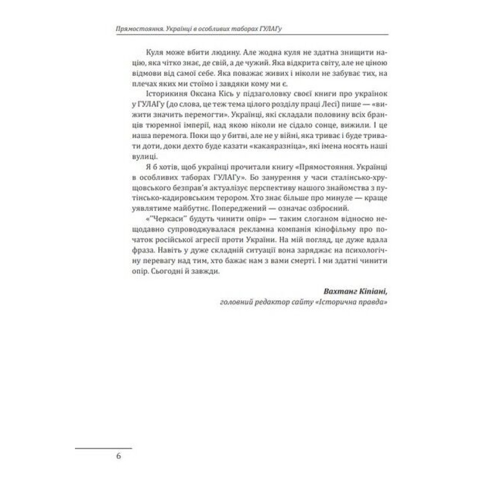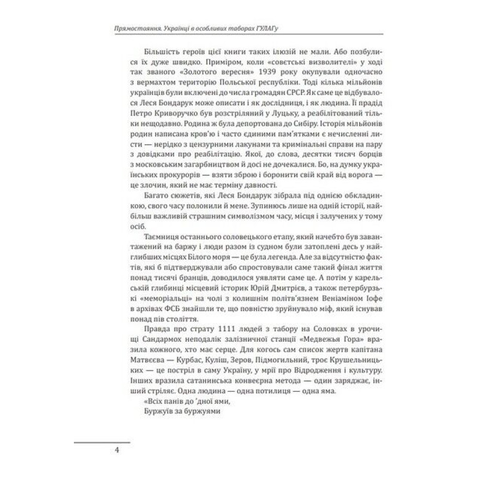 Про ув’язнення українців у таборах ГУЛАГу можна розповідати і писати нескінченно. Цю тему неможливо розкрити повністю в одній чи навіть у ста книжках. Завжди знайдуться нові цікаві документи, події, вражаючі долі людей. Підняті у цій книжці проблеми можна розвивати надалі окремими дослідженнями. І це треба робити. Бо чим більше ми шукаємо і працюємо, тим більше дізнаємося правди, яку тоталітарна система ретельно приховувала від нас. У цій праці розповідається, як українці боролися за право бути собою, потерпаючи від наруги в особливих радянських концтаборах (наджорстких умовах спеціально створених для політичних опонентів режиму).