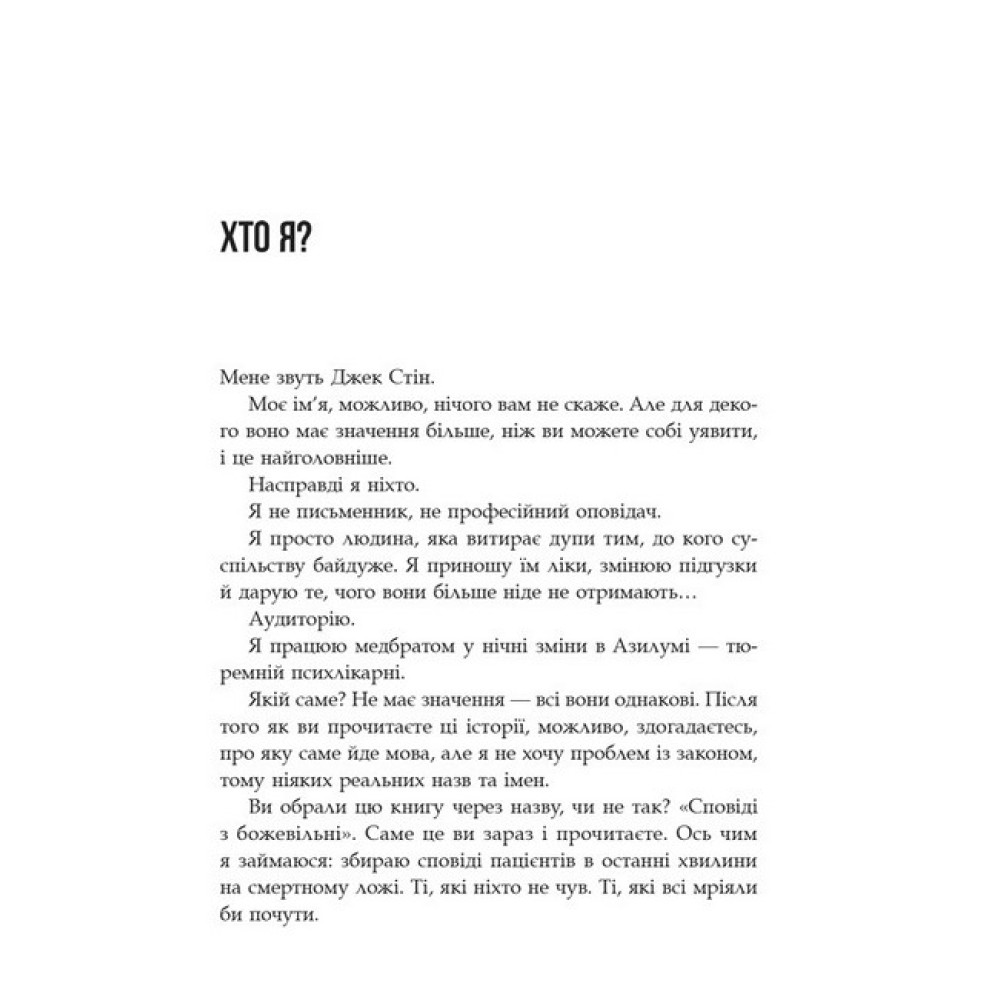 «Сповіді з божевільні. Книга перша» від Джека Стіна викличе у вас цікавість, обурення, огиду, заперечення, співчуття, розгубленість, але точно не залишить байдужими. Джек Стін пише не про ті жахи, які кояться у психлікарнях, а про ті, які чатують зовні — у «нормальному» світі, біля нас із вами. Чотири історії, чотири сповіді — це чотири спроби подивитися на світ очима в’язнів тюремної психлікарні. Залізти в їхню шкуру й усвідомити, що вони такі самі люди, як і ви, а потім здригнутися від несподіваного вчинку чи думки, які показують, що між нами прірва. Але чи настільки вона глибока? «Сповіді з божевільні» — книга, яка змушує замислитися про те, які обставини можуть перетворити людину на монстра.