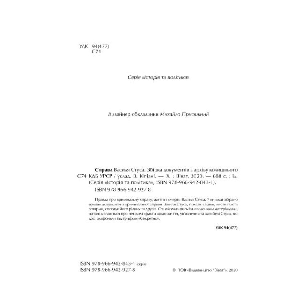 Книга Вахтанга Кіпіані «Справа Василя Стуса» вийшла друком у явились в місті у 2019 року у видавництві Vivat, та отримала низку премій: . Book Forum Lviv — персональна відзнака директорки ГО «Форуму видавців», Черкаського книжкового фестивалю у номінації «Науково-популярна книга для дорослих», а члени Українського ПЕН-клубу включили «Справу Василя Стуса» до переліку найкращих книжок 2019-го, які з'єднання явилися друком у вітчизняних видавництвах. . Про видання. Книга Ст. Кіпіані "Справа Василя Стуса" на 90% складається з архівних документів. Думки автора побудовані на фактах, які містяться, у тому числі, у фактологічній частині книги.З серпня 2019 року триває судовий процес за позовом Віктора Медведчука про заборону і розповсюдження видання. . Правда про кримінальну справу, життя і смерть Василя Стуса. У книжці зібрано архівні документи з кримінальної справи Василя Стуса, покази свідків, листи поета з тюрми, спогади його рідних та друзів. Ознайомившись із наведеними матеріалами, читачі дізнаються про невідомі факти щодо життя, ув'язнена язнення та загибелі Стуса, які досі охороняли під грифом «Таємно». . -Суд і роль адвоката Медведчука . -Останні роки життя в таборі особливого режиму . -Нобелівська премія: чи мав співає шанс її здобути? . -Смерть Василя Стуса: хворе серце, убивство чи самогубство?Справа Василя Стуса. Збірка документів з архіву колишнього КДБ УРСР
