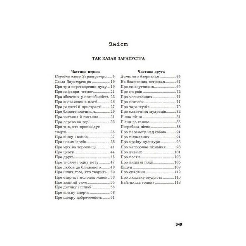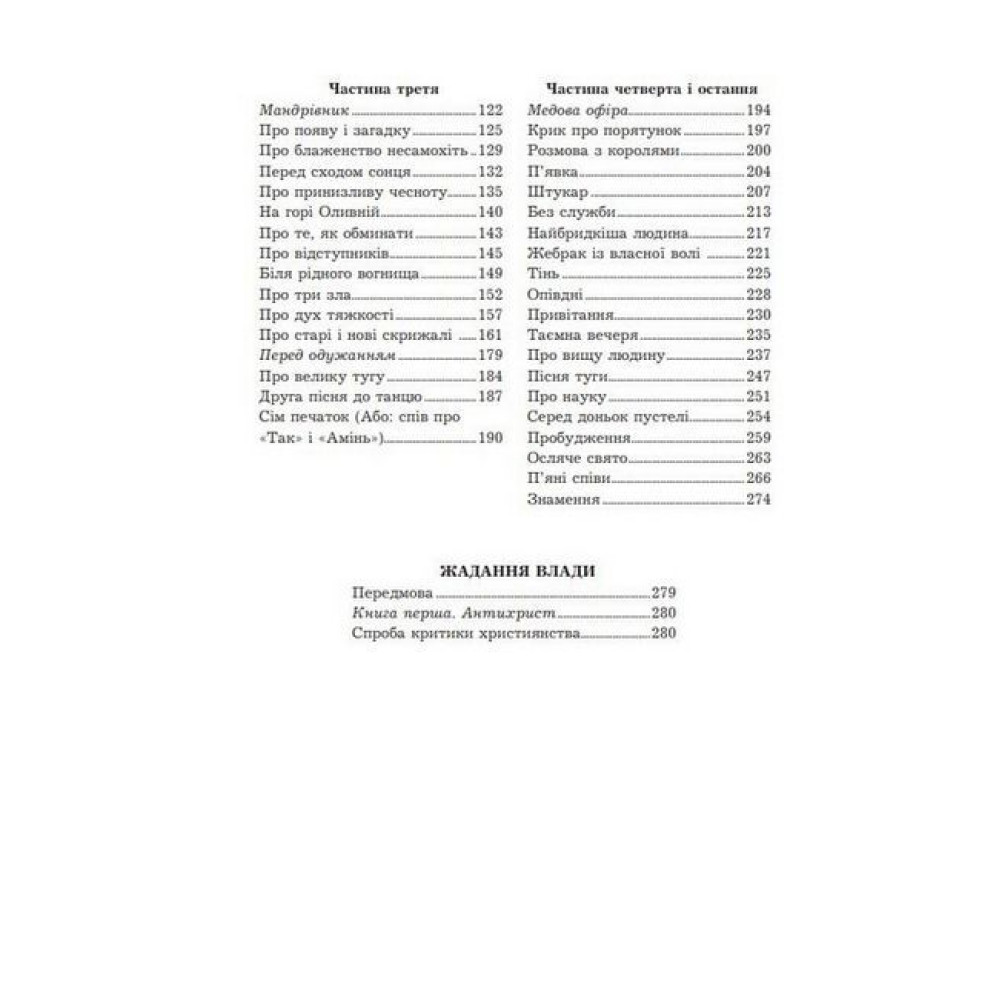 «Так казав Заратустра. Книжка для всіх і ні для кого» – це філософський роман-трактат Фрідріха Ніцше, написаний у 1883-1885 роках, зміст якого обертається навколо ідей вічного повторення, «смерті Бога» та пророцтва про надлюдину. Головний персонаж – переосмислений Ніцше пророк зороастризму Заратустра, що повертається з проповіддю до людства після тривалого усамітнення в горах.«Жадання влади» – останній твір філософа, палка апологія людини, протест проти будь-яких форм духовного рабства, зокрема релігійного. Це одна з небагатьох книг, яку можна перечитувати багато разів і навіть розібрати на цитати, вона вплинула на багатьох відомих філософів і письменників 20 століття та досі залишається актуальною.