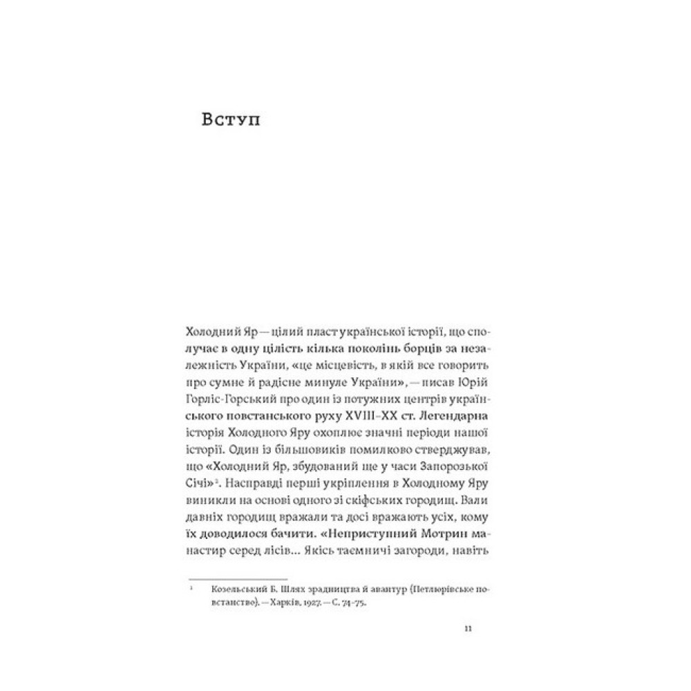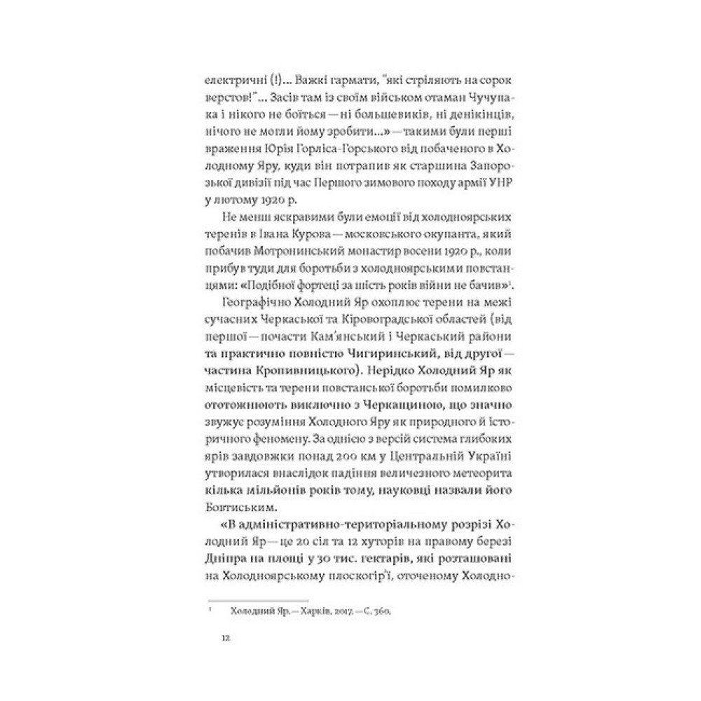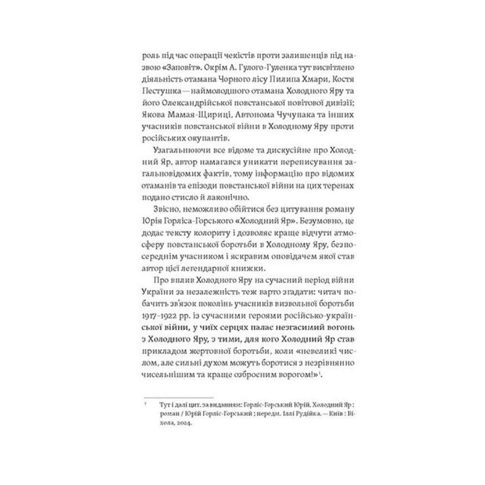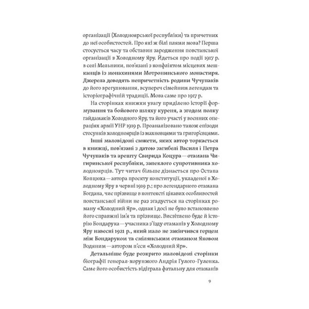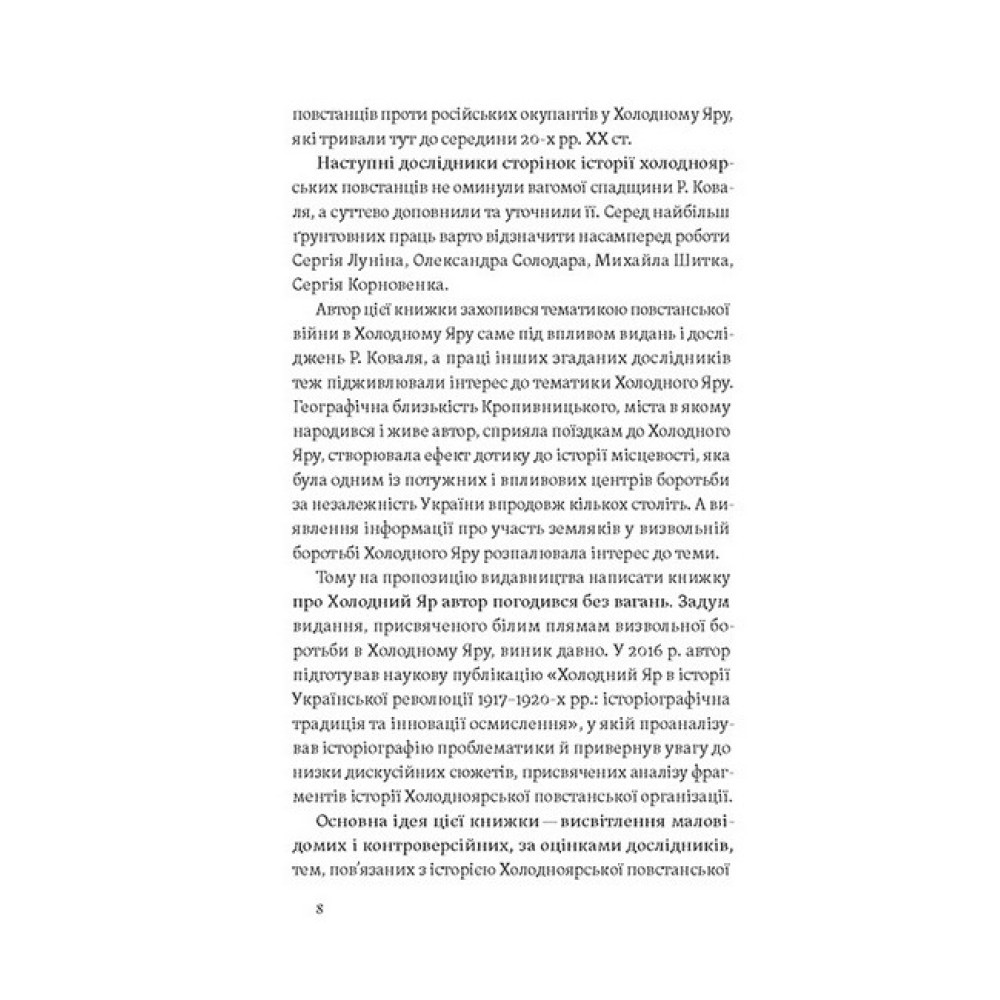 Шкільні вчителі-отамани, черниці-розвідниці, монастир, що перетворився на неприступну фортецю, власний проєкт Конституції України. Історик Юрій Митрофаненко у своїй книжці розповідає, як зародилася повстанська організація, що стала взірцевою для багатьох наступних поколінь — від членів ОУН до учасників сучасної російсько-української війни. Із чого почалася боротьба та як отаманам удалося перетворити загони самооборони на боєздатні підрозділи, що чинили опір більшовикам і денікінцям? Хто із цих отаманів на псевдо Чорний Ворон став прототипом персонажа однойменного роману Василя Шкляра? Які конфлікти завадили ватажкам Холодного Яру дійти до Києва та як отамани-залишенці потрапили в пастку радянських сексотів? І як довго тривала боротьба в Холодному Яру проти російських окупантів? Автор висвітлює маловідомі й контроверсійні теми, а також білі плями в історії Холодного Яру 1917–1922 рр.Юрій Митрофаненко — історик, доктор історичних наук та волонтер. Досліджує Українську революцію 1917–1922 рр. Автор книжок «Українська отаманщина 1918–1919 рр.» та «Сифіліс російського шовінізму. Історична есеїстика про боротьбу українців із російською окупацією».