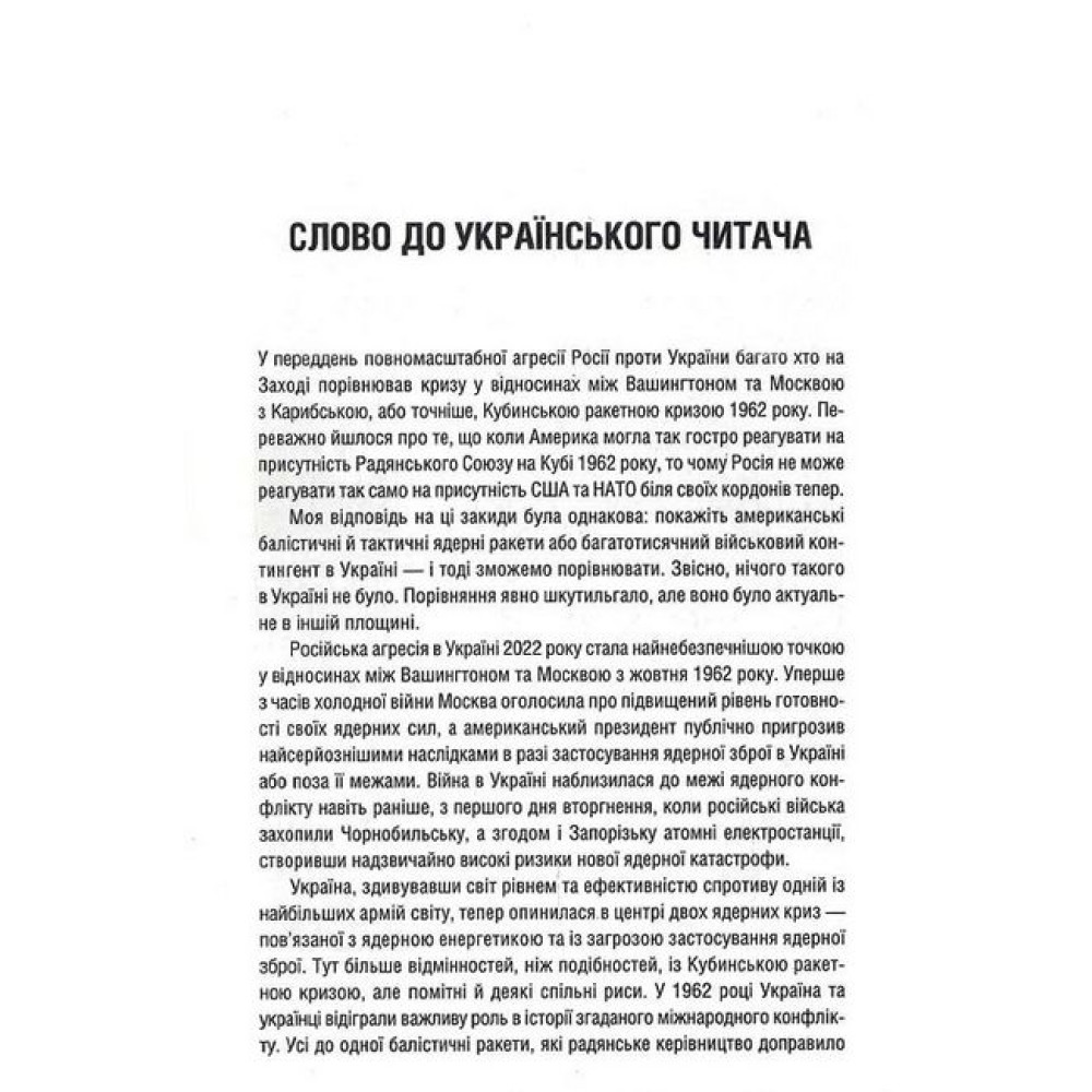 Кінець холодної війни понад 30 років тому завершив найнебезпечніший період в історії людства, відсунувши загрозу ядерної війни та катастрофи. Тоді світові держави ухвалили надважливе рішення — зменшити ядерний потенціал. Однак 2022 року дипломатичні досягнення світової безпеки були анульовані через повномасштабне російське вторгнення на територію України. РФ оголосила про підвищений рівень готовності своїх ядерних сил. У відповідь уряди США та Великої Британії публічно пригрозили, що блискавично зреагують у разі застосування ядерної зброї в Україні або поза її межами. Світ балансує на порозі нової атомної ери. Щоб зрозуміти всі можливі наслідки й запобігти глобальній катастрофі, ми маємо вивчити уроки найнебезпечнішого періоду холодної війни — Карибської кризи.