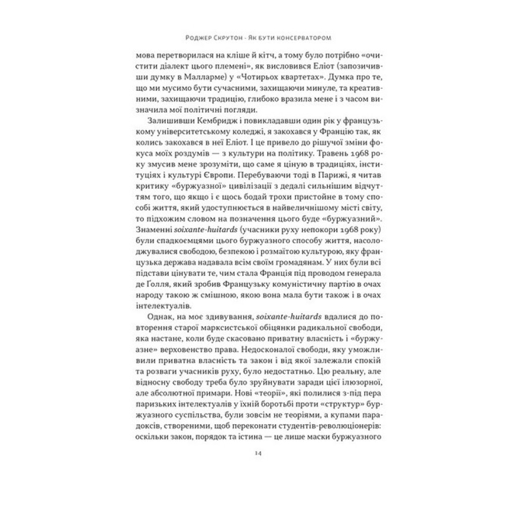 Часи кардинальних змін і фінансових криз у країнах Заходу, занепад мультикультуралізму і глобалізації, спалахи сліпої паніки у питаннях зміни клімату, деградація освітніх систем і моралі, — все це сприяє зростанню впливу популістів, радикальних течій і рухів. У книзі "Як стати консерватором" Роджер Скрутон аналізує ключові аспекти сучасної політики та культури, аби переконливо довести, чому консервативні цінності та сталі соціальні інститути пріоритетніші за швидкі ідеологічні трансформації.Підкреслюючи важливість таких структур, як сім’я, нація, держава та релігія, автор пропонує обережний і зважений підхід до їх реформування, закликає до збереження досягнень минулих поколінь, розповідає про шляхи розбудови справедливого та стабільного суспільства. Ця книга є ґрунтовним оглядовим майданчиком на головні напрями політичної філософії та основні сучасні ідеології. Вона передусім про цінності та світогляд справжнього консерватора XXI століття.Роджер Скрутон — британський філософ і письменник. Член Британської академії, член кореспондент французької Академії моральних і політичних наук. Автор понад 50 книжок із філософії, мистецтва, музики, політики, літератури, культури, сексуальності та релігії. Дописувач Times, Spectator і New Statesman.