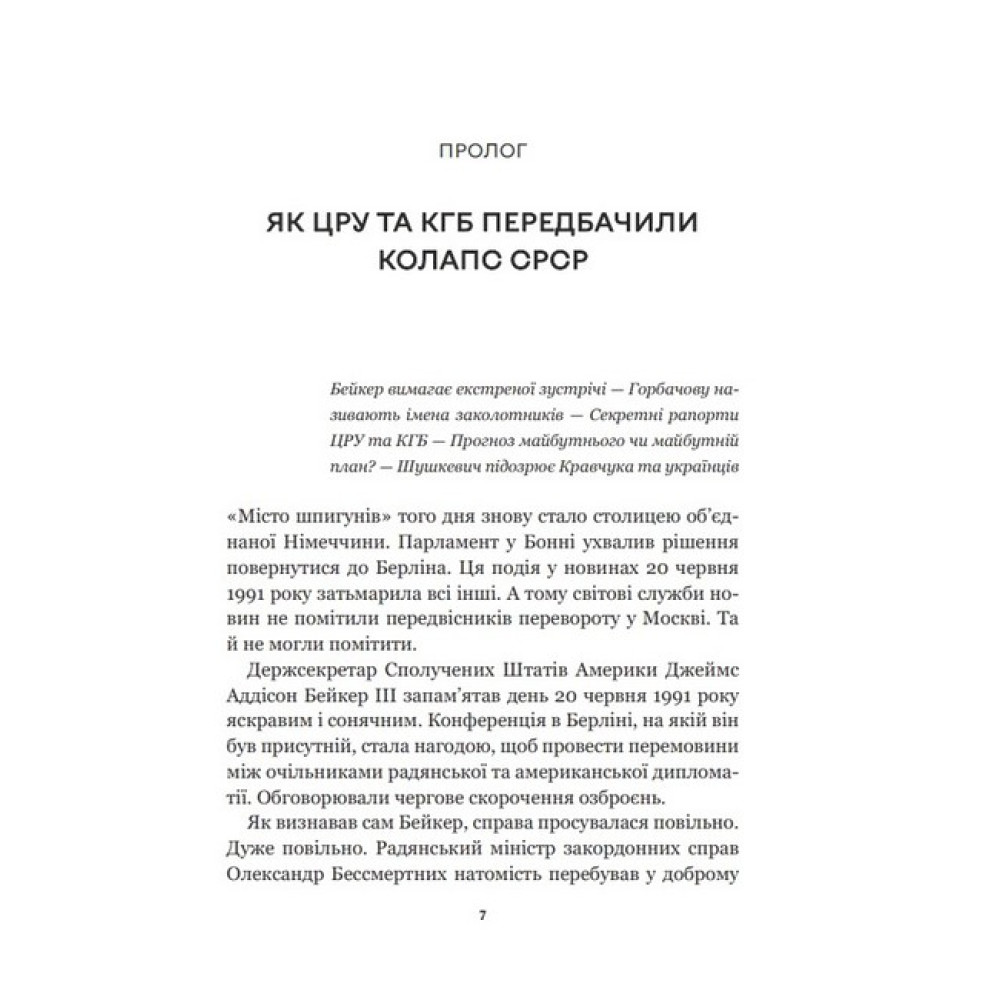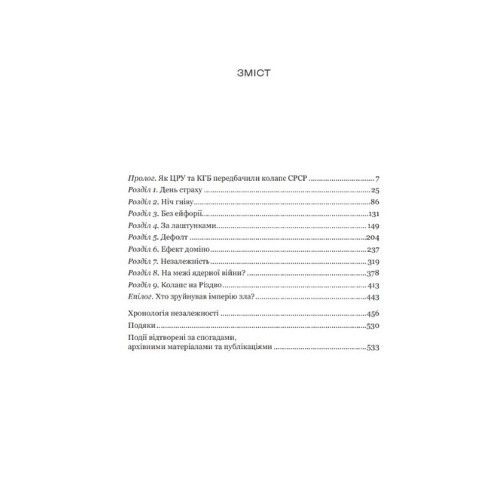 Наприкінці липня 1991 року в доповідній КГБ Голові Верховної Ради УРСР Леонідові Кравчуку повідомляли про сценарій можливого розпаду СРСР, який спрогнозували в США. Голова КГБ СРСР Володимир Крючков стверджуватиме, що ще кількома роками раніше комуністичні спецслужби відчували наближення колапсу. Що відбувалося за лаштунками Серпневого путчу, який зробив розпад СРСР швидким і незворотним? Як сталося, що із чотирьох сценаріїв розвитку подій, описаних у прогнозі ЦРУ, українці обрали найрадикальніший — «Розпад»? У цій книжці автор поденно відтворює події 1991 року. Наводить ще донедавна секретні архівні документи ЦРУ і КГБ. Уперше зіставляє спогади учасників і свідків здобуття Україною незалежності: політиків, істориків, письменників. І відповідає на запитання, хто насправді зруйнував імперію зла.
