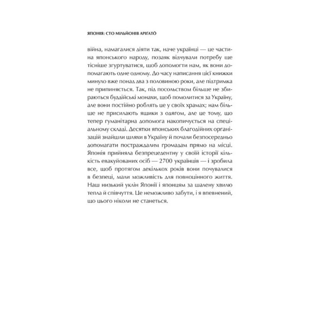 Книга «Японія: сто мільйонів аріґато» — це український нонфікшн із культурології від доктора фізико-математичних наук, заслуженого економіста України й дипломата Сергія Корсунського. Автор — Повноважний посол України в Японії, і кому як не йому розумітися на менталітеті народу країни вранішнього сонця. Доробок Корсунського не лише досліджує традиції, політичний устрій та соціальні проблеми острівної держави. Ця книга також про те, як впливова нація проголосила, що обирає бік добра. З початку повномасштабного вторгнення глобальний лідер забезпечив підтримку Україні та став нашим союзником, надавши допомогу збройним силам і прихистивши понад декілька тисяч біженців.