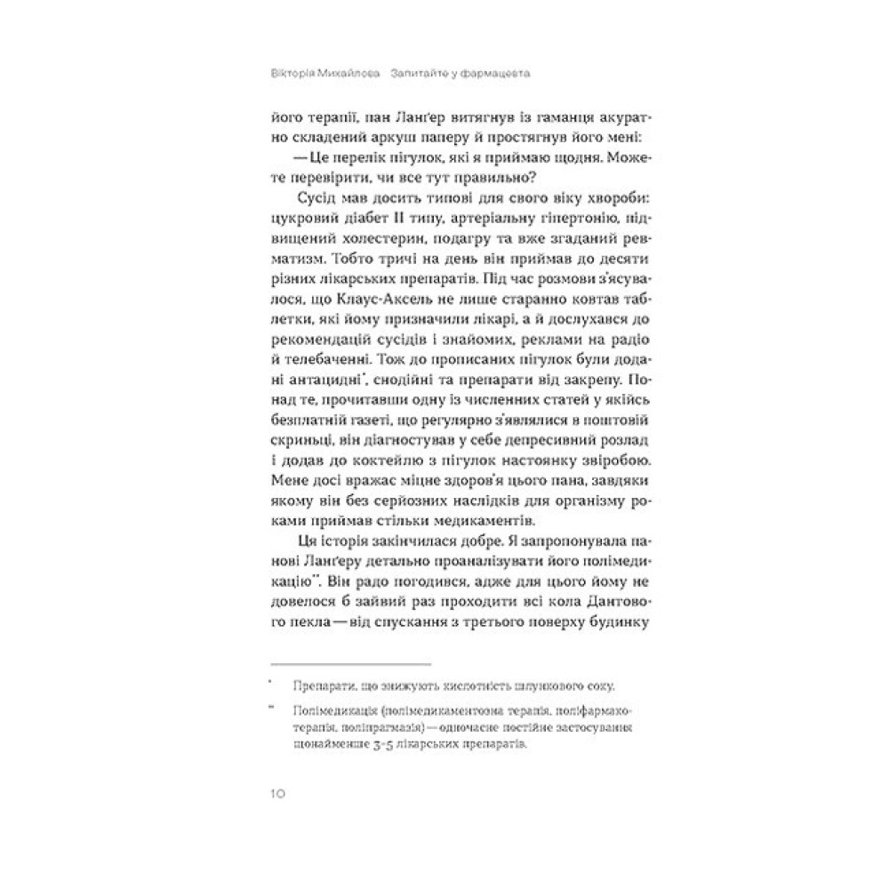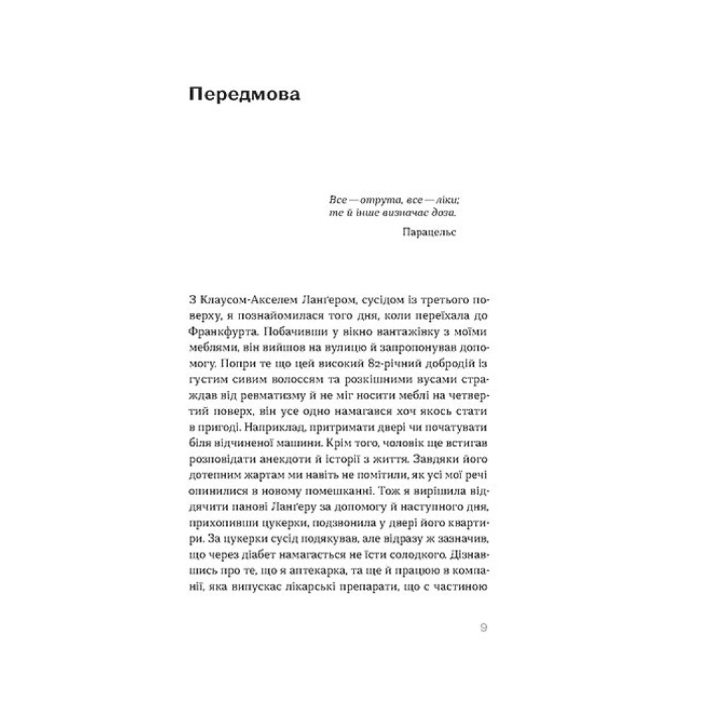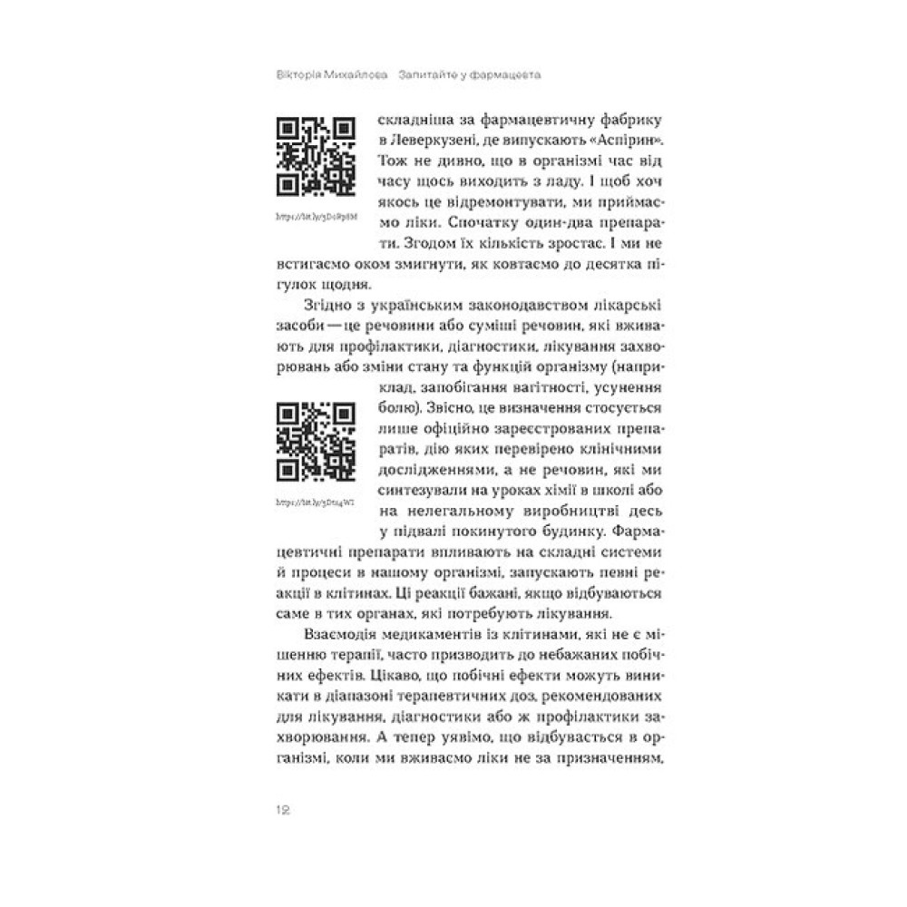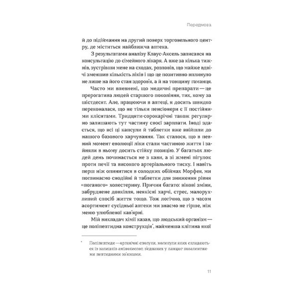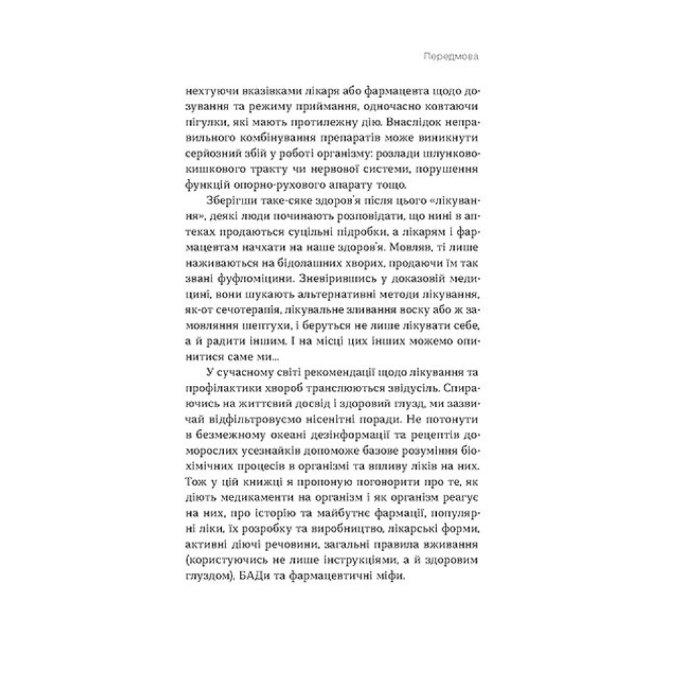 «Це перелік пігулок, які я приймаю щодня. Можете перевірити, чи все тут правильно?» Такі питання не рідкість, це доволі звична фраза, яку регулярно чують фармацевти в аптеках. Капсули й таблетки стали звичною частиною нашого життя, і в багатьох день починається далеко не з кави, а зі жмені пігулок. Чи хороша ідея займатися самолікуванням? Звісно, ні. Але точно варто розуміти, що відбувається з організмом, коли йому пропонують чергову таблетку від головного болю, скажімо. У цій книжці фармацевтка Вікторія Михайлова розповідає про те, як діють медикаменти на наш організм і як організм реагує на них, що означають всі ці фрази на кшталт «приймати натщесерце» та «за 30 хвилин до їди». Вона говорить про історію і майбутнє фармації, популярні ліки та їх виробництво, фармацевтичні міфи й особливості прийому ліків в умовах надзвичайних ситуацій.