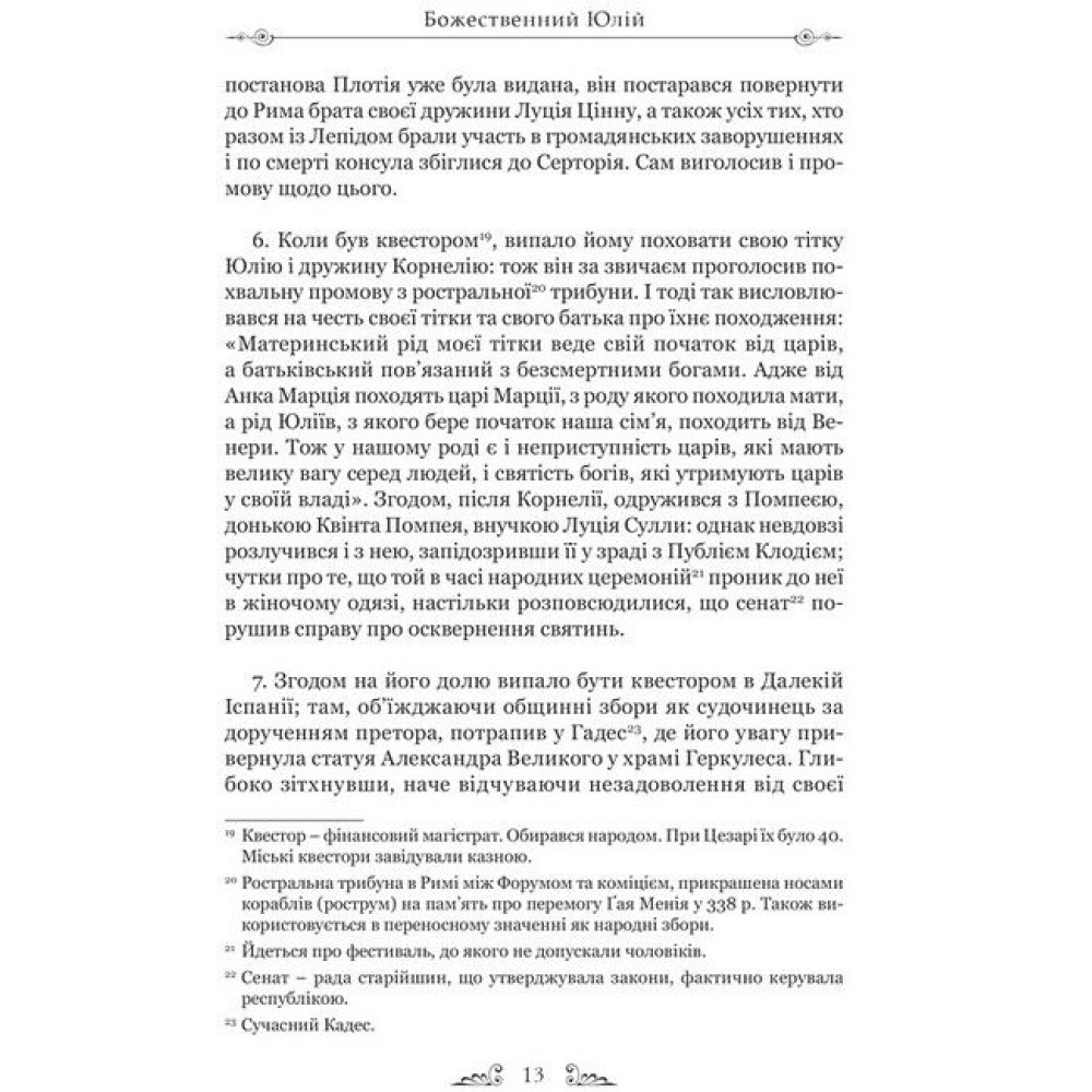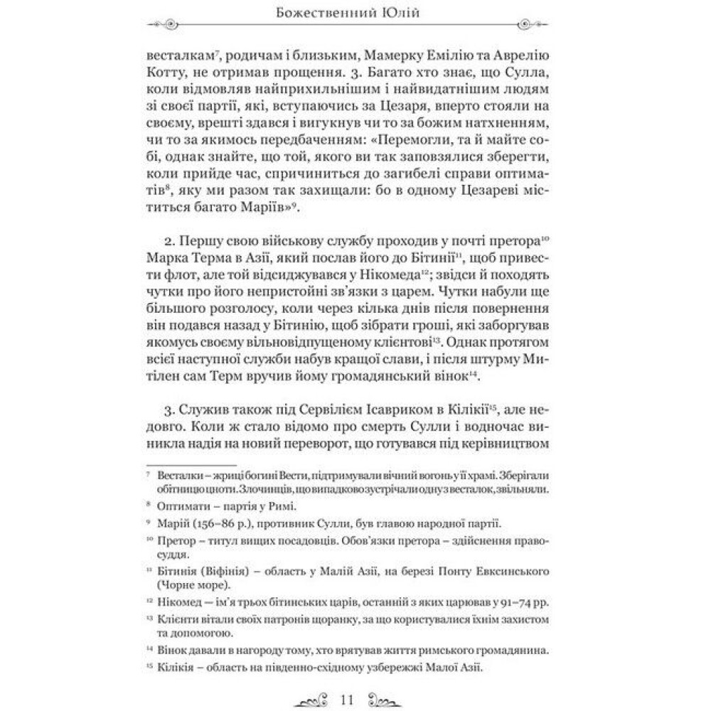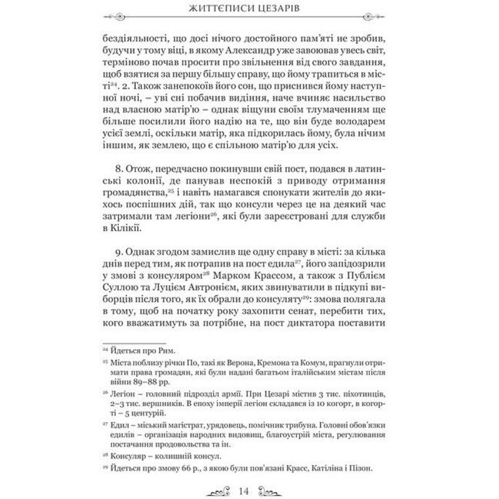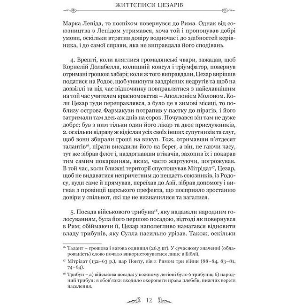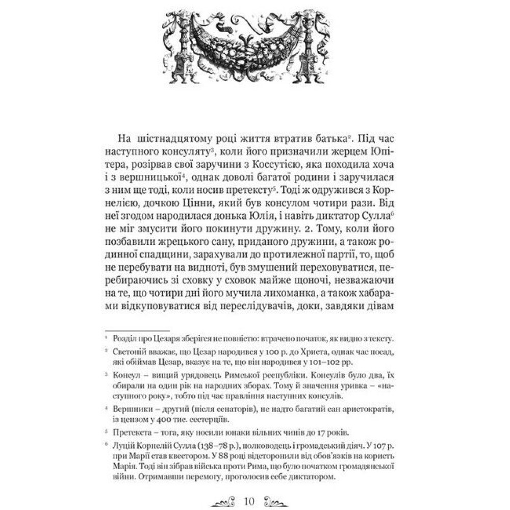 У книзі відомого римського історика Ґая Светонія подано життєписи римських цезарів. Поряд із прикладами мужності, відваги та чесності читач стане свідком неймовірної жорстокості, розпусти, свавілля та жадібності; це, як не дивно, поєднувалося з високими моральними якостями як в окремих особах, так і в римській культурі загалом. Цей давній твір, писаний на початку ІІ ст., багато в чому відображає й сучасний світ політичних перипетій та закулісних інтриг: давній Рим був наче прототипом сучасного світу, в якому поряд із мужністю, хоробрістю та чесністю існують ницість, підступність та зухвалість. Цікаво спостерігати за тим, як Влада протягом дуже короткого часу змінює характер та вдачу людей, неймовірно сильних духом. Залишитися стійкими до її спокус, не зловживати своєю посадою, могли тільки нечисленні.
