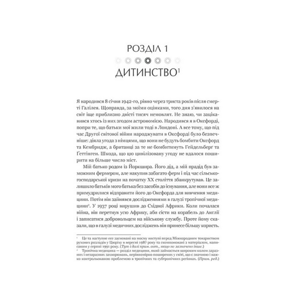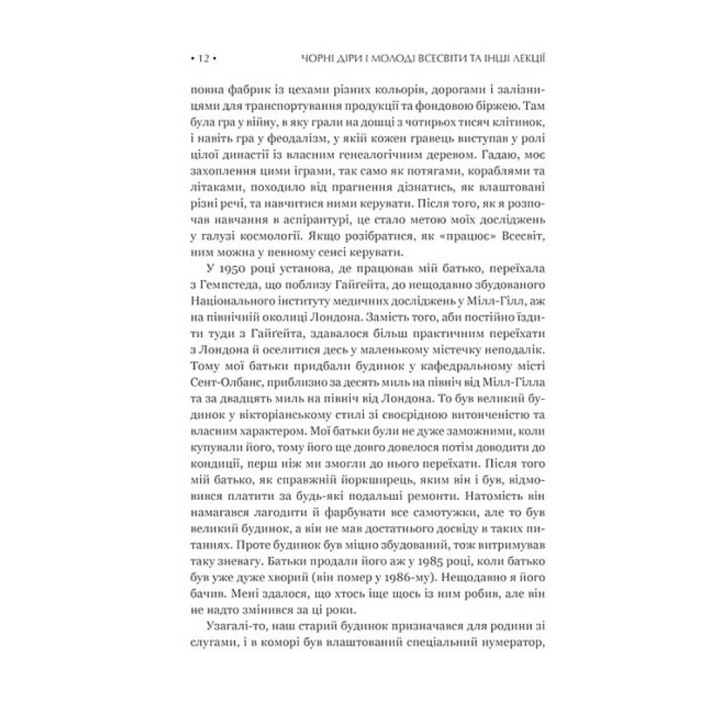 13 дивовижних оповідей про таємниці Всесвіту Перед вами збірка наукових нарисів 1976-1992 років. Уперше лекцію під назвою «Чорні діри і молоді всесвіти» науковець прочитав у Каліфорнійському університеті в Берклі. Згодом доповнена лекція стала частиною повноцінної збірки, до якої ввійшли 13 оповідей та розгорнуте інтерв’ю науковця для передачі «Диски безлюдного острова». Книжка є своєрідним продовженням діалогу з читачем, розпочатого ще у «Короткій історії часу». Найвідоміший астрофізик сучасності тлумачить найбільш імовірні моделі устрою Всесвіту, розмірковує про уявний час, про те, як чорні діри можуть дати життя молодим усесвітам, про теоретичну фізику і продовжує розпочаті ще Альбертом Ейнштейном спроби науковців визначити майбутнє Всесвіту.