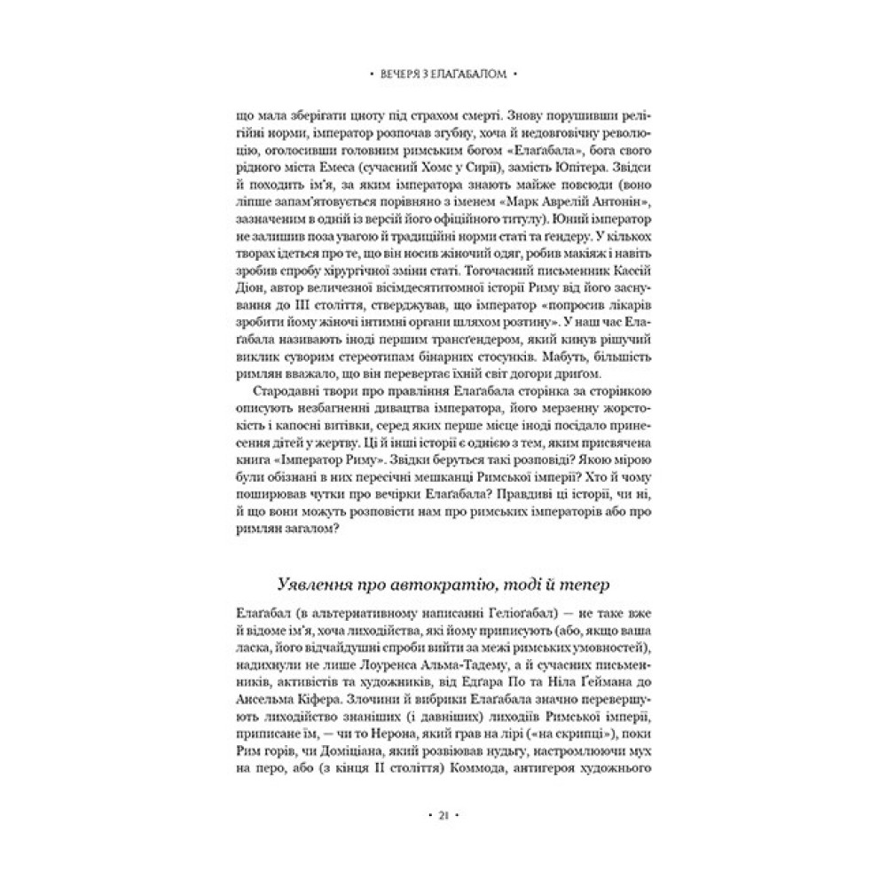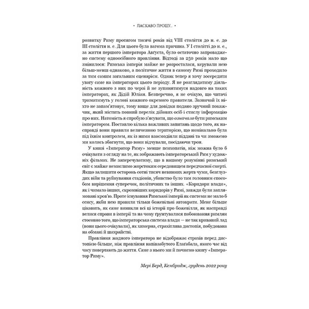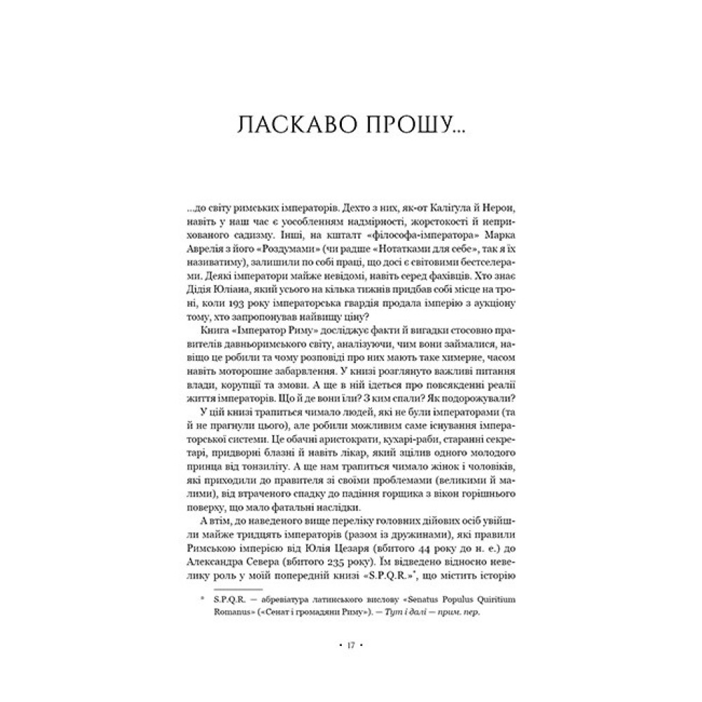 Марі Берд знайомить нас із дружинами і коханками імператорів, суперниками та рабами, придворними блазнями й солдатами, а також звичайними людьми, які бачили в правителях могутніх і мудрих ставлеників богів. Завдяки таланту оповідати в деталях і кольорах, авторка книги «Імператор Риму» яскраво змальовує давнього римлянина в його найбагатшому, найрозкішнішому, найекстремальнішому, наймогутнішому та найсмертоноснішому вигляді, пропонуючи історію Риму такою, якою вона ніколи раніше не була представлена.