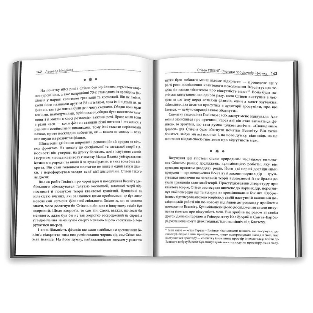 У своїй новій книзі відомий американський фізик-теоретик і популяризатор науки Леонард Млодінов згадує про спільну роботу з видатним британським ученим нашого часу Стівеном Гокінґом (1942-2018). Читач познайомиться з науковим і особистим життям Гокінґа, в тому числі тим, як видатний учений десятиліттями долав недугу, від якої міг померти ще в молодому віці, але попри це вижив і зробив неоціненний внесок у теоретичну фізику, запропонував революційні ідеї в сфері космології. Автор у популярній формі намагається пояснити деякі таємниці походження Всесвіту, особливості чорних дір і значення цих та інших ідей для наших уявлень про світ, в якому ми живемо. Викладення науково-популярних ідей сучасної теоретичної фізики та космології перемежовуються із зарисовками з діяльності Стівена Гокінґа, який попри важку форму інвалідності зумів прожити цікаве та яскраве життя, пізнав кохання, досяг тріумфу і зазнав розчарувань. Для широкого кола читачів, які цікавляться сучасною наукою.