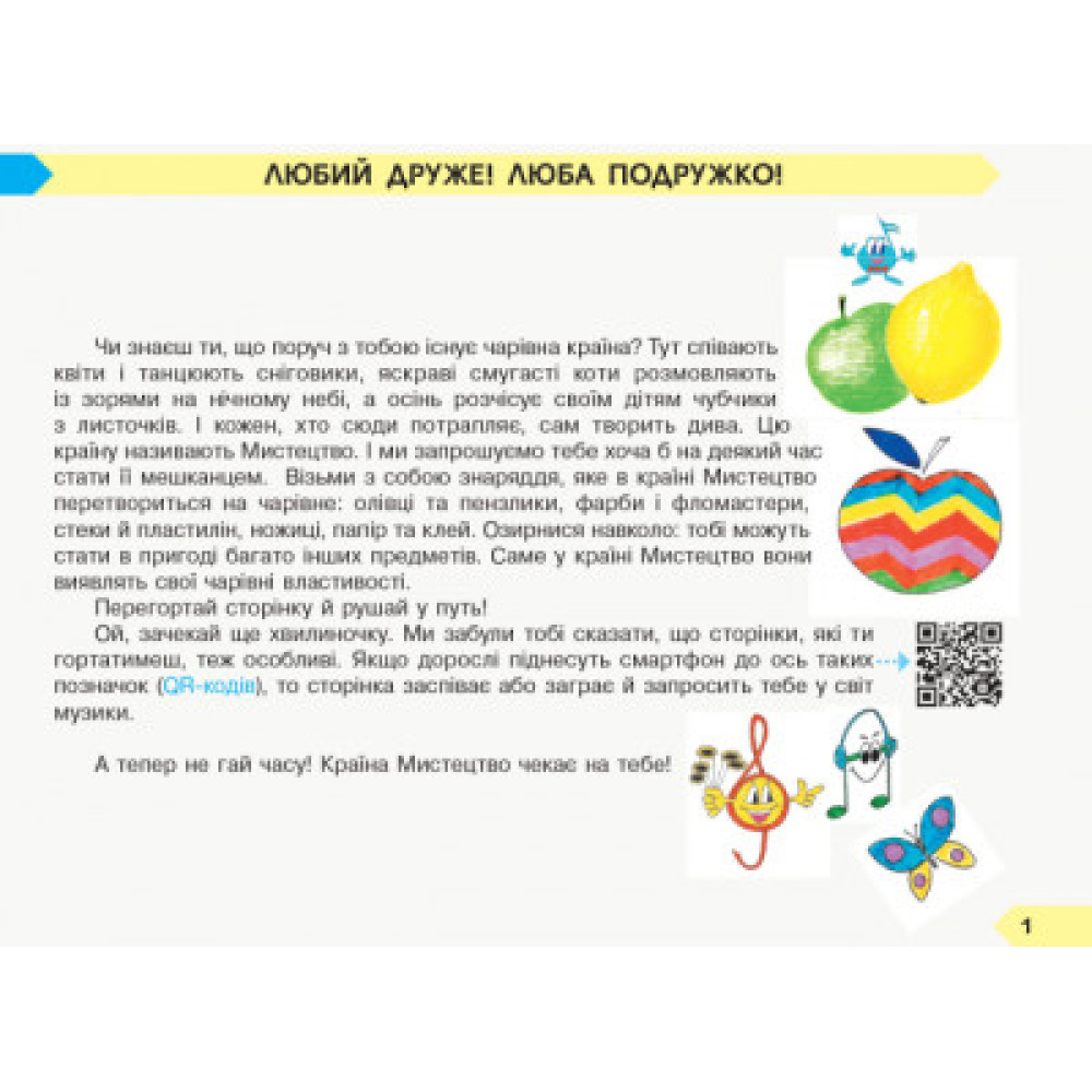 Посібник створено відповідно до Державного стандарту початкової освіти та Типової освітньої програми, розробленої під керівництвом О. Я. Савченко. Альбом є складовою навчально-методичного комплекту інтегрованого курсу «Мистецтво. 1 клас».Матеріал посібника спрямований на закріплення знань, умінь, навичок здобувачів освіти. Альбом містить різнорівневі завдання, вправи, які допоможуть першокласникам набути мистецьких знань та умінь, необхідних для їхнього саморозвитку та самоствердження. QR-коди, розташовані на сторінках посібника, допоможуть швидко перейти до електронного додатка, де містяться допоміжні матеріали: репродукції творів образотворчого мистецтва, музичні ілюстрації тощо.Призначений для учнів 1 класу закладів загальної середньої освіти, учителів початкової школи.