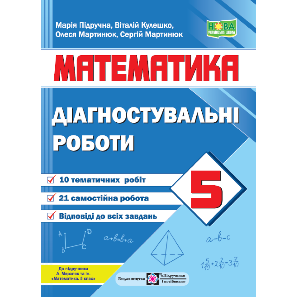 Посібник призначений для діагностування навчальних досягнень учнів 5 класу закладів загальної середньої освіти й містить 10 тематичних діагностувальних і 21 самостійну діагностувальну роботу, які охоплюють усі теми курсу математики 5 класу. Він відповідає модельній навчальній програмі «Математика. 5–6 клас» (авт. : А. Г. Мерзляк та ін.) й підручнику «Математика. 5 клас» (авт. : А. Г. Мерзляк та ін.).