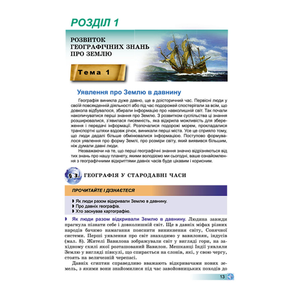 Підручник "Географія" складено за новою програмою з географії для 6-х класів загальноосвітніх навчальних закладів. Він містить повний обсяг обов'язкового навчального матеріалу, передбаченого чинною програмою. Підручник яскраво ілюстрований, містить багато картосхем, діаграм, графіків, довідкових даних, а також словник географічних термінів і понять.