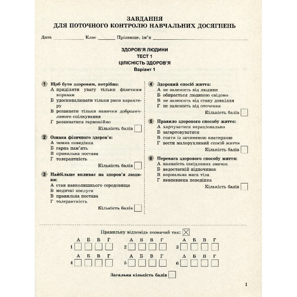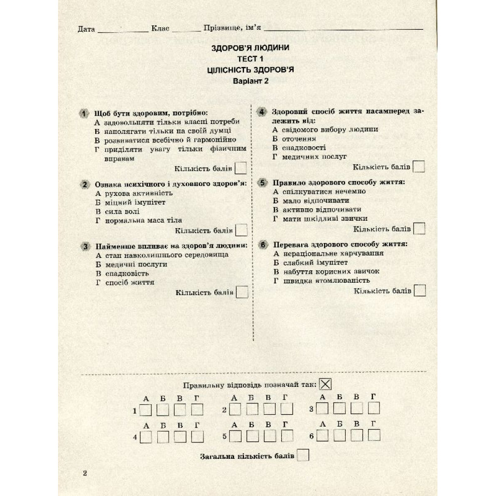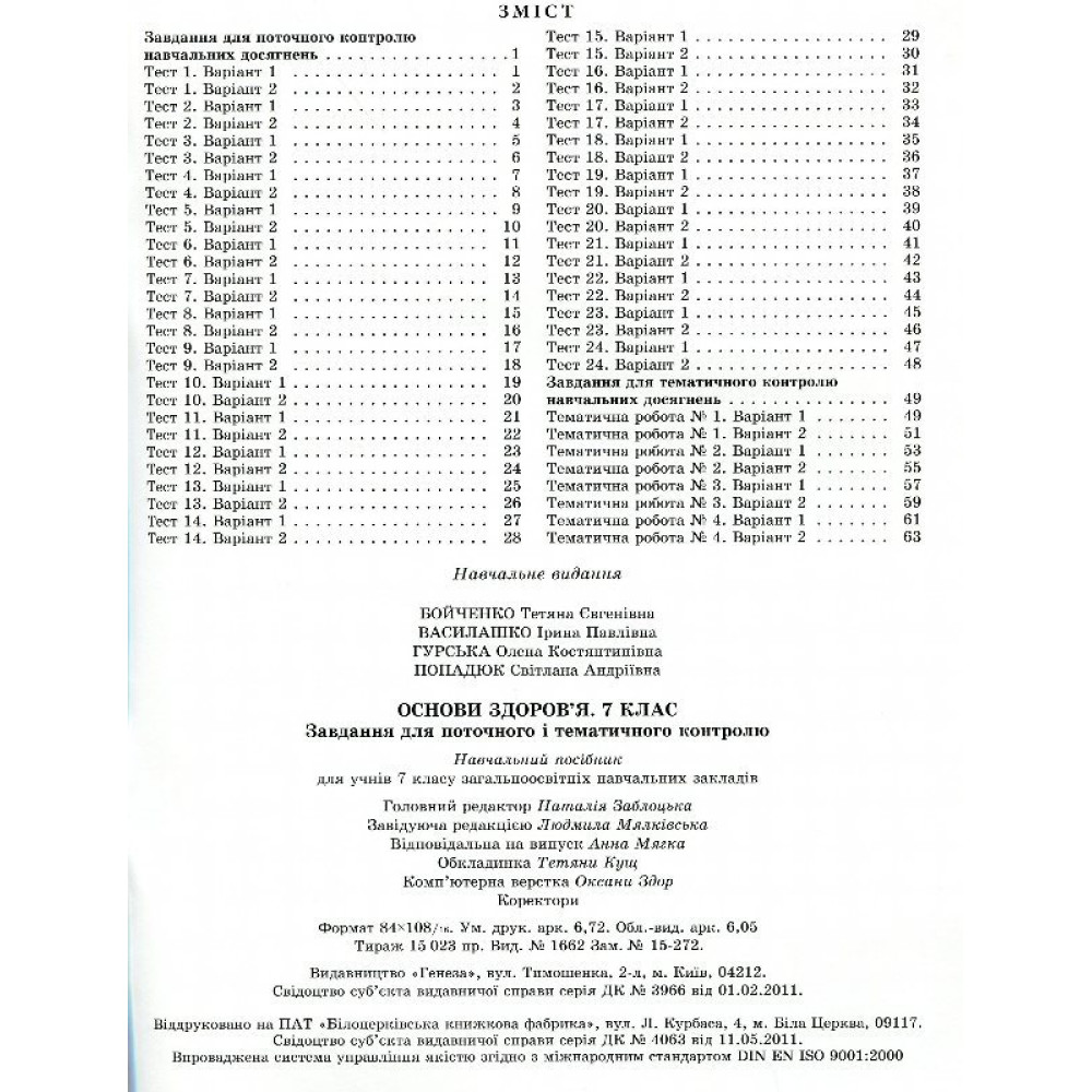 Навчальний посібник створено відповідно до програми з основ здоров’я для 7 класу загальноосвітніх навчальних закладів. Різноманітні завдання різного рівня складності, уміщені в посібнику, допоможуть учителеві швидко перевірити рівень знань учнів за темами програми й підручника 7 класу. Схвалено для використання в загальноосвітніх навчальних закладах комісією з основ здоров'я Науково-методичної ради з питань освіти Міністерства освіти і науки України.