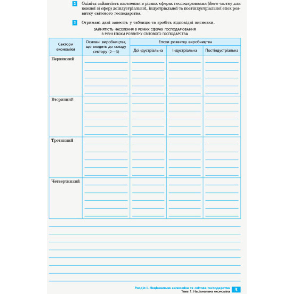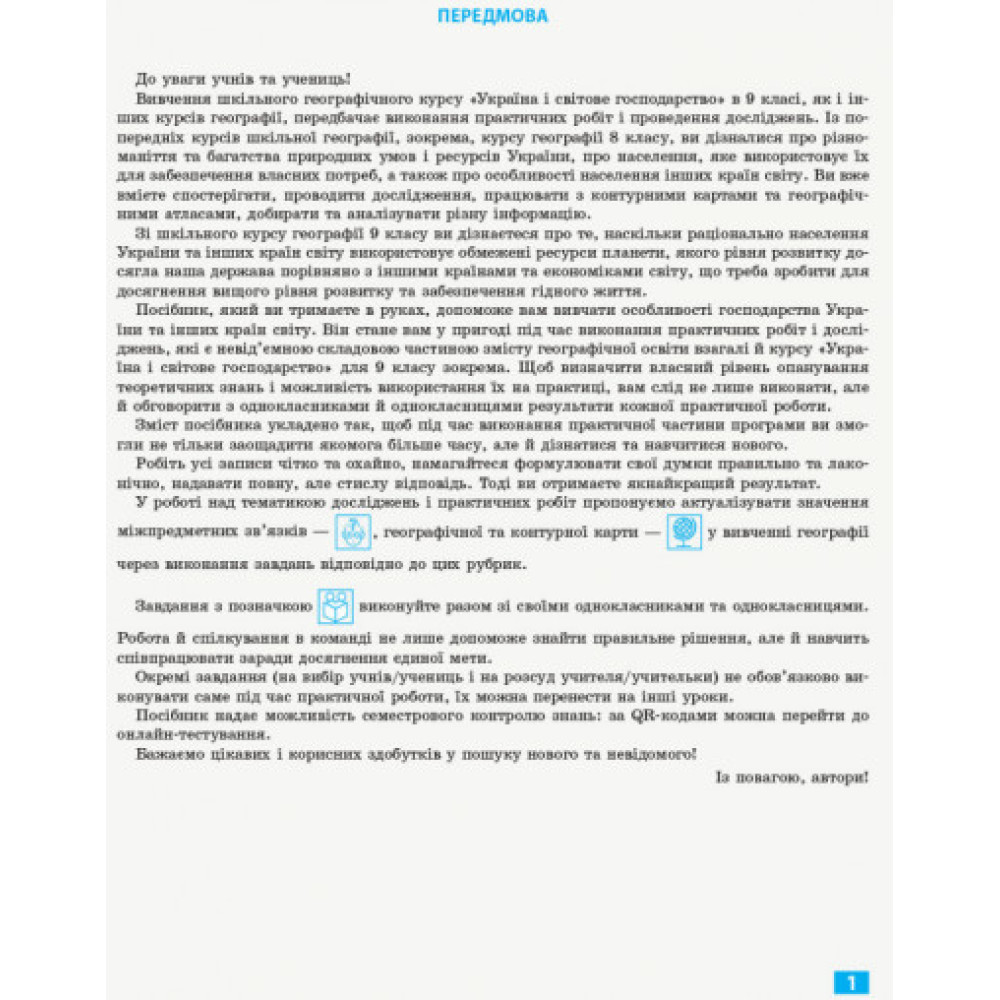 Посібник спрямований на посилення практико-орієнтованого навчання географії на основі компетентнісного підходу відповідно до чинної навчальної програми з предмета. Зошит орієнтує учнів та учениць на засвоєння знань, формування навчальних умінь і навичок, набуття практичного досвіду в процесі вивчення географії.Посібник містить усі практичні роботи з курсу «Географія: Україна і світове господарство», алгоритми виконання досліджень, а також усі необхідні контурні карти.Посібник надає можливість онлайн-тестування.Призначений для учнів та учениць 9-х класів закладів загальної середньої освіти і вчителів/вчительок географії.