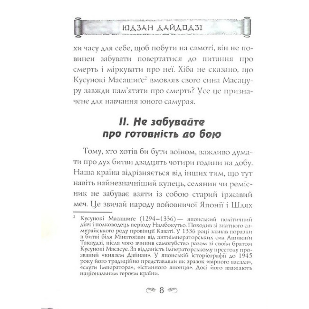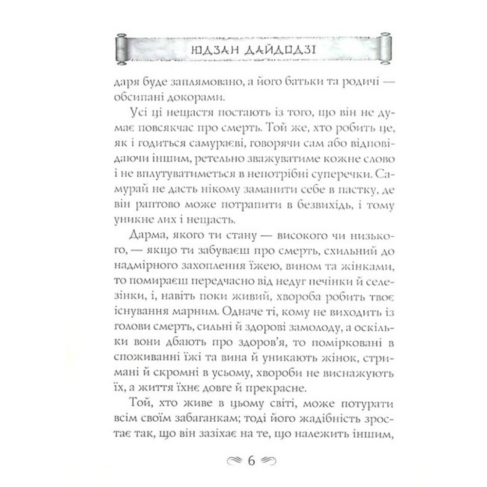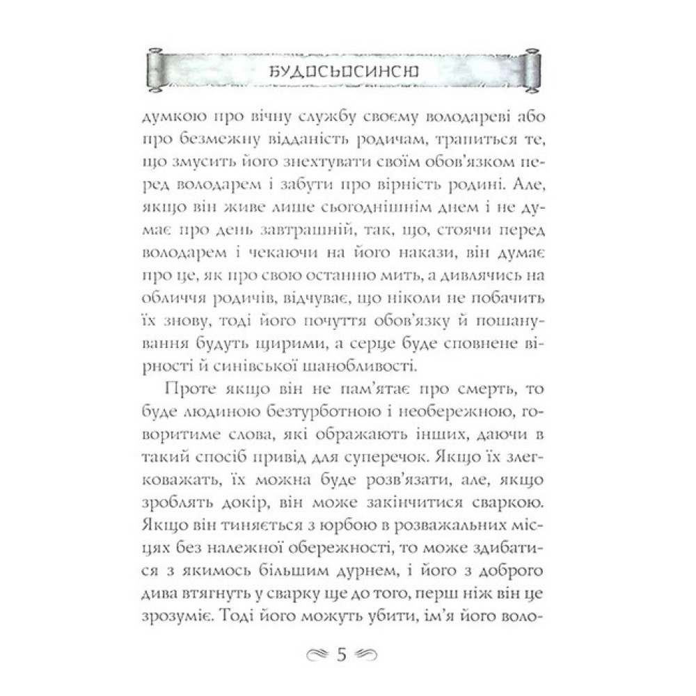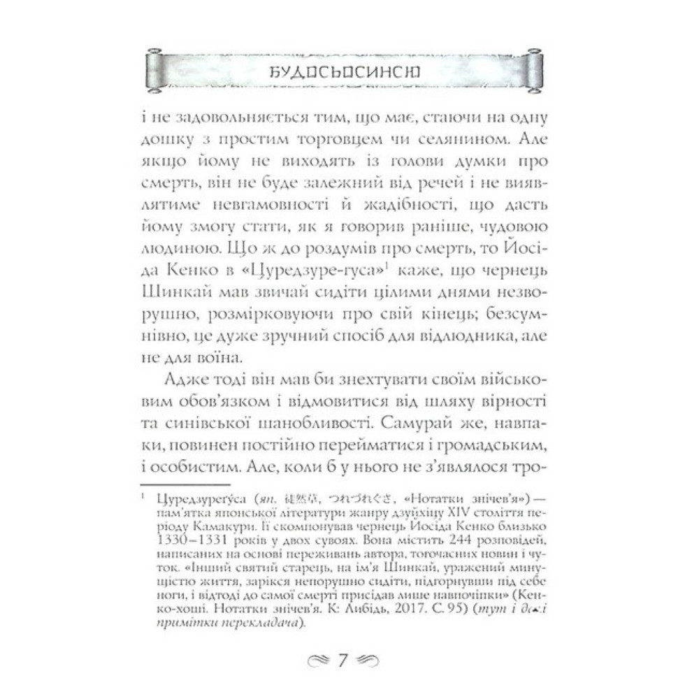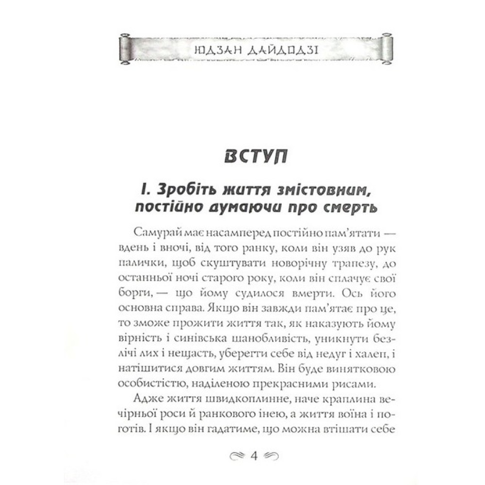 До цієї книги ввійшли філософські трактати двох великих мислителів, присвячених бусидо — Шляху воїна. Так у стародавній Японії називали зведення правил і настанов, що визначали поведінку та повсякденне життя самураїв. Класичне розуміння цього морального кодексу честі викладено в повчаннях «Будосьосинсю» («Напутнє слово тому, хто стає на Шлях воїна») спадкового самурая та державного діяча Юдзана Дайдодзі (1639–1730). Унікальна книга «Бусидо. Душа Японії» японського просвітника Інадзо Нітобе (1862–1933) — найповніший і найзрозуміліший опис військового мистецтва, яке зародилося в Японії, а також пояснення основних принципів традиційної японської моралі й етики, виховання та формування японського національного характеру та світогляду. Ці принципи та моральний кодекс самурая актуальні й тепер, адже ідеали честі, гідності, вірності, відваги та патріотизму високо цінують у будь-якому суспільстві та в будь-який час. Пропоновані трактати неодмінно стануть духовними супутниками всіх, хто шукає відповіді на найважливіші питання у військовому та мирному житті.