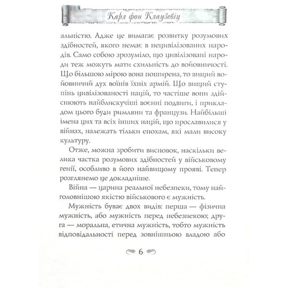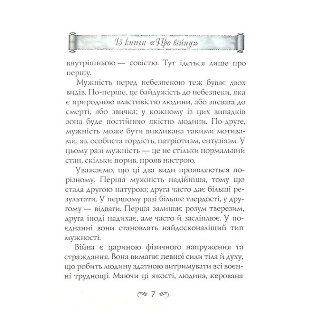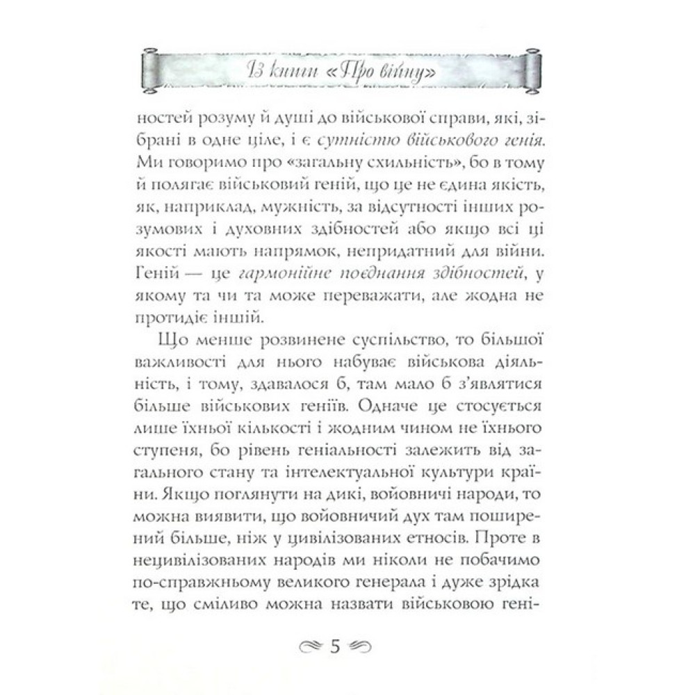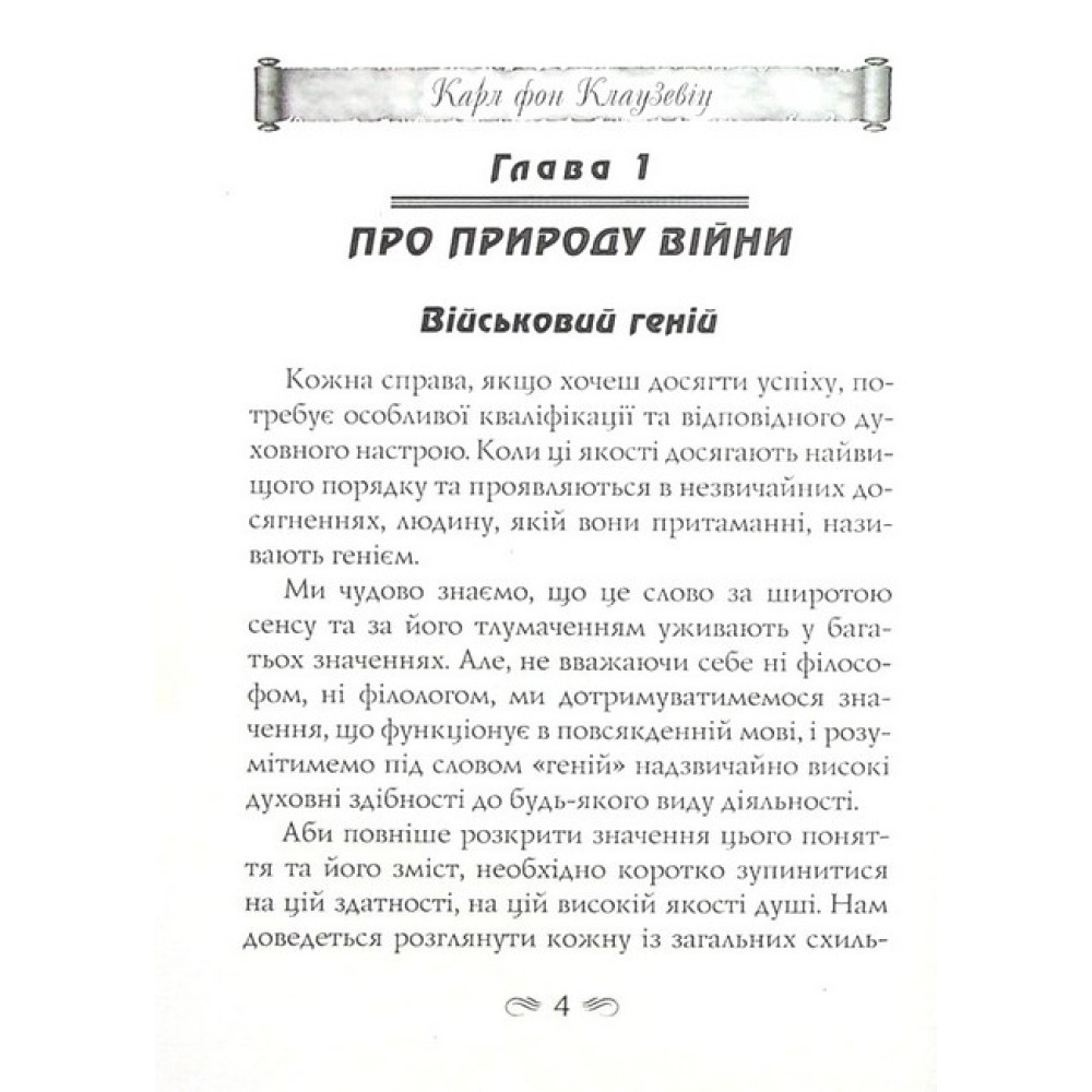 У цїй книзі автор докладно розглядає природу війни, наголошуючи на вирішальній ролі військового генія в результаті битви. Чітко викладаючи важливість планування війни, взаємозв’язок війни та політики, стратегію і тактику ведення війни, зокрема організацію бою, види та способи наступу й оборони, Клаузевіц визначає та розкриває базові принципи ведення війни, що надає його книзі характеру чудового довідкового посібника. Оцінюючи моральні чинники ведення війни, автор акцентує увагу на необхідності таких якостей, як мужність, відвага та самопожертва, а також на важливості армійського кодексу честі, бойового духу та громадської думки. Пропонована книга стане в пригоді і як джерело воєнної мудрості, і як практичний посібник із тактики та стратегії воєнних дій.
