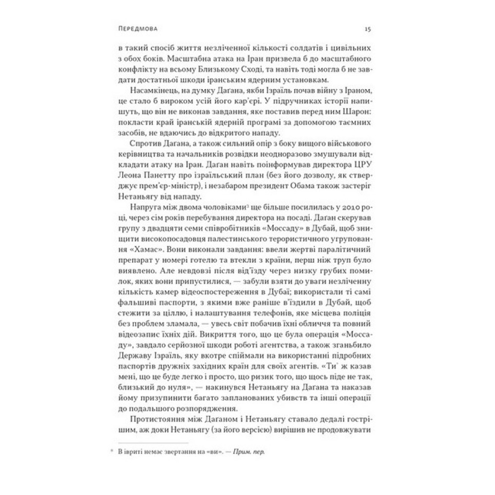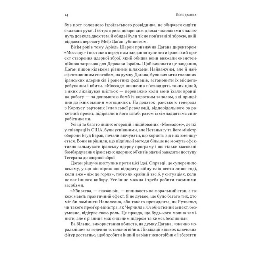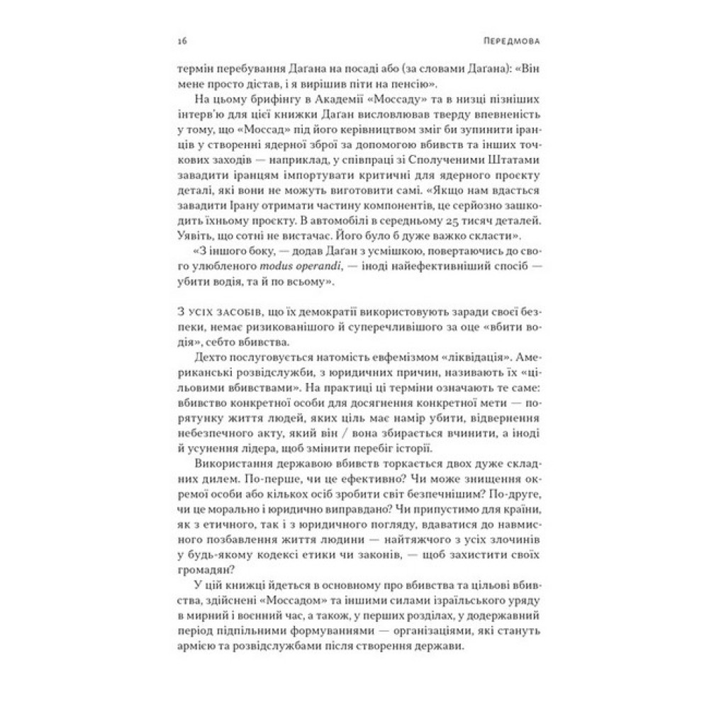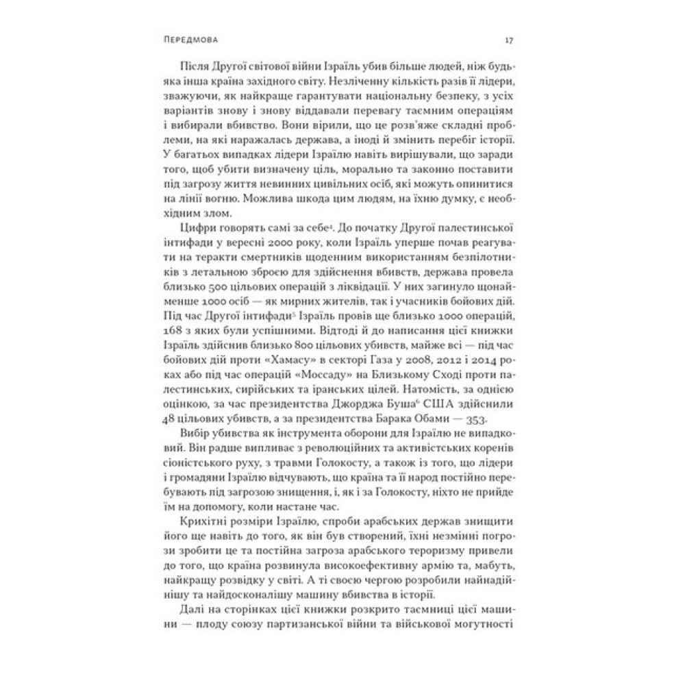 У цій захопливій книжці розкриваються секретні місії з ліквідацій ворогів Ізраїлю. Від лідерів «Хамасу» і «Хезболли» до стратега Організації визволення Палестини, від сирійського генерала до канадського інженера — зібрана тут історія чисельних цільових убивств доводить: вороги Ізраїлю можуть забути про спокій. І не важливо, де вони ховаються: «Шин-Бет», «Моссад», ЦАХАЛ та інші сили вистежать і ліквідують їх у Бейруті, Дамаску, Тегерані, Дубаю, Римі, Парижі чи Лондоні. Через успіхи та скандальні невдачі, крізь моральні дилеми, які стоять перед державою в умовах постійної загрози, книжка пояснює філософію «убий першим», що стала важливим складником державної політики Ізраїлю. Ронен Берґман зумів взяти інтерв’ю й отримати свідчення прем’єр-міністрів та багатьох інших впливових членів уряду, військових і розвідувальних служб країни. Іронія в тому, що всемогутній «Моссад» доклав чимало зусиль до того, щоб ця книжка не з’явилась на світ. На щастя, саме ця «операція» «Моссаду» виявилась невдалою. Книжка все ж вийшла, і в ній цікаво все, включно з примітками. ПРО АВТОРА Ронен Берґман — постійний кореспондент із військових і розвідувальних питань Yedioth Ahronoth, найбільшої щоденної платної газети Ізраїлю, а також позаштатний кореспондент журналу New York Times, де він пише про розвідку, національну безпеку, тероризм і ядерні проблеми. Берґман — автор п’яти документальних бестселерів на івриті.