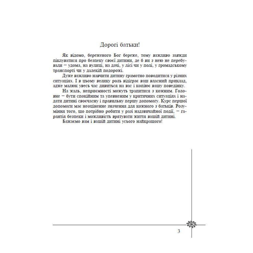 Курс першої допомоги має неоціненне значення для кожного з батьків. Не завжди є можливість негайно звернутися до лікаря у надзвичайній ситуації, і ваше завдання полягає у тому, щоб змогти самим надати своєчасну та грамотну допомогу дитині. З цієї книги ви дізнаєтеся, які небезпеки підстерігають дитину вдома, на вулиці, на дачі, у лісі та у полі, у громадському транспорті й у далекій мандрівці, як їх уникнути й упоратися з наслідками. У книзі доступно подано всю необхідну інформацію про те, як надати першу допомогу дитині у разі відсутності дихання та зупинки серця, при опіках, отруєннях, забитих місцях і переломах, а також при укусах тварин, змій та комах. Головне – у складній ситуації бути спокійним та впевненим, адже від цього може залежати життя вашої дитини.