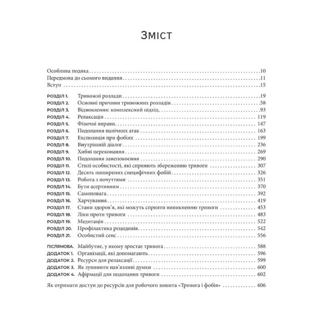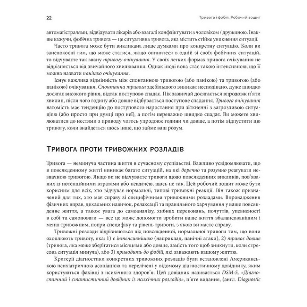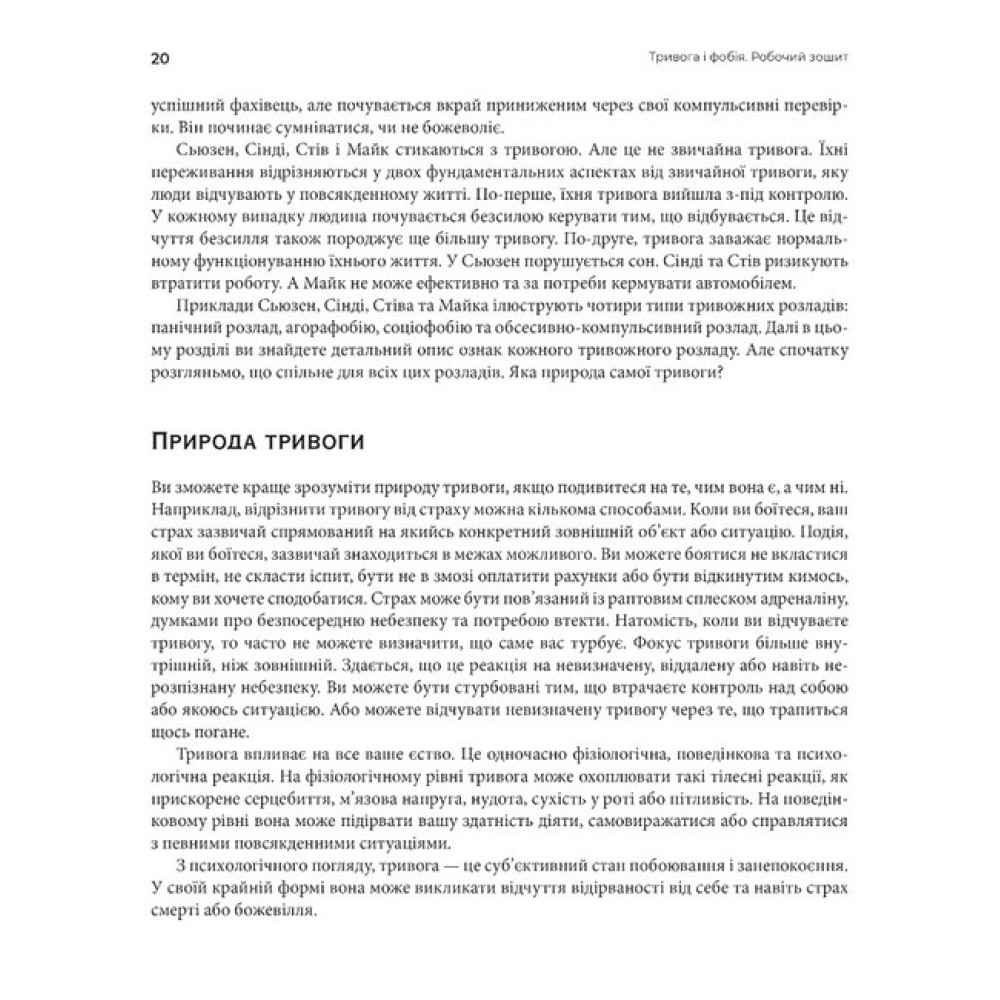 Повністю перероблений і оновлений, посібник «Тривога і фобія. Робочий зошит» за авторством Едмунда Дж. Борна, що заснований на фактичних даних, містить найефективніші методи аналізу й лікування тривоги, останні клінічні дослідження та повний арсенал навичок, які допоможуть угамувати страхи й взяти тривожні думки під контроль.Ви також отримаєте нову інформацію щодо профілактики рецидивів після успішного лікування. ліків, похідних канабісу, кетаміну. харчування. нових досліджень у галузі експозиційної терапії та багато іншого. Якщо ви шукаєте комплексний ресурс, який допоможе впоратися з тривогою, це нове видання робочого зошита дасть вам усе необхідне, щоб почати жити вільніше, ніж ви могли собі уявити.У цьому робочому зошиті ви знайдете:Техніки релаксації та диханняНавички запобігання панічним атакам та подолання їхПеревірені стратегії подолання негативного внутрішнього діалогу й хибних переконаньНові дослідження про експозиційну терапію фобійНеобхідні зміни в харчуванні та способі життяТривога, панічний розлад або фобії можуть змусити вас відчувати, що ви не контролюєте своє життя. Тож як взяти під контроль свої страхи до того, як вони візьмуть над вами гору?Вже сьоме видання робочого зошита «Тривога і фобія» Едмунда Борна допомогло понад мільйону читачів досягти значного й тривалого одужання від генералізованого тривожного розладу, соціальної тривоги, специфічних фобій, панічних атак, обсесивно-компульсивного розладу й інших проблем, пов’язаних із тривожністю.Книга буде цікава не лише фахівцям — психологам, психотерапевтам, а й усім, хто страждає від тривоги чи фобій. Вона надає новітні рішення для лікування, які дозволяють подолати страхи, що заважають жити осмисленим і щасливим життям. Цей робочий зошит можна використовувати як окремо, так і в поєднанні з терапією.Едмунд Дж. Борн — доктор філософії, який вже понад два десятиліття спеціалізується на лікуванні тривоги, фобій та інших розладів, пов'язаних зі стресом. Його книгами із самодопомоги, перекладеними багатьма мовами, скористалися понад мільйон людей.