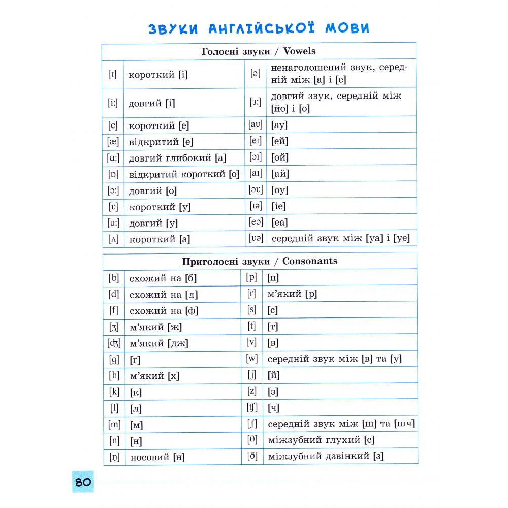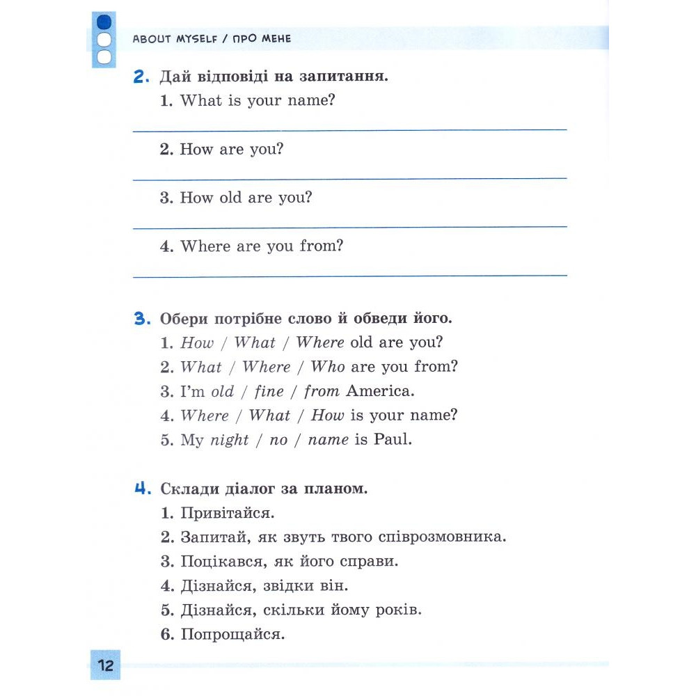 Посібник з англійської мови створено відповідно до чинної програми з іноземної мови МОН України для початкової школи. За його допомогою дитина вдосконалить навички усного англійського мовлення, розширить свій словниковий запас, потренується вживати нову лексику та закріпить деякі граматичні правила. Практичні вправи трьох рівнів складності допоможуть ефективно засвоїти вивчений матеріал, а творчі завдання — поглибити здобуті знання.
