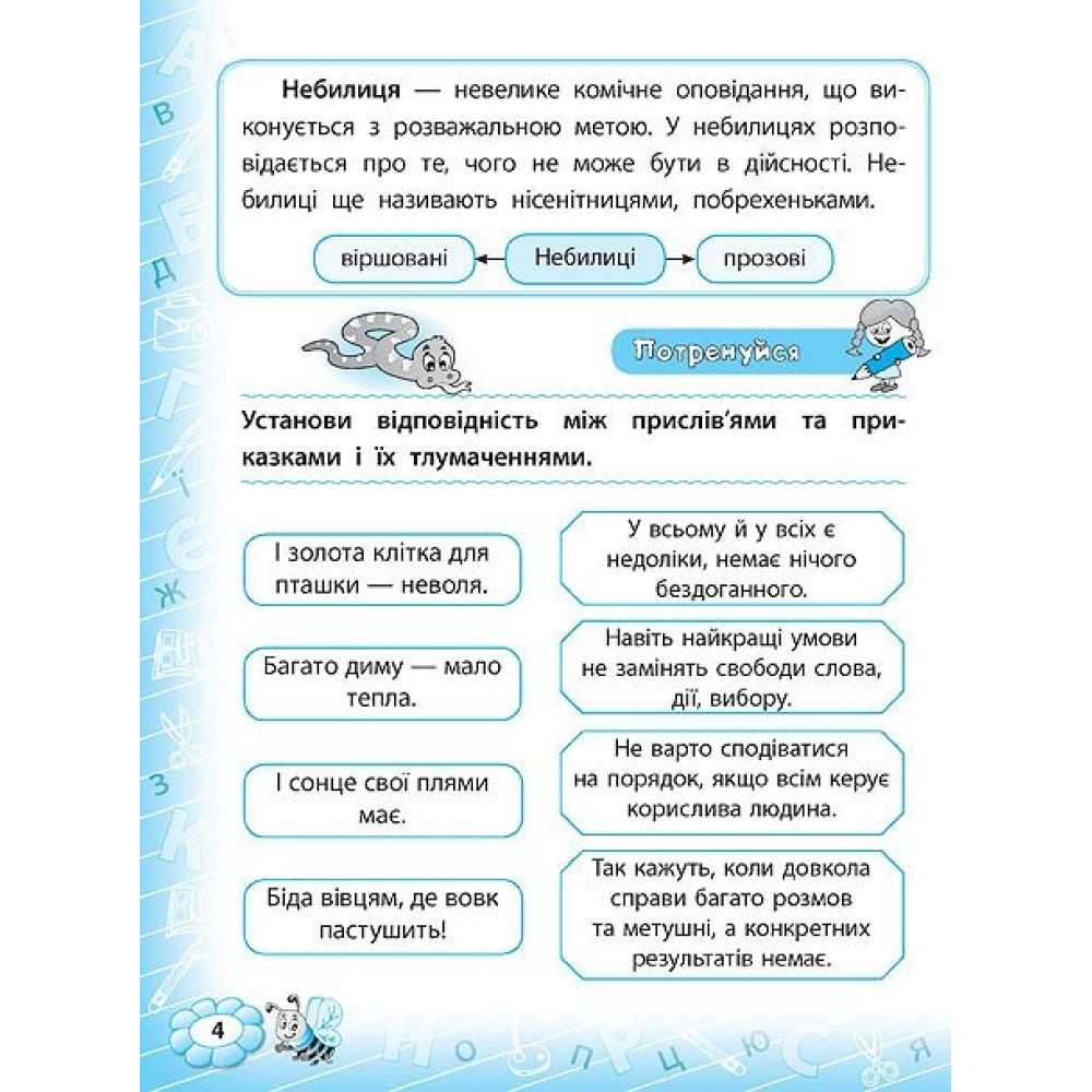 Тренажер з читання допоможе учням 4 класу покращити навички швидкого та виразного читання, повторити вивчені літературознавчі терміни та поширити словниковий запас. Тексти для читання дібрані таким чином, щоб дитина не лише тренувала мовлення, але й отримувала нові знання та розвивалася. Усі правила та визначення подані в схемах, що унаочнює процес навчання.