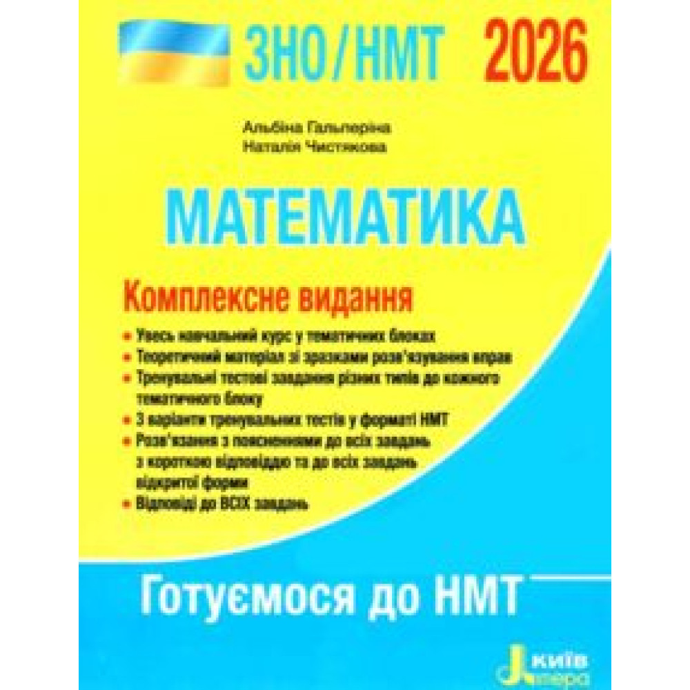 ЗНО НМТ 2026 Математика. Комплексне видання : Гальперіна А., Чистякова Н. Видавництво Літера. купити Пропонований посібник вважається актуальним для підготовки до складання ЗНО та НМТ у 2026 році. Математика є одним із предметів, тестування з якого є обов'язковим у межах національного мультипредметного тесту (НМТ). Пропонований посібник створено на основі чинної програми зовнішнього незалежного оцінювання і призначений для підготовки майбутніх учасників тестування до математичної частини цього тесту. Видання, автор Гальперіна А. і Чистякова Н., складається з тематичних розділів "Алгебра і початки аналізу", "Геометрія", а також містить тренувальні тести у форматі НМТ і відповіді до всіх завдань. До кожного параграфу посібника подано...